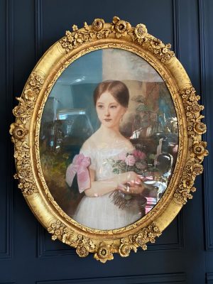 Grand Pastel D’une Jeune Fille Du XIXe Dans Son Cadre D’époque En Bois Doré