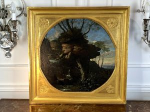 Huile Sur Toile Représentant Une Sanguine aux putti Du XIXe Dans Un beau Cadre En Bois Doré