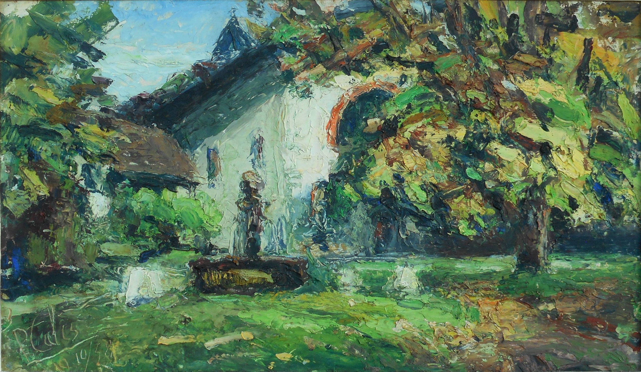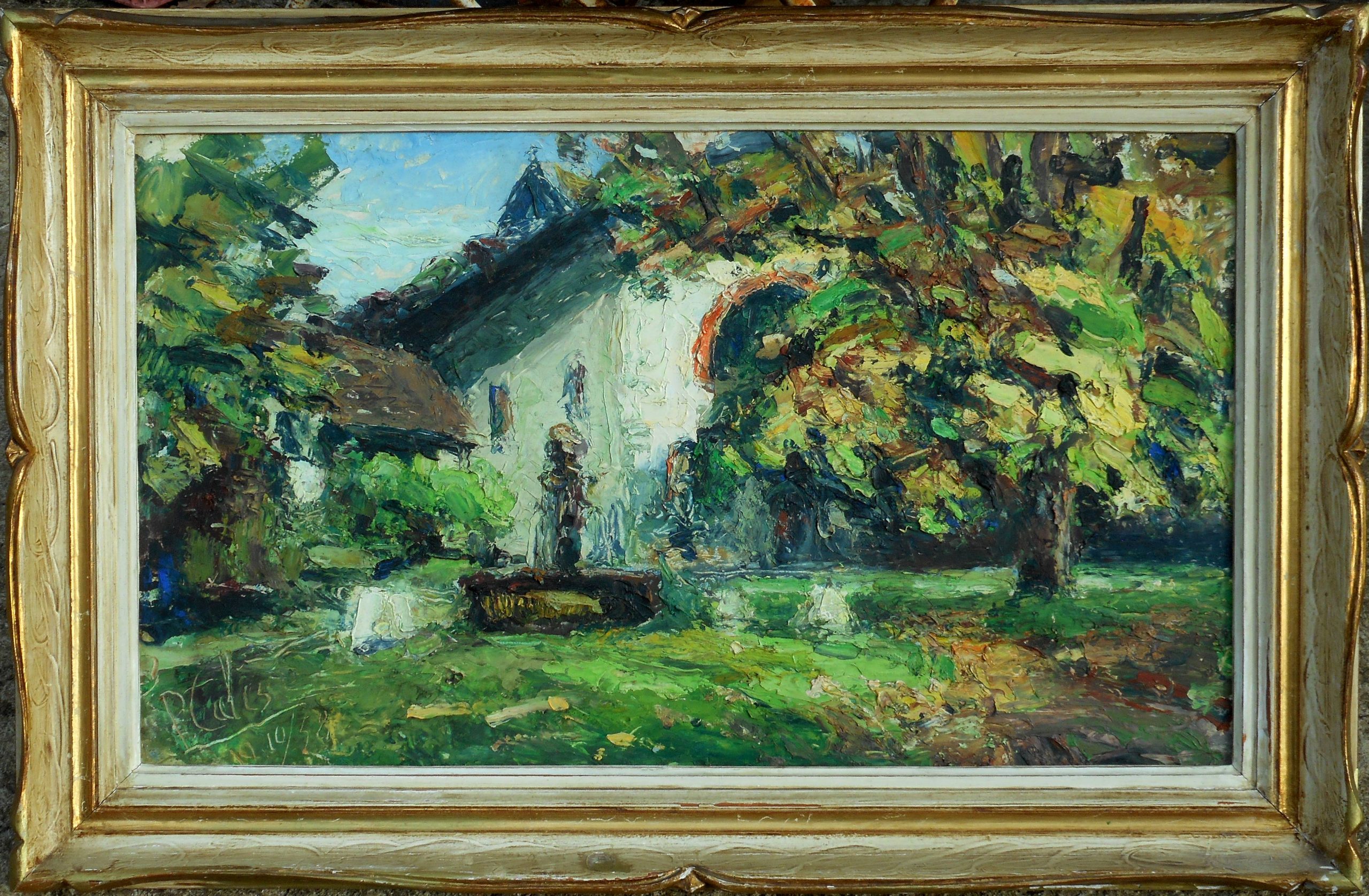Superbe huile sur panneau bois 46 x 78 cm ( 61 x 93 cm encadrée) signée PIERRE CALES ( 1870-1961) et datée octobre 1958 « fontaine de TENCIN – Isère »