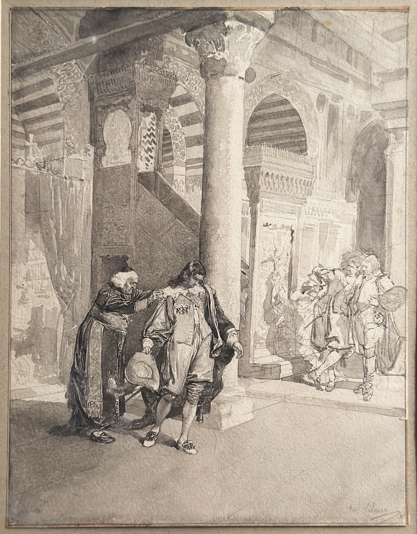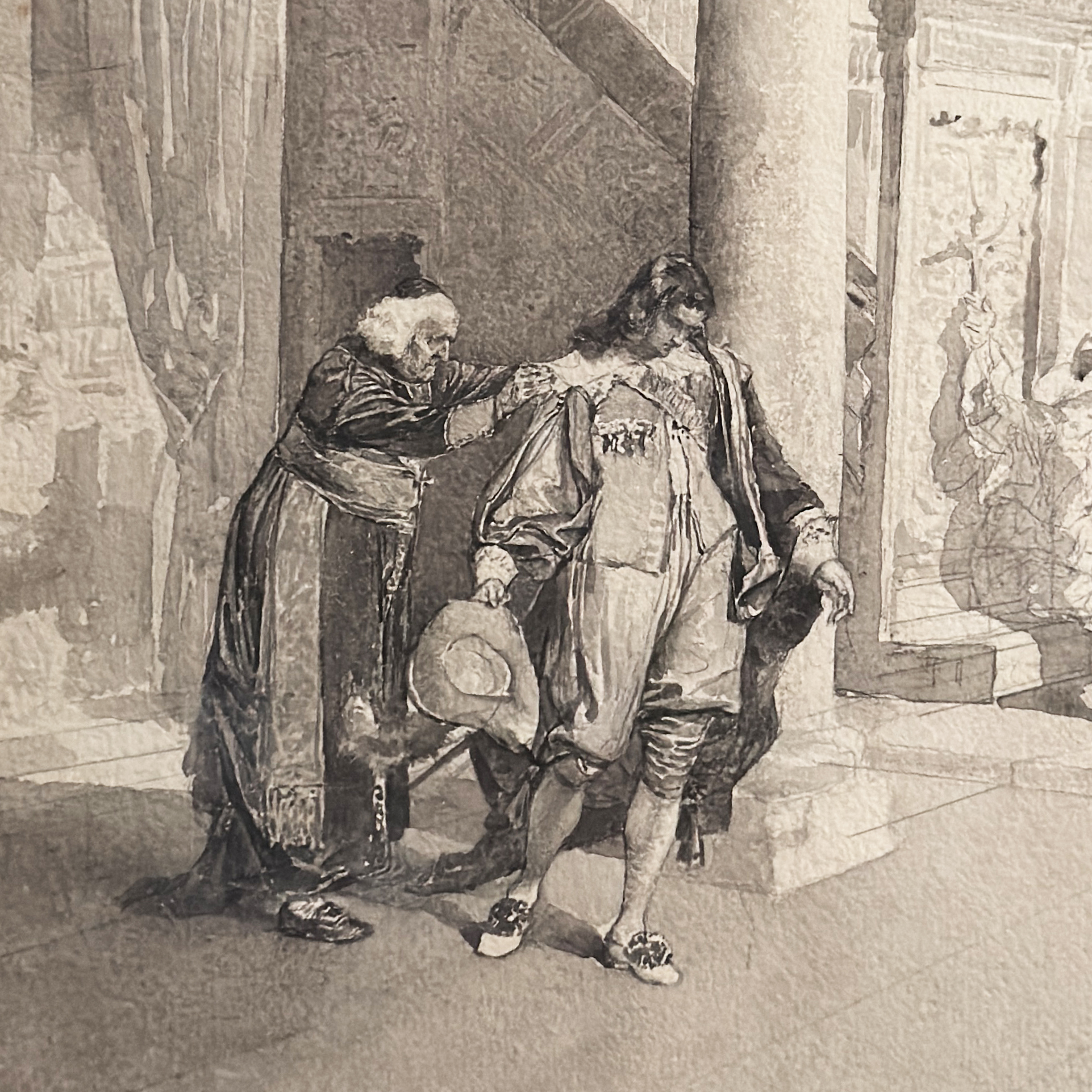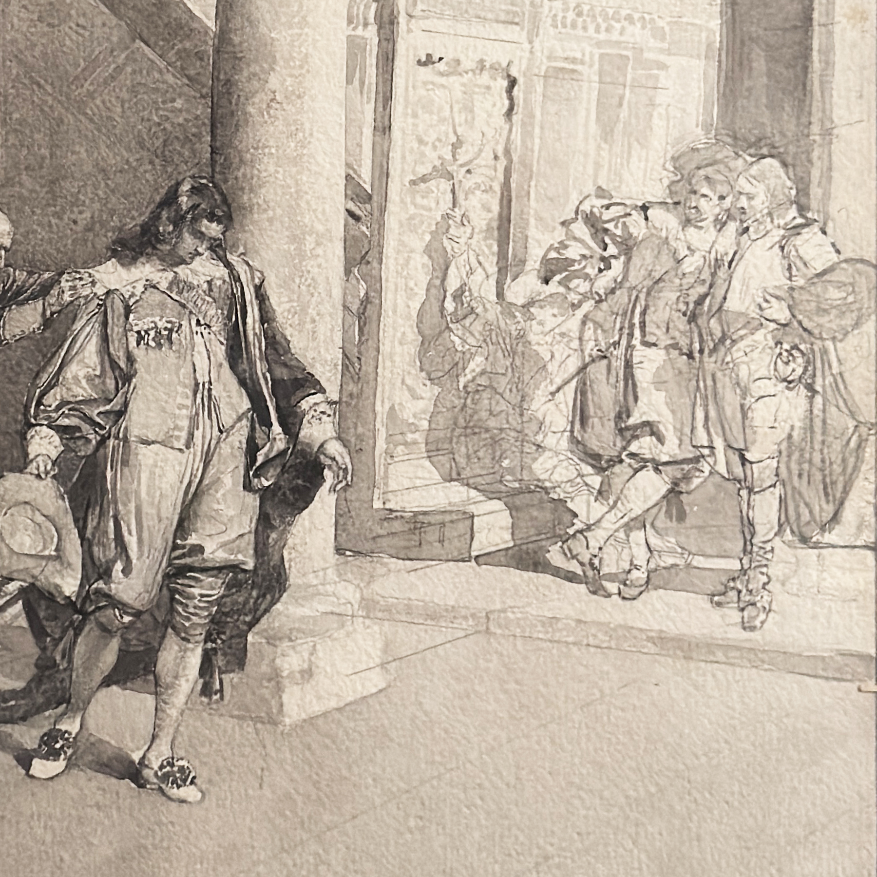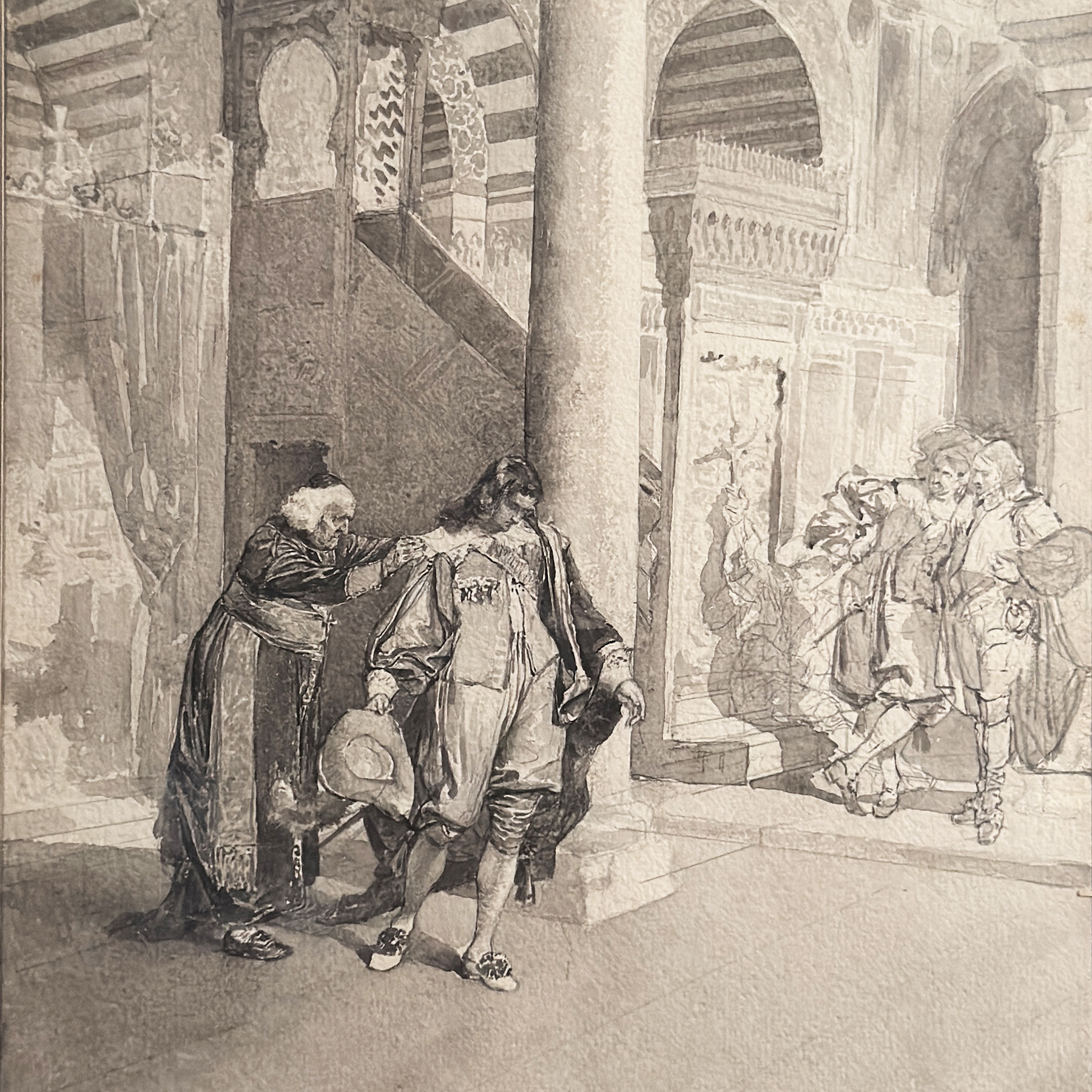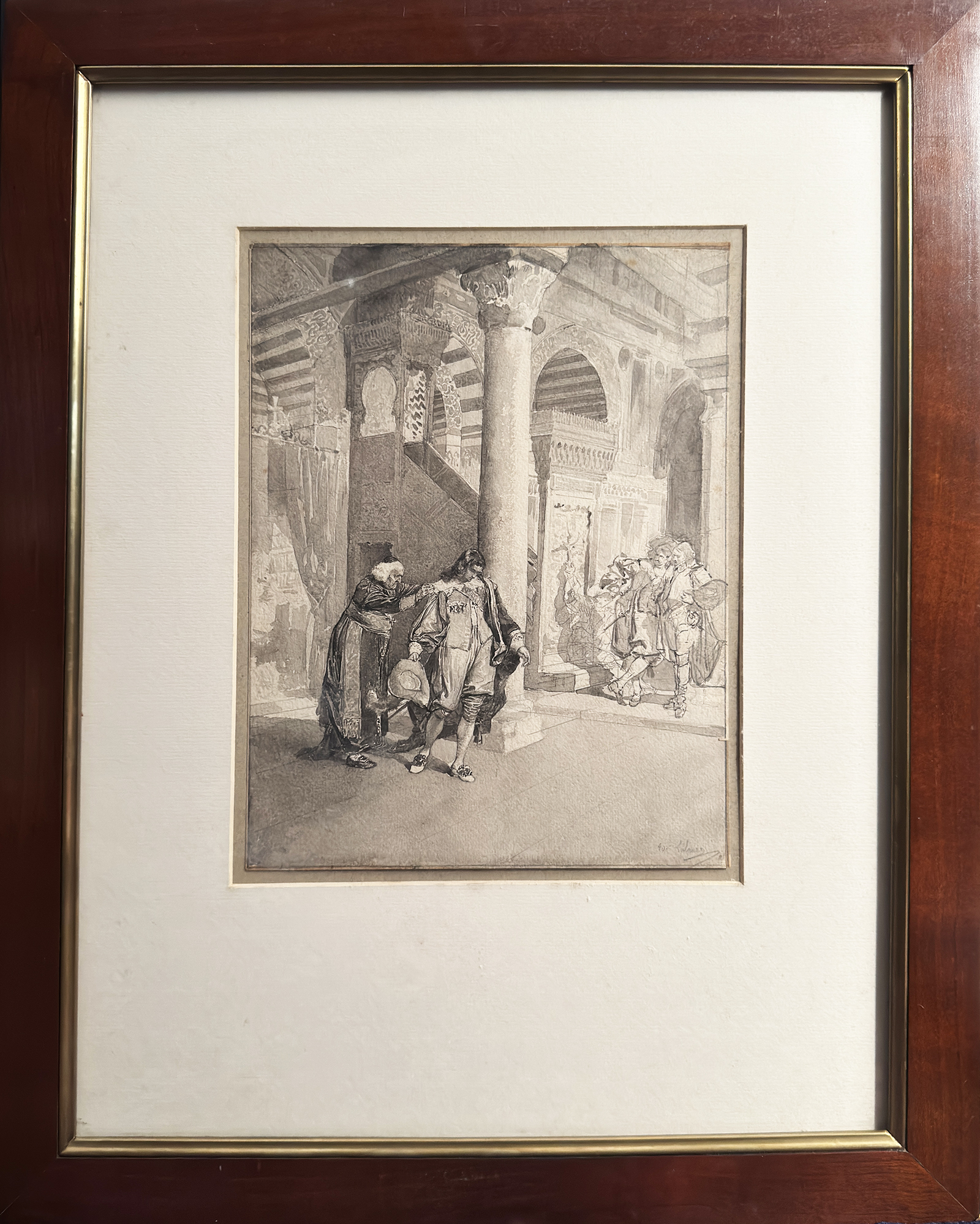 Cette feuille constitue une œuvre exceptionnelle d’Adolphe Lalauze, l’un des illustrateurs et graveurs français les plus distingués de la fin du XIXᵉ siècle. Élève de Léon Gaucherel, Lalauze exposa régulièrement au Salon de Paris à partir de 1872, obtint des médailles en 1876 et 1878, et fut nommé chevalier de la Légion d’honneur. Célèbre pour l’intelligence narrative raffinée de ses compositions et pour sa maîtrise du lavis et de la ligne, il illustra plusieurs grands monuments littéraires de son temps, dont Don Quichotte et Les Mille et Une Nuits. Le présent dessin compte parmi les plus beaux exemples de son œuvre.