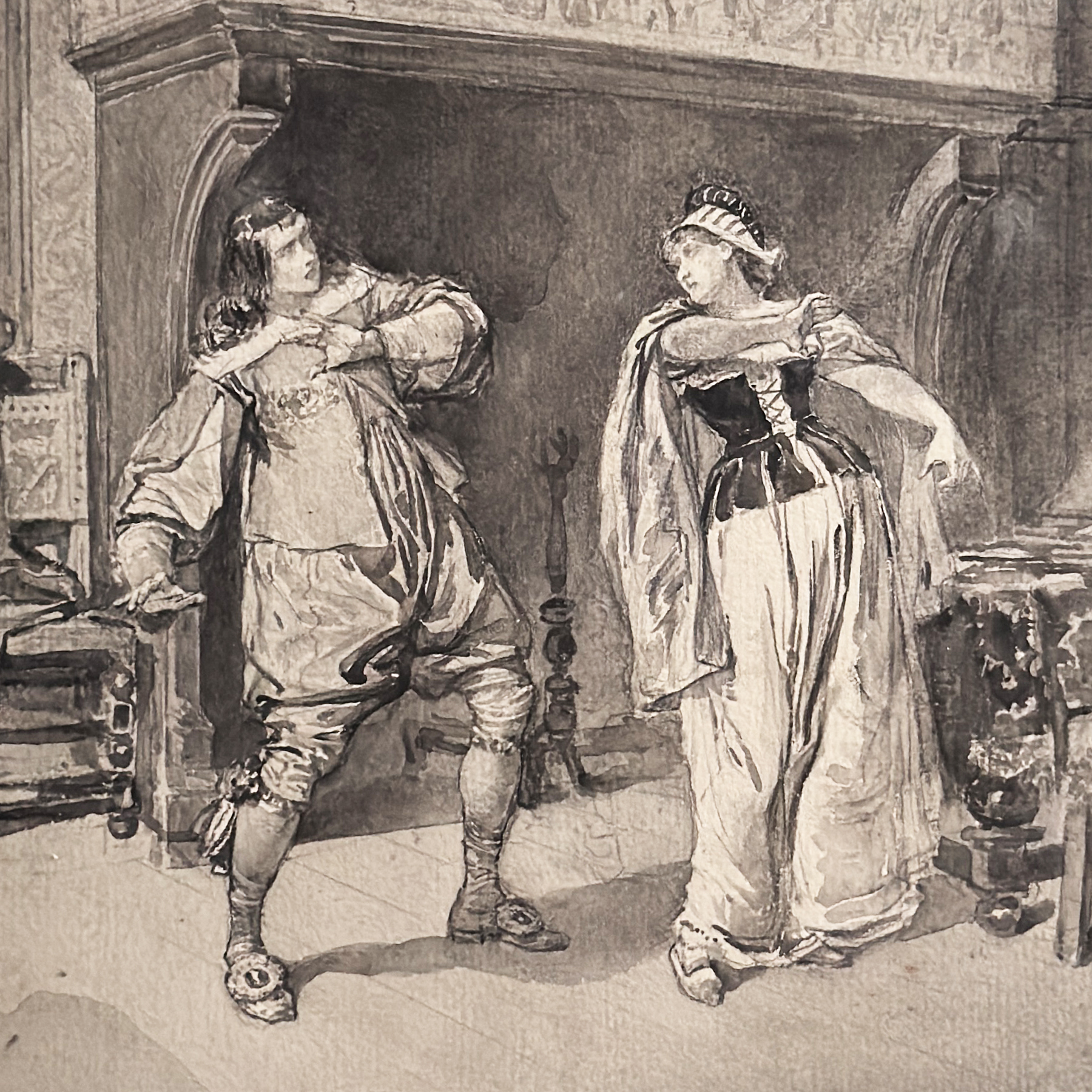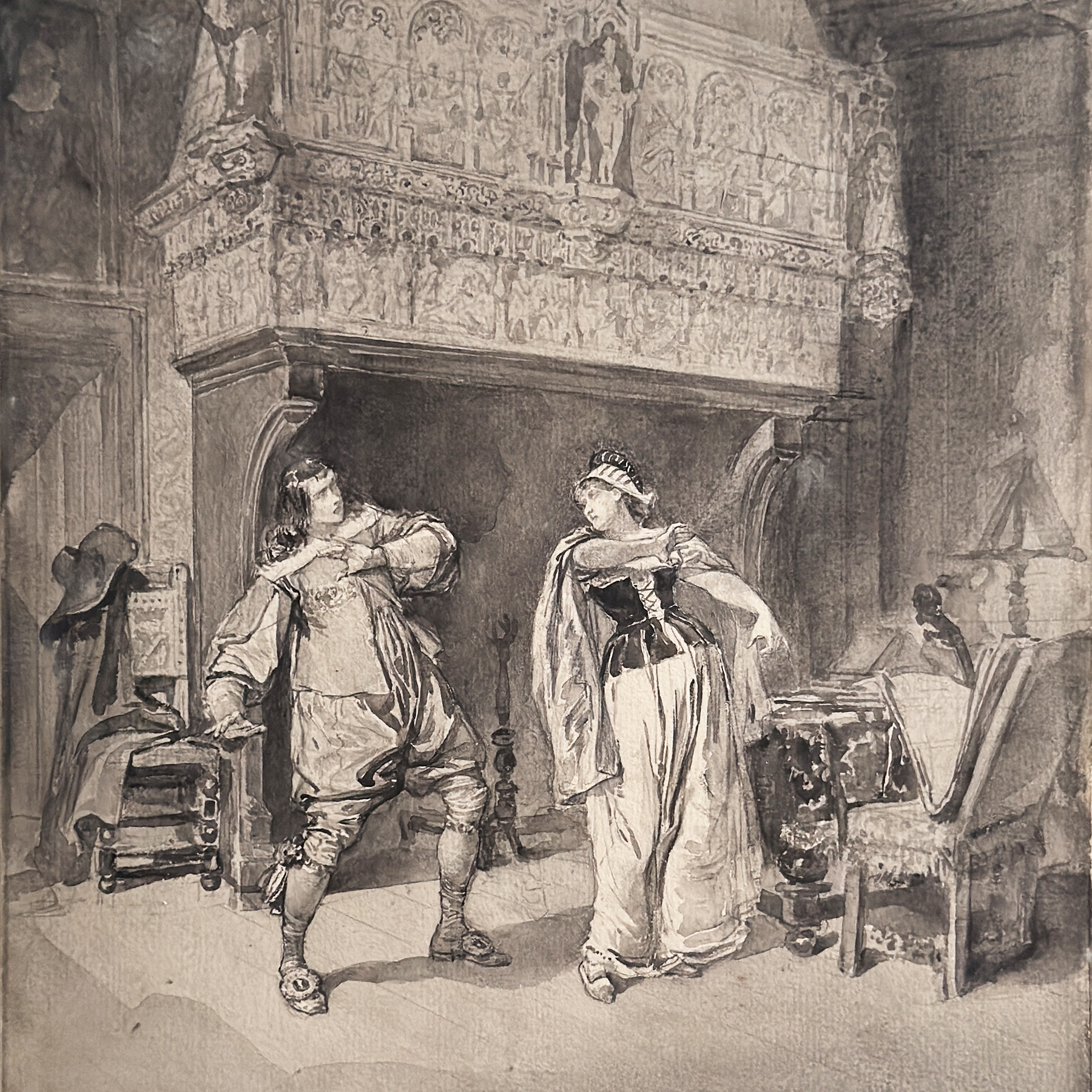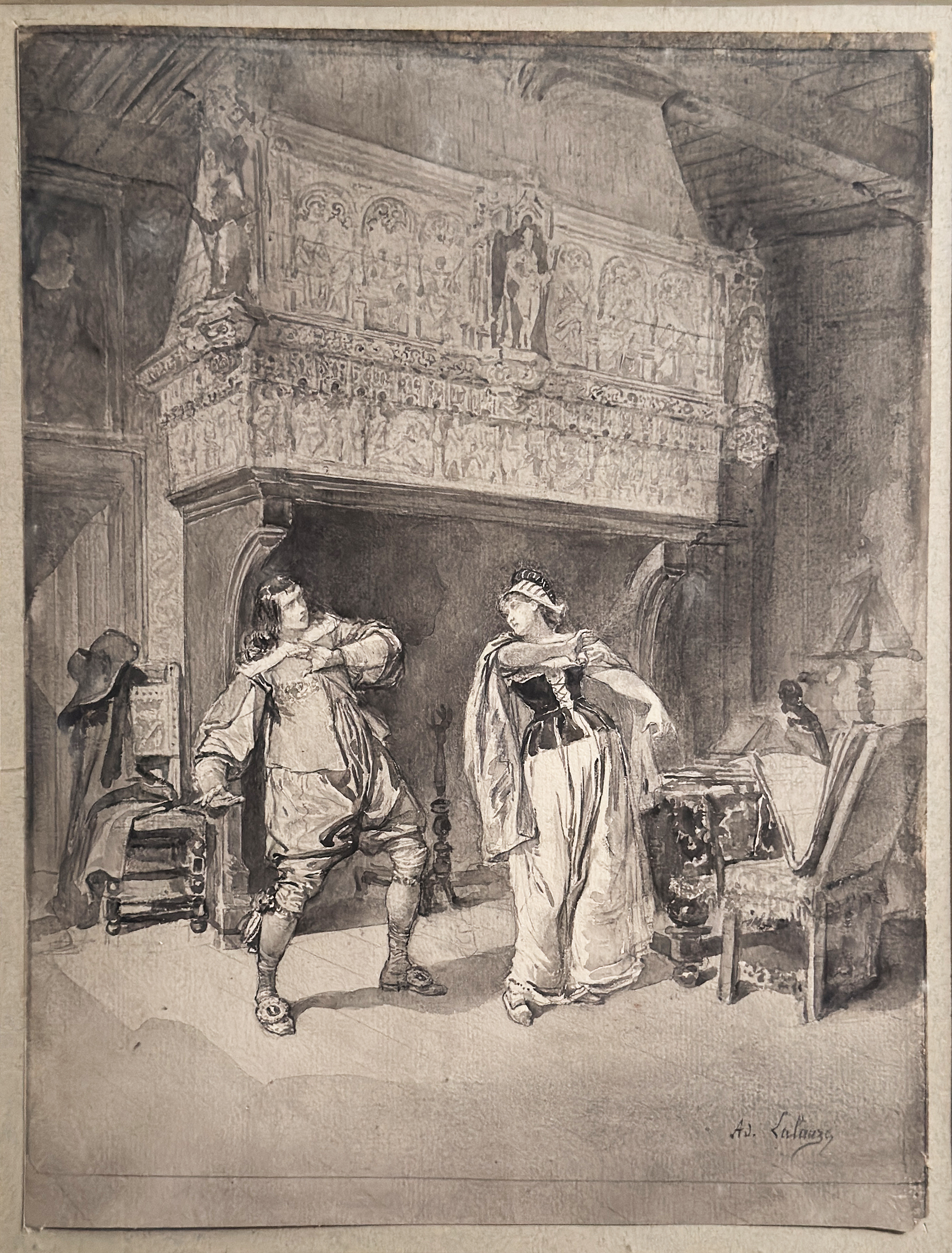 Ce dessin plein de fougue saisit l’une des rencontres les plus vibrantes et les plus chargées d’émotion des Aventures de Gil Blas de Santillane d’Alain-René Lesage : la confrontation explosive entre Gil Blas et Lorença Séphora. Fière, passionnée et naturellement théâtrale, Lorença surgit dans la pièce dans un élan d’indignation ; son geste véhément et sa posture dramatique expriment un tempérament aussi ardent que changeant. Gil Blas, à la fois troublé et fasciné, se trouve pris entre la séduction, le danger et la confusion morale — incarnation parfaite de la vision de Lesage, pour qui la vie n’est qu’un théâtre permanent.