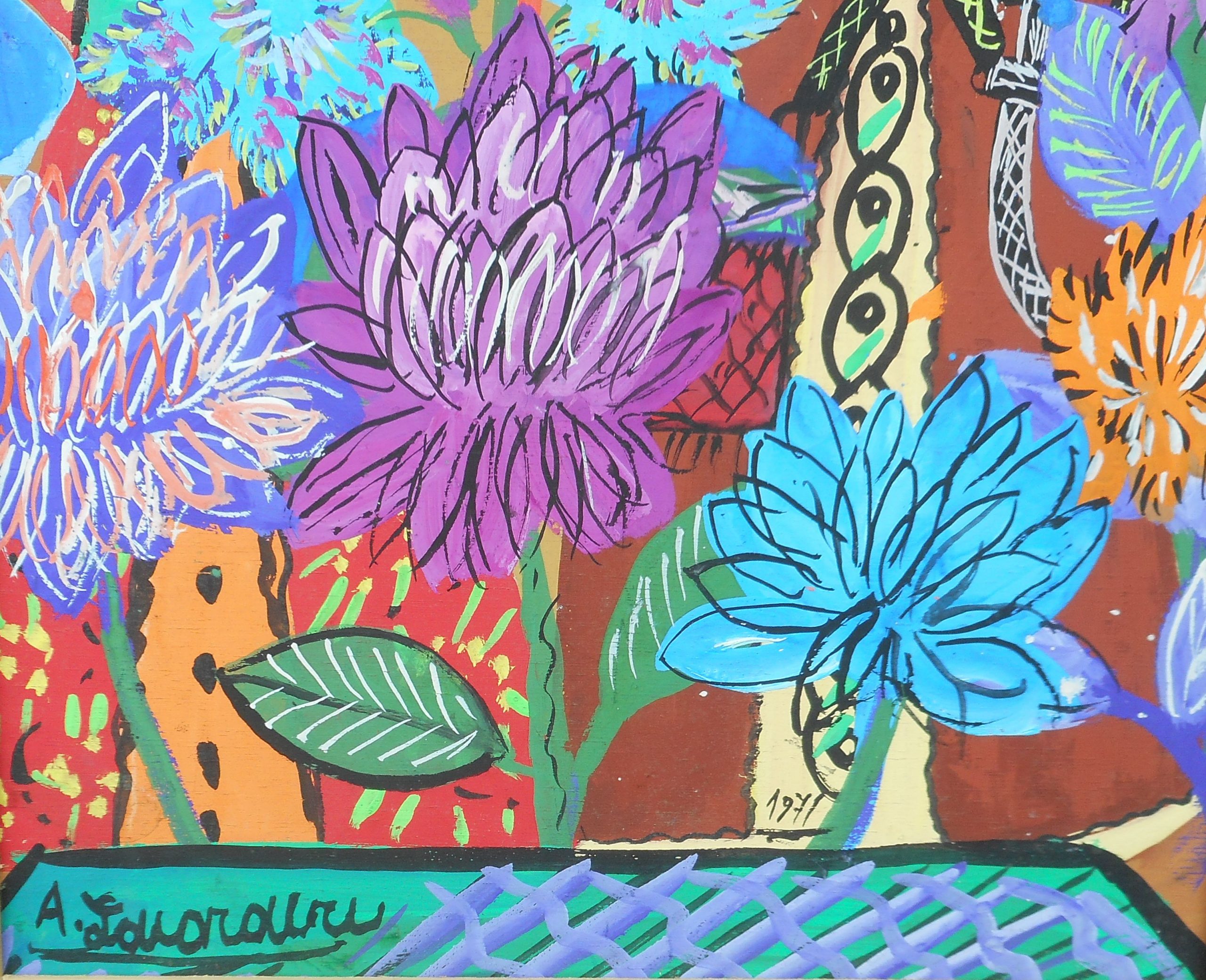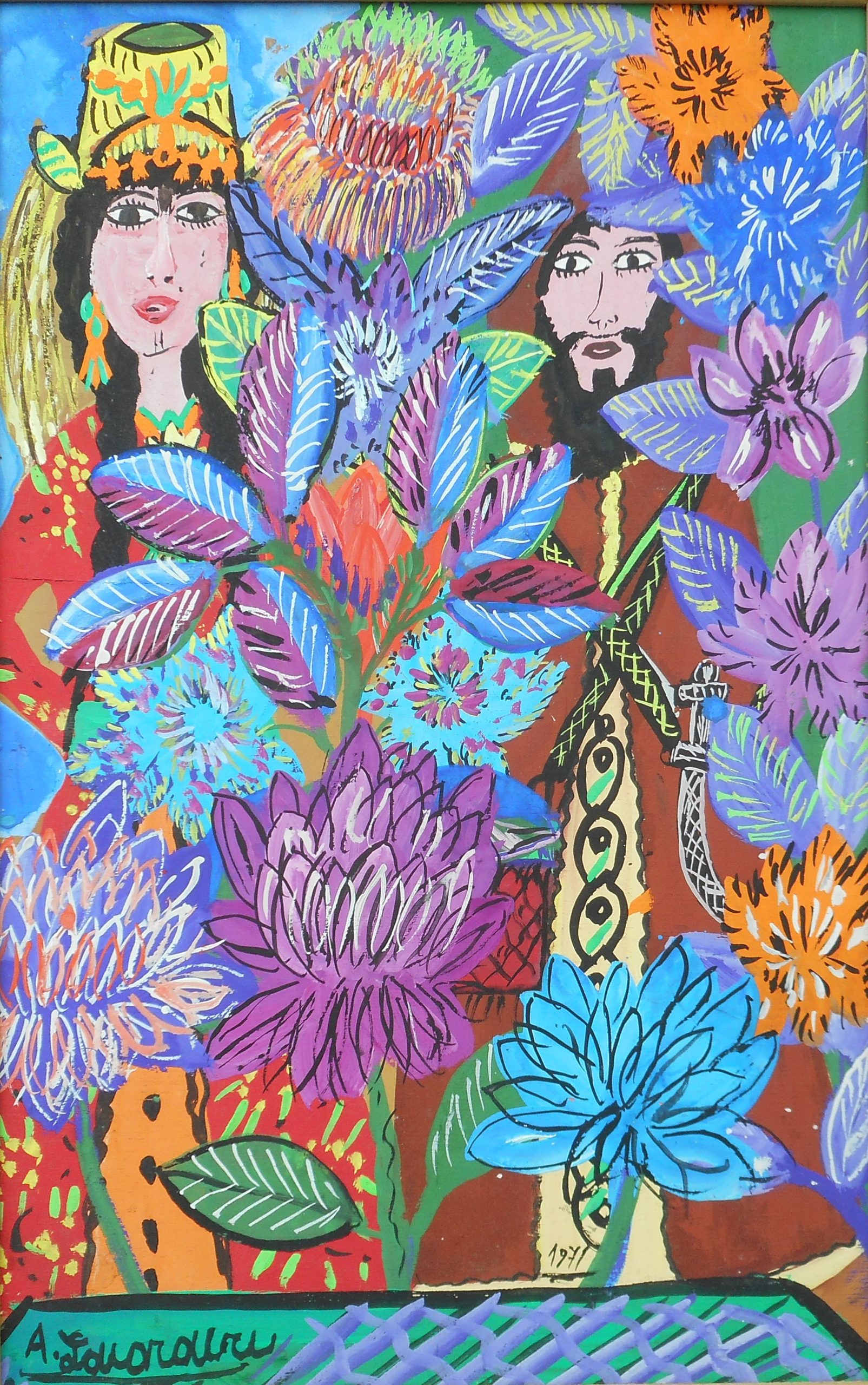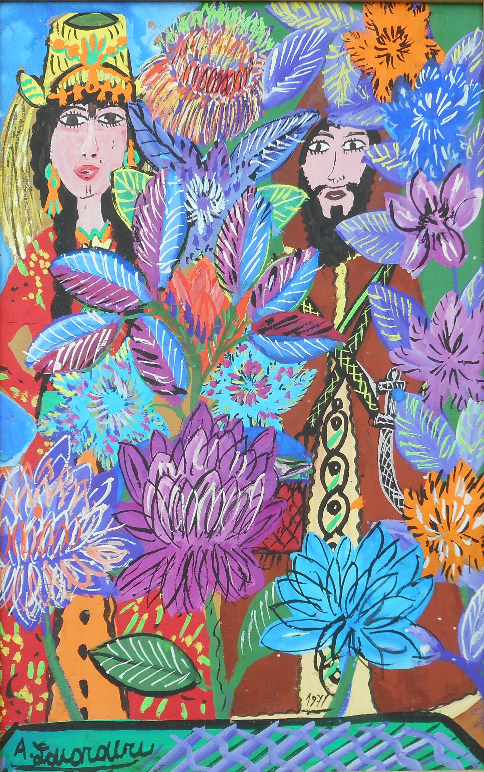 Superbe gouache sur panneau 49,5x32cm (62x44cm encadrée) signée du grand artiste marocain AHMED LOUARDIRI (1928-1974) , datée 1971 et titrée au dos « mariage berbère »