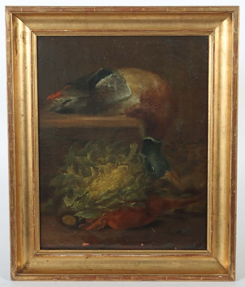 Cette rare nature morte attribuée à August Wilhelm Sievert — surtout connu pour ses compositions florales — montre l’artiste s’orientant vers un sujet inhabituel : les légumes et le gibier. La laitue, le canard colvert et les légumes sont représentés avec la même précision botanique qui caractérise ses pièces florales, chaque élément étant rendu de manière ouverte et distincte, presque comme pour une étude d’histoire naturelle. Cette manière directe, légèrement naïve, constitue précisément le charme des œuvres de Sievert, conférant à la composition une honnêteté toute nordique et une forte présence décorative.