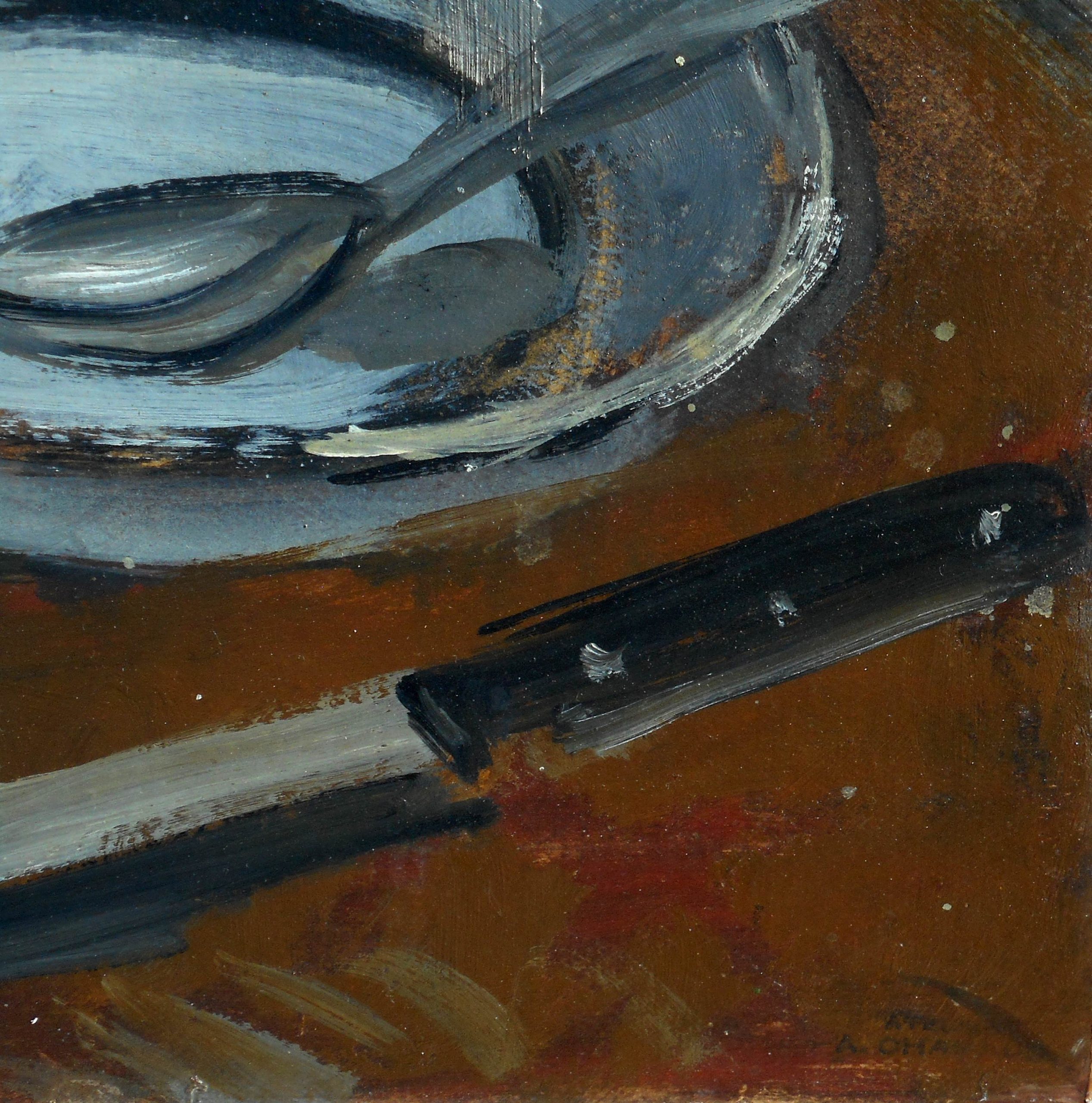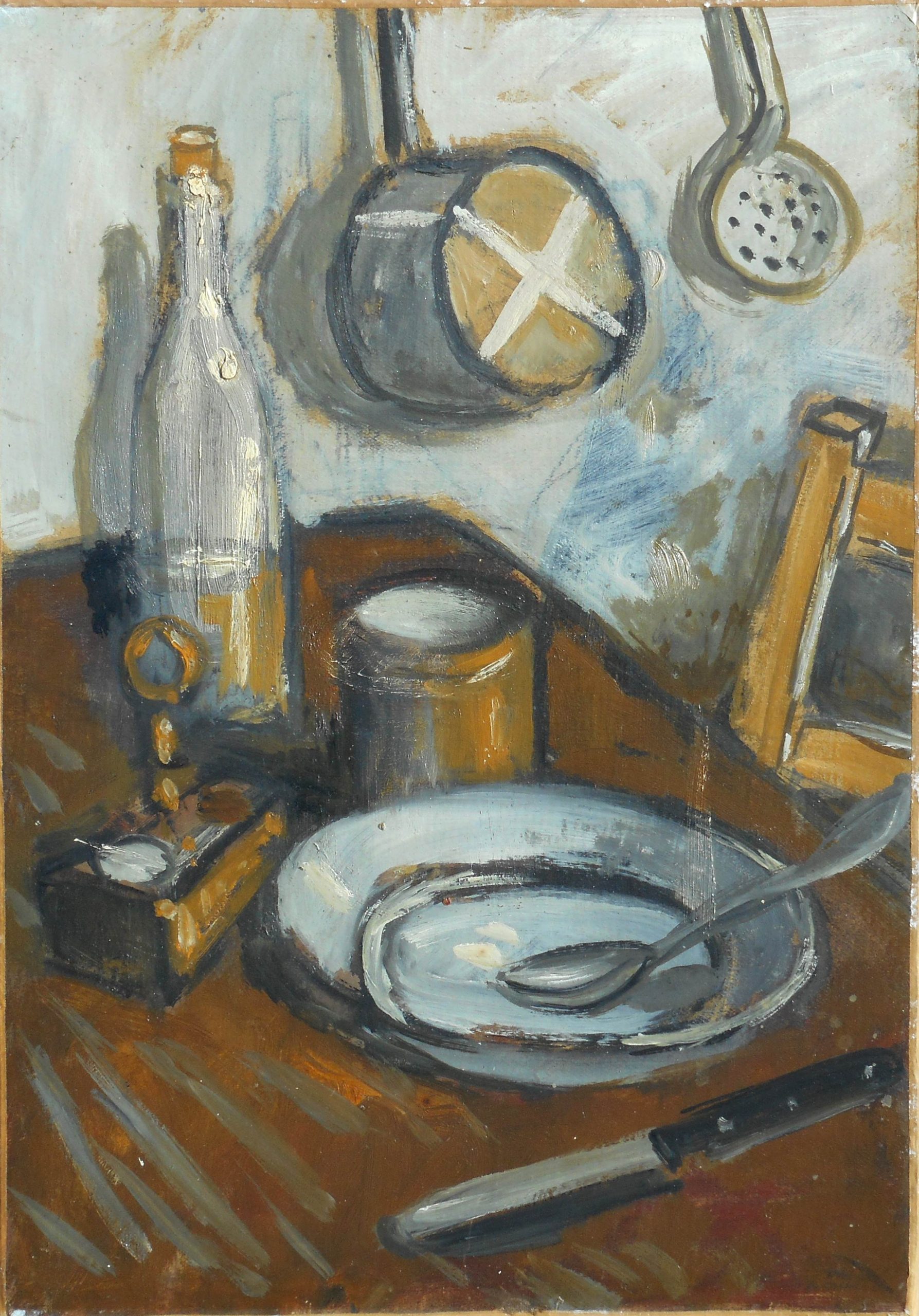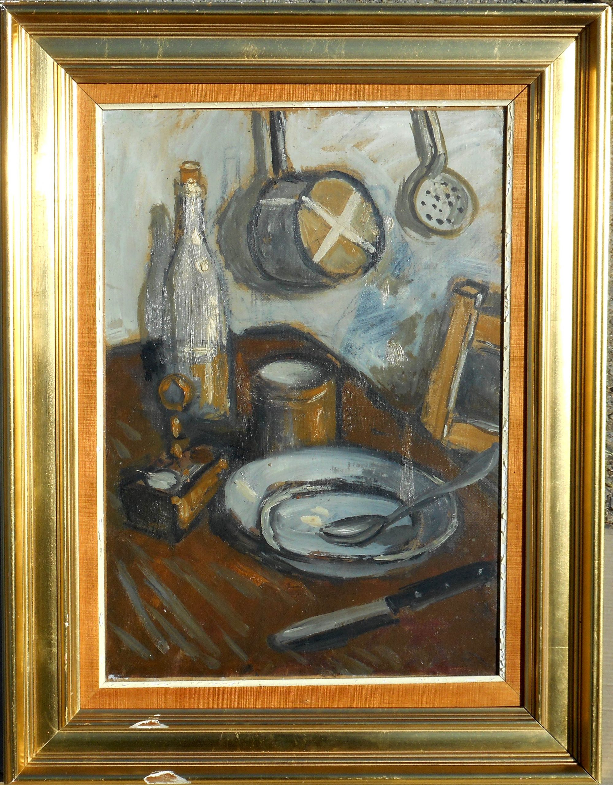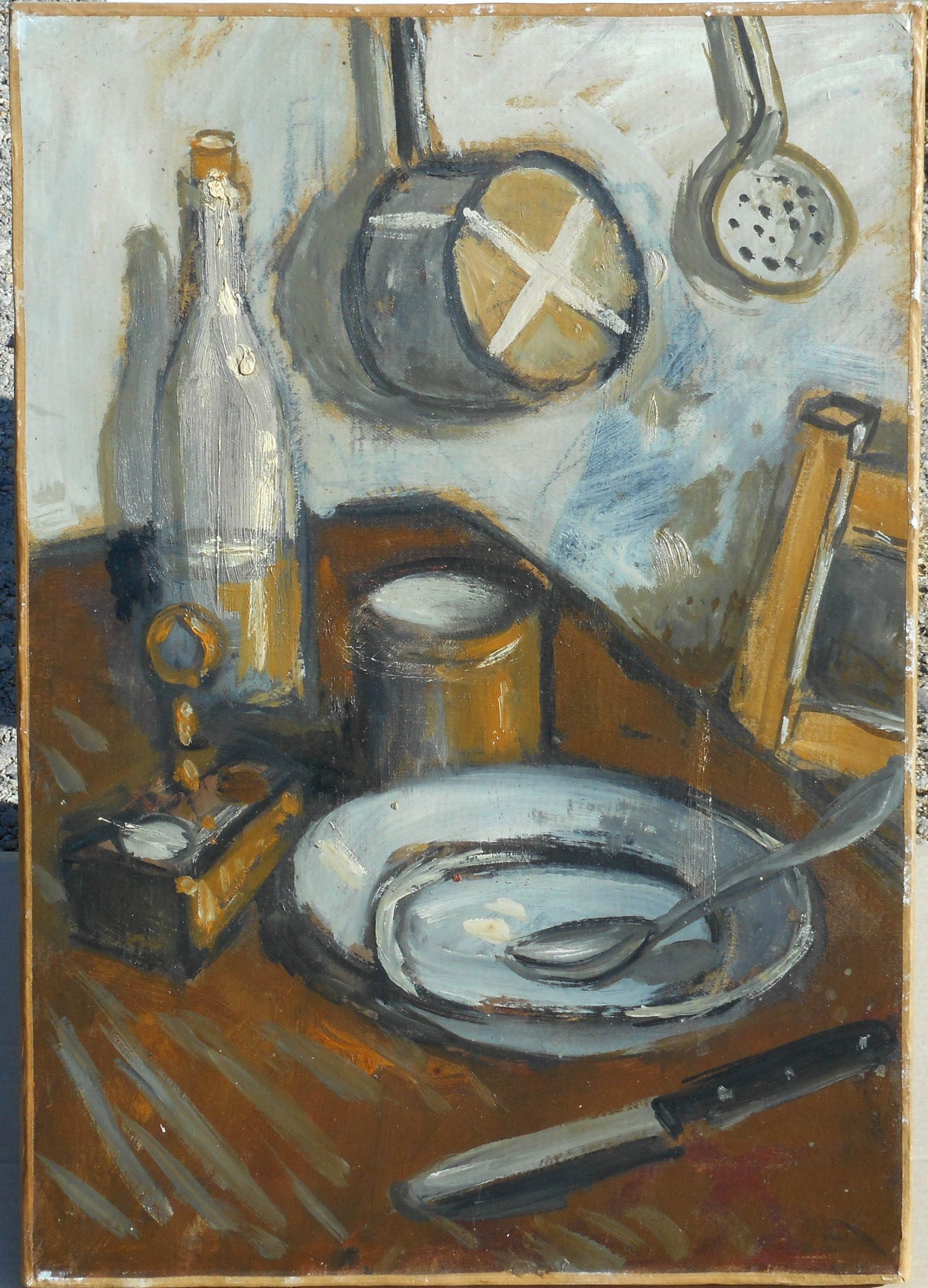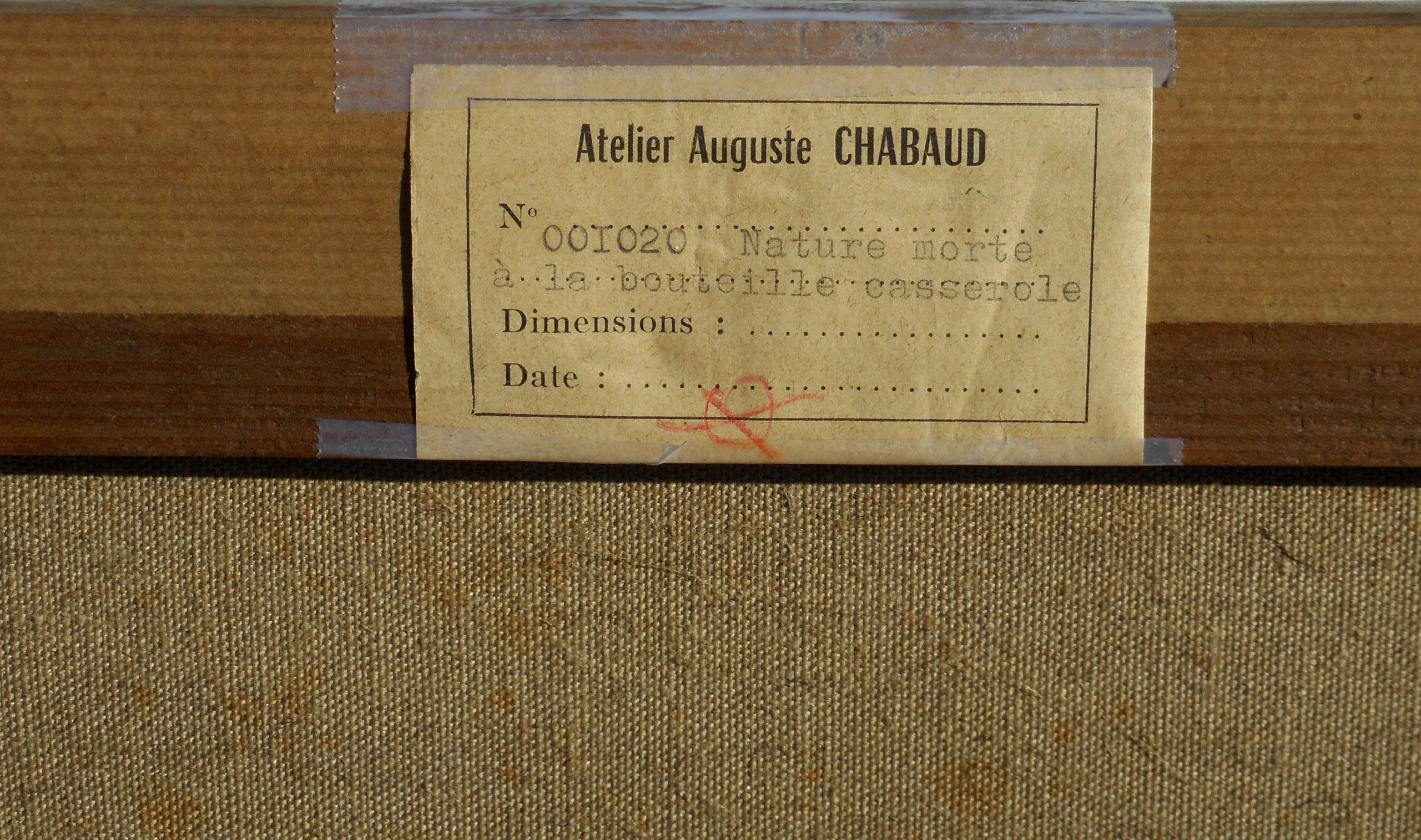 Titrée sur l’étiquette de vente d’atelier au dos « nature morte à la bouteille – casserole » numérotée 001020