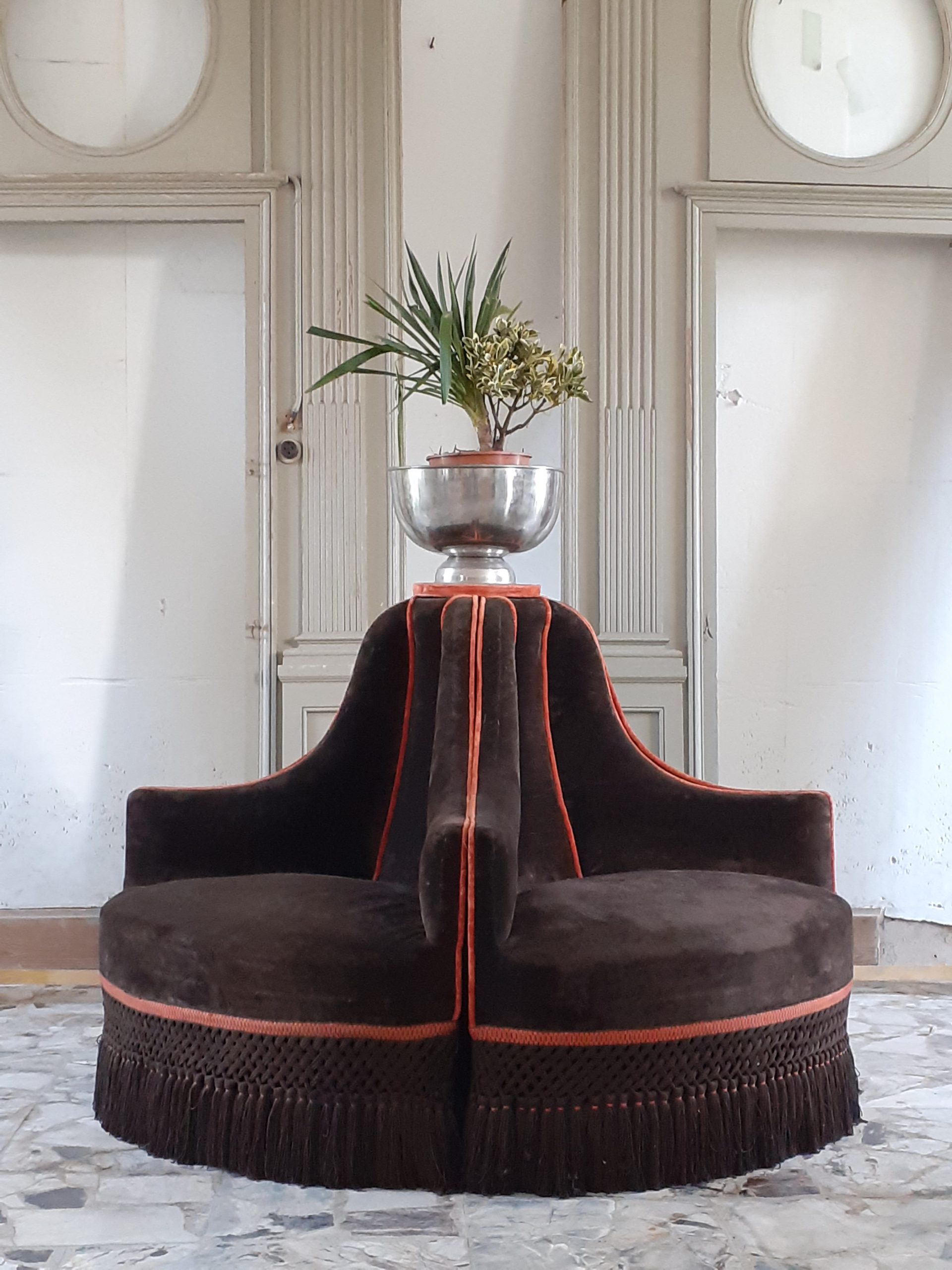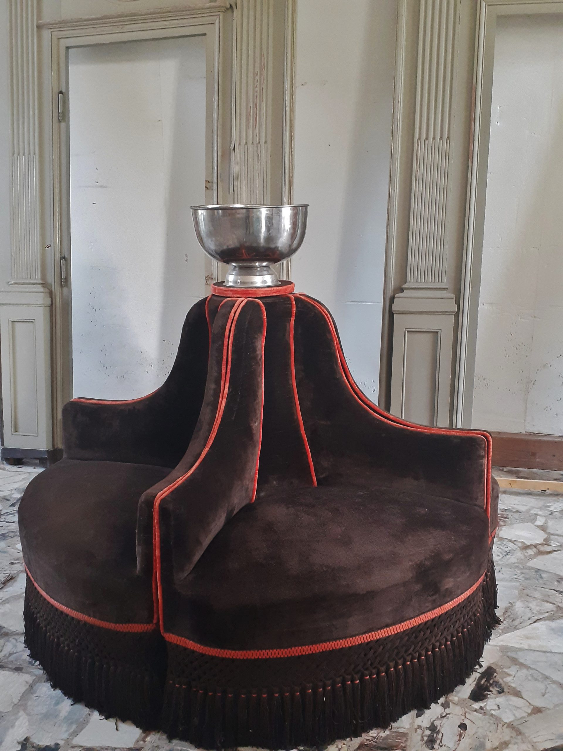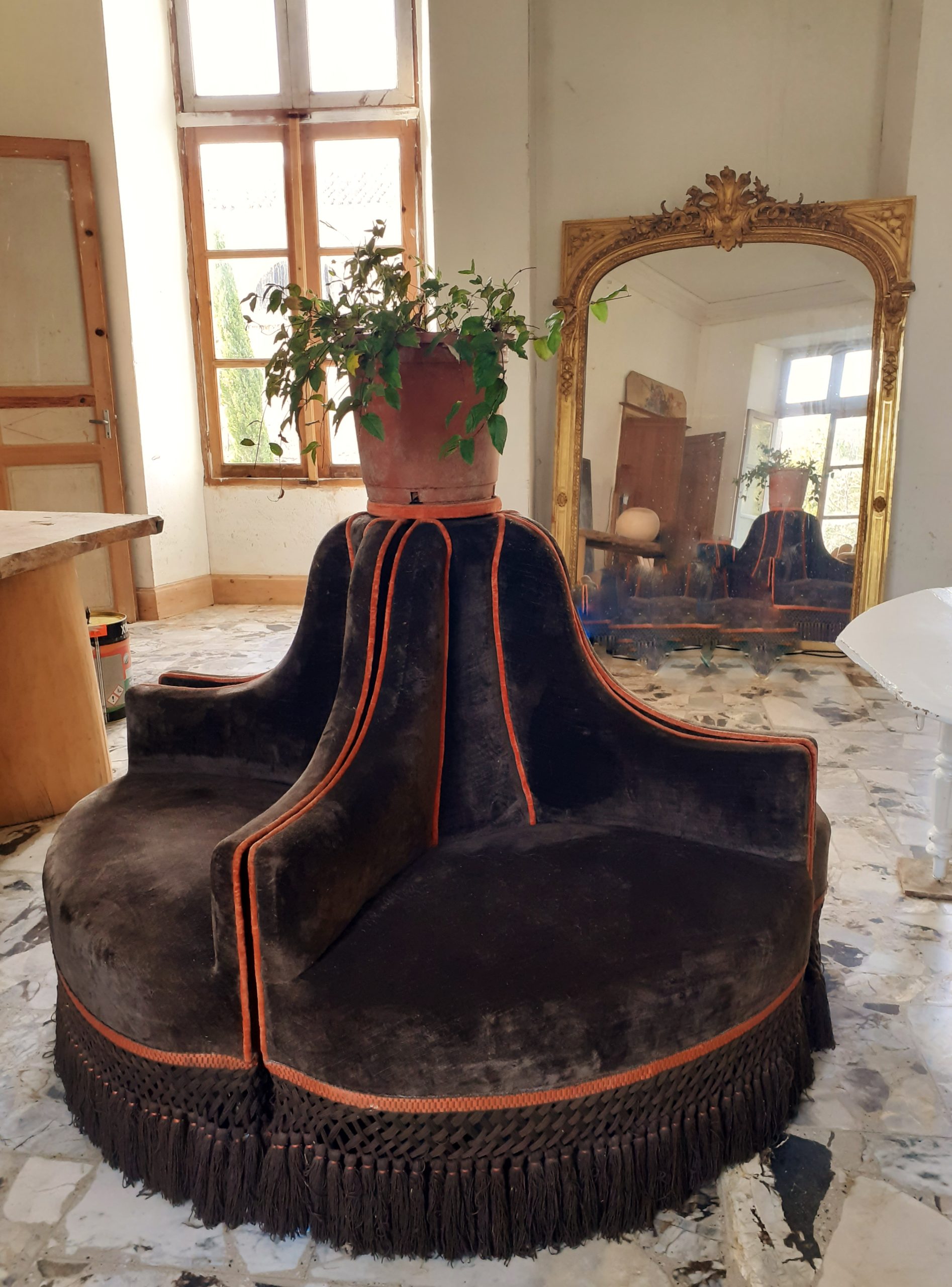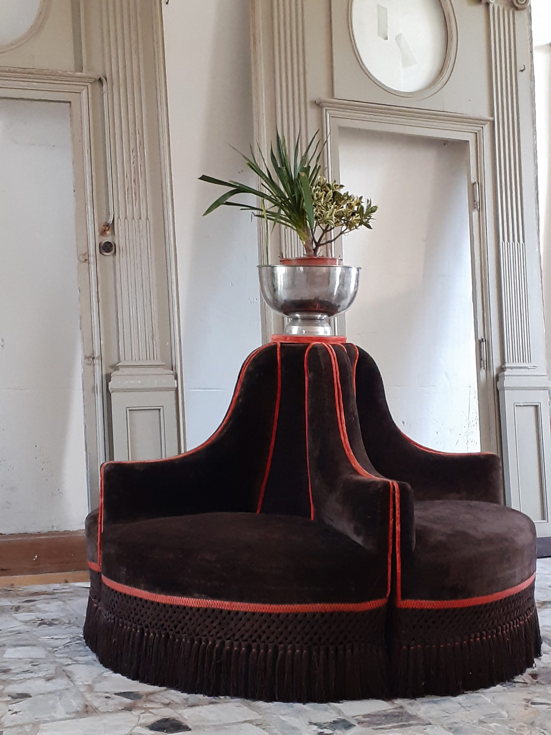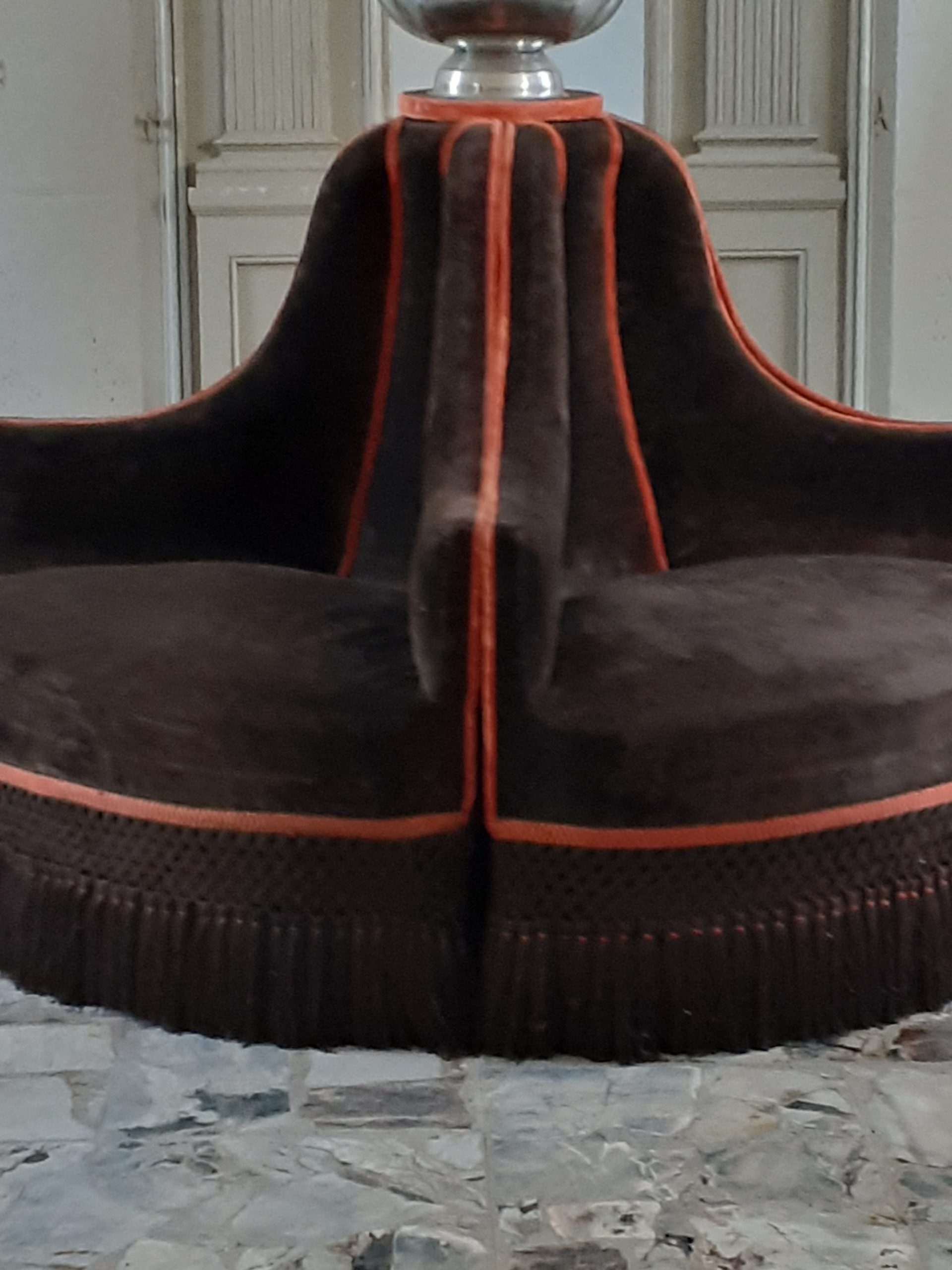 Rare et imposante  borne composée de quatre fauteuils garnis de velours marron et agrémentée d’une passementerie orange –