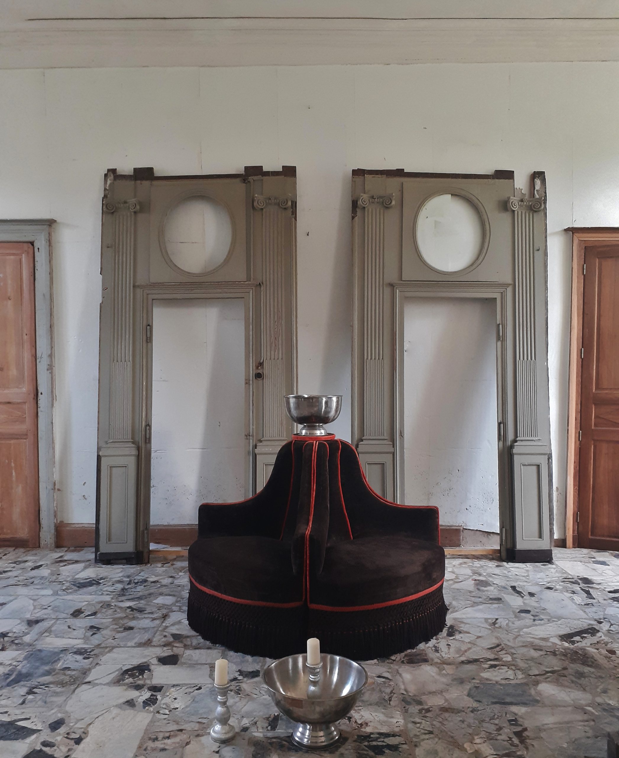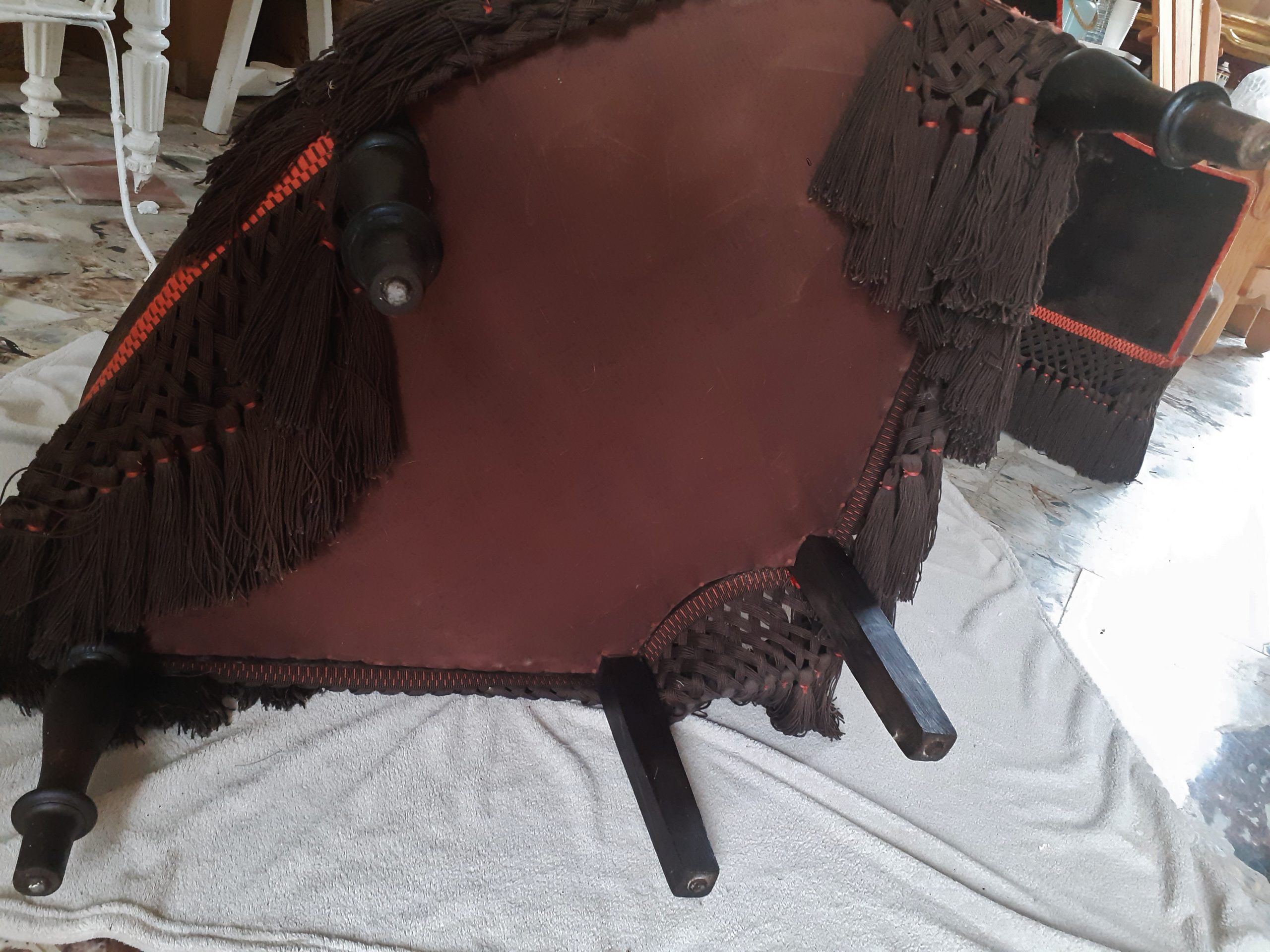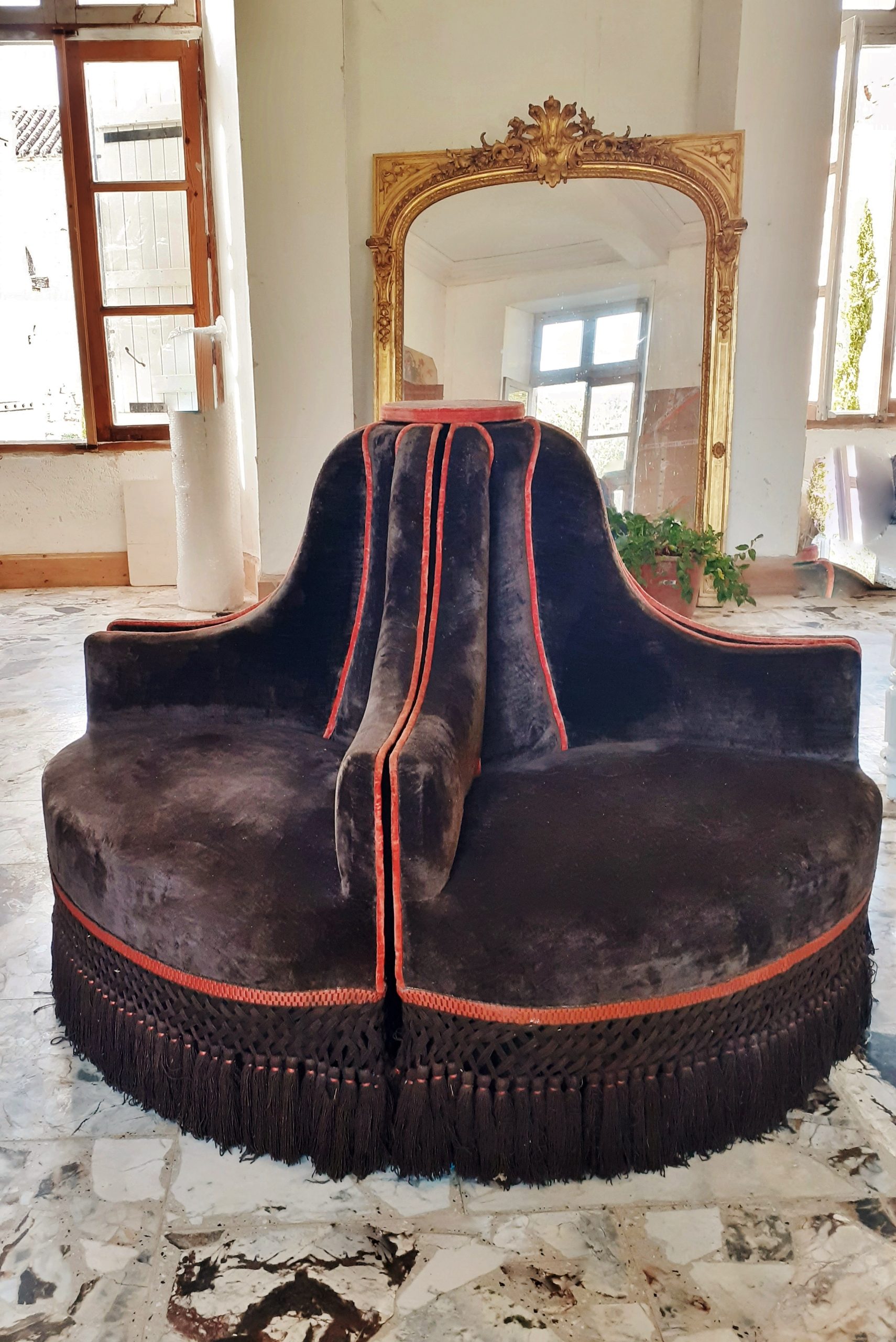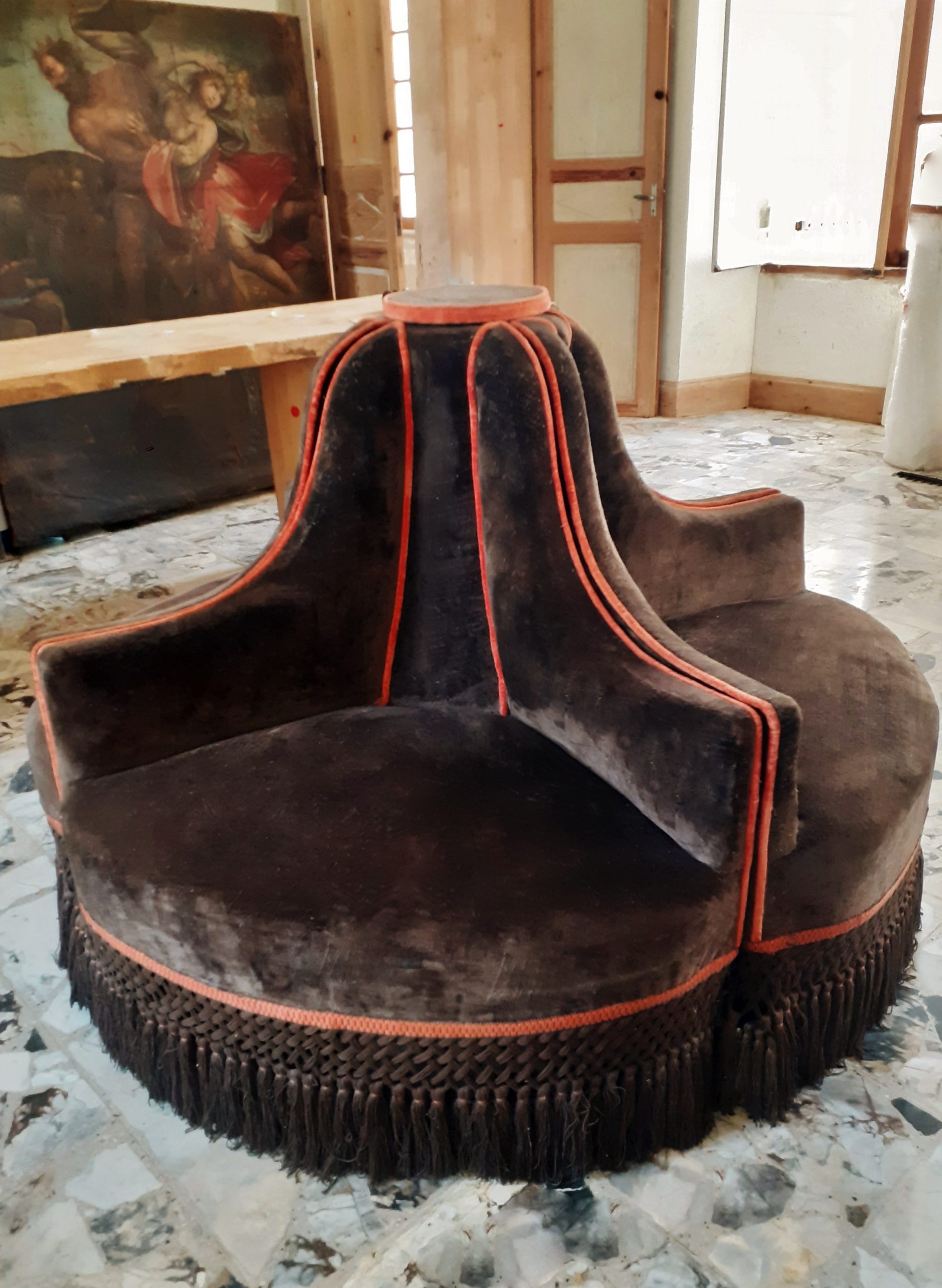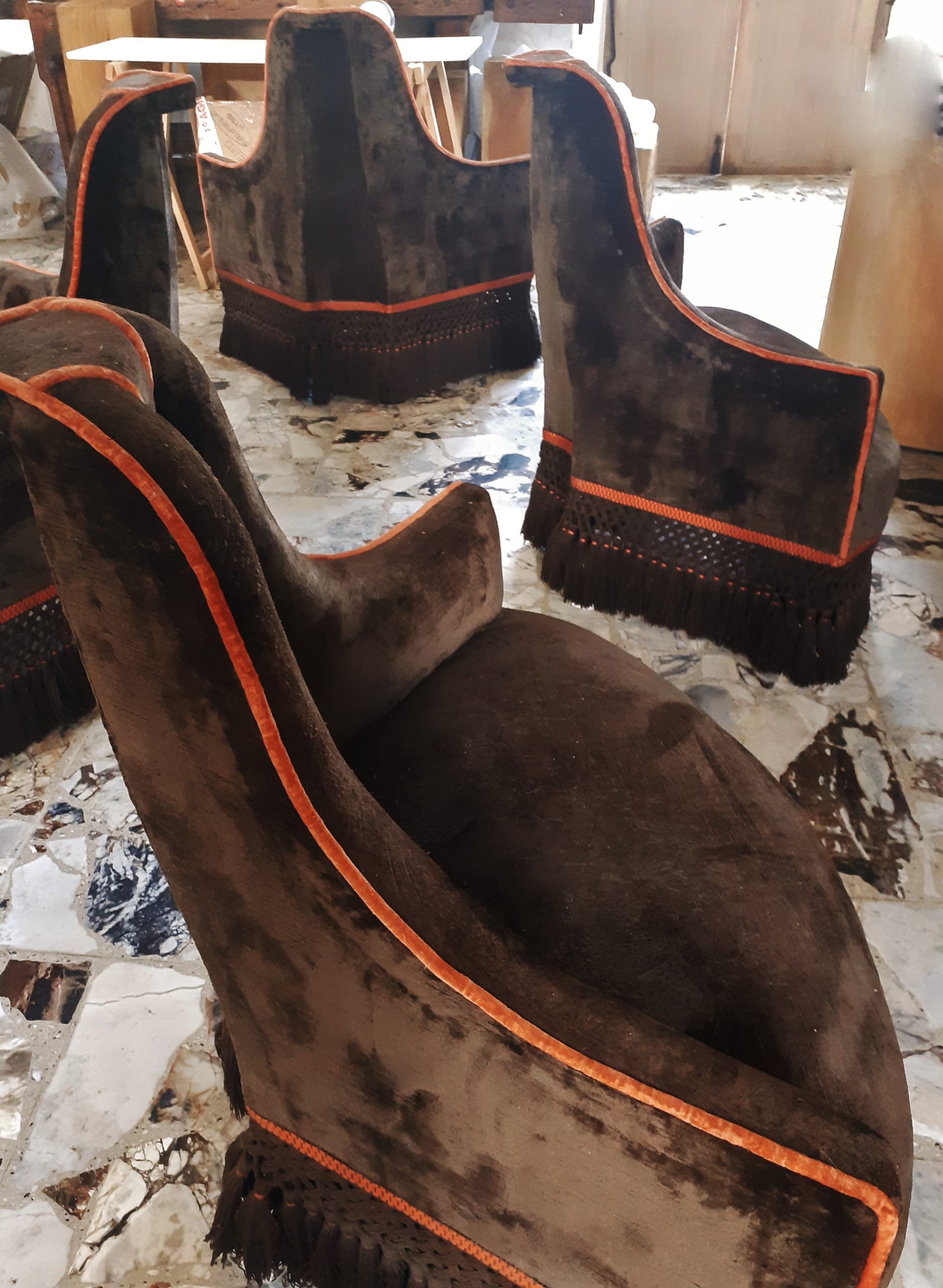 Rare et imposante  borne composée de quatre fauteuils garnis de velours marron et agrémentée d’une passementerie orange –