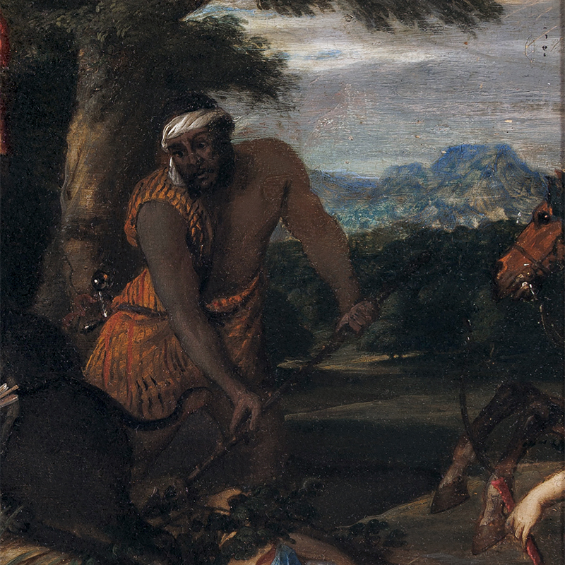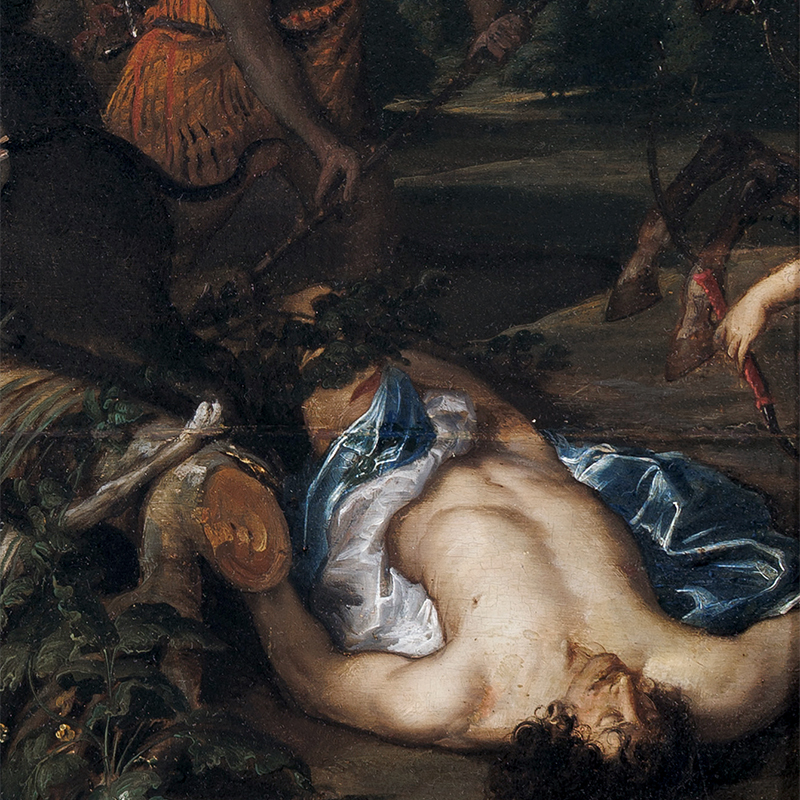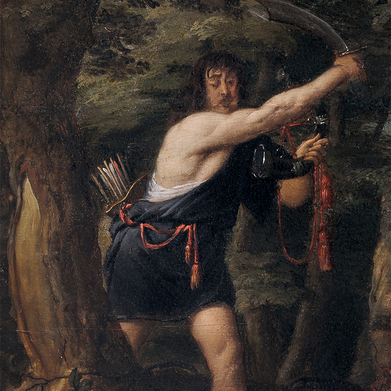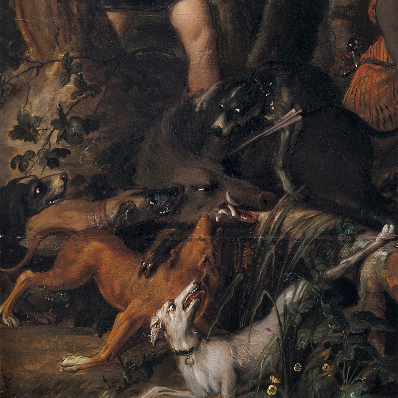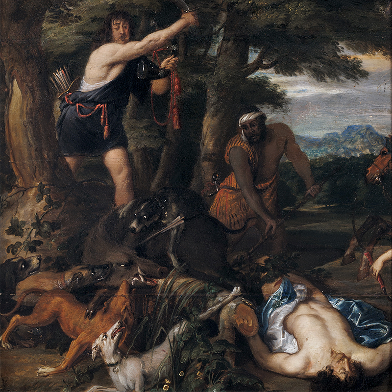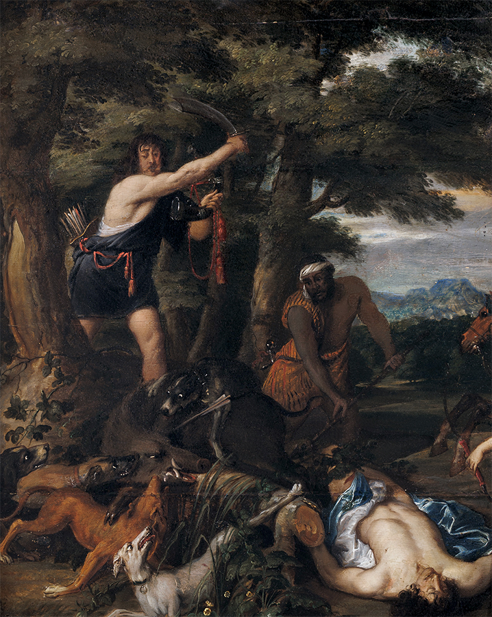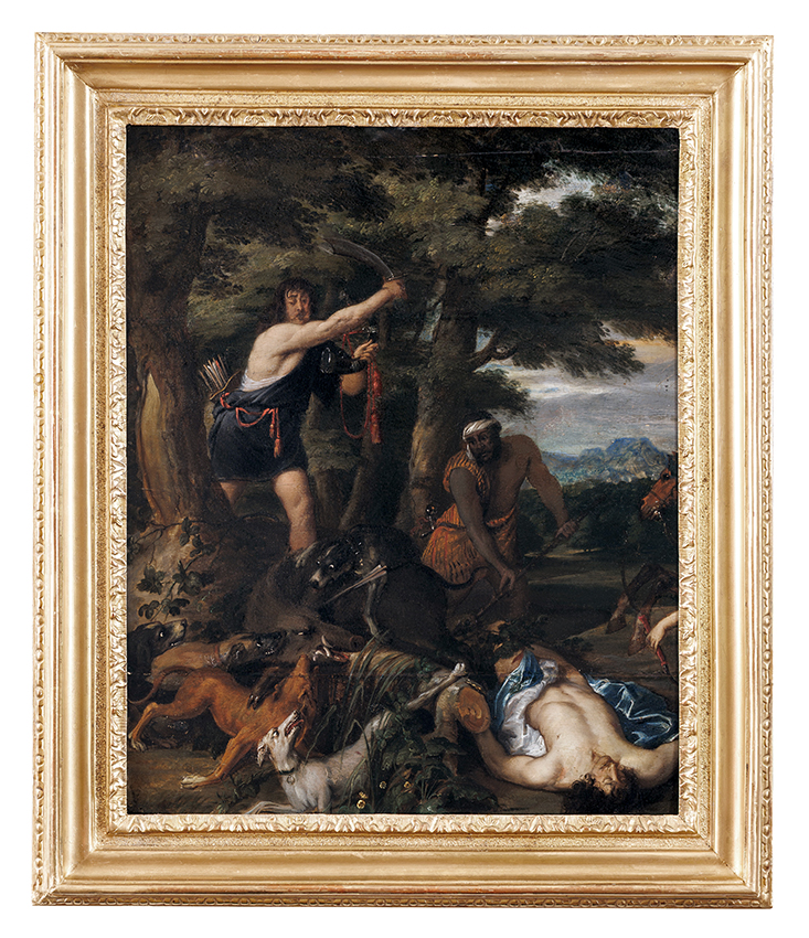 Le tableau représente un sujet rare issu de la mythologie antique, plus précisément le début de la légendaire chasse au sanglier de Calydon — à savoir, la mort de l’Argonaute Ancaeus. La chasse, organisée par le roi Œnée pour délivrer ses terres du redoutable sanglier, attira de nombreux héros. Ancaeus, connu pour sa force, attaqua l’animal avec assurance, mais fut mortellement blessé — c’est son beau corps que l’on aperçoit dans l’angle inférieur droit de la composition.