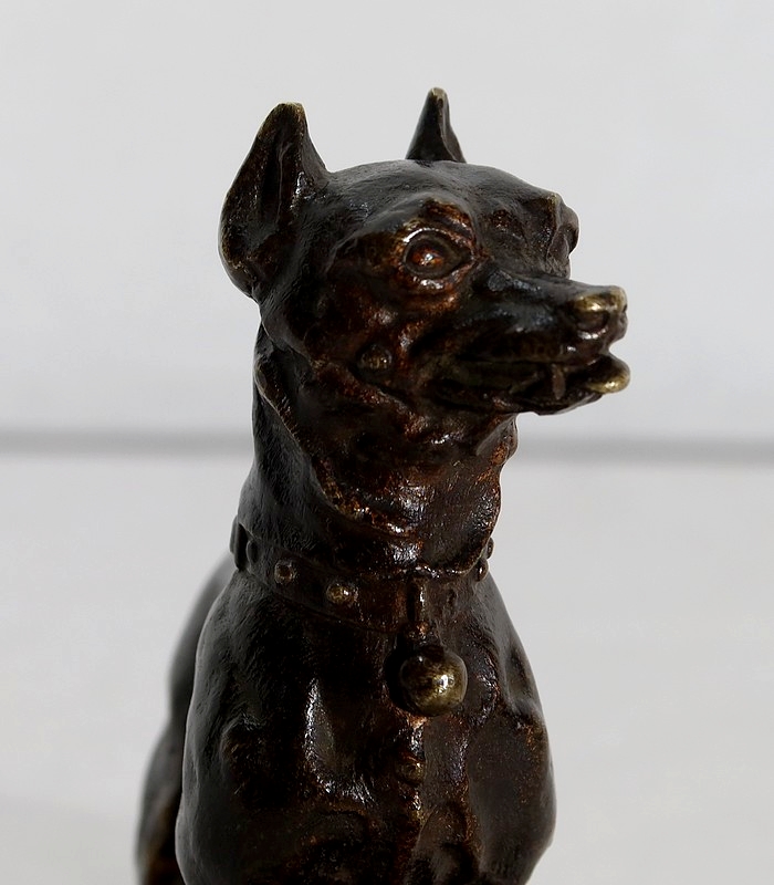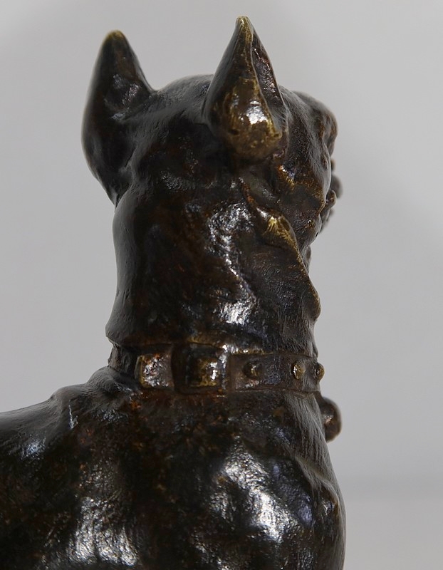Ce bronze à patine brun-doré représente un chien jouant avec sa balle sur un tapis aux motifs géométriques. Le regard tourné vers son maître, le chient tire sa langue dans l’attente d’une réponse. Autour de son cou, l’animal est muni d’un collier accompagné d’un gros grelot.