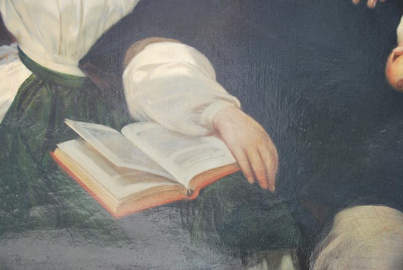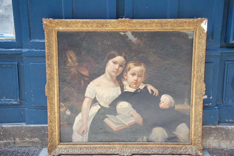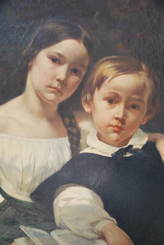Charmant tableau représentant un double portrait un frère et sa sœur dans un jardin , l’huile est présentée sur sa toile d origine, dans son « vieux » vernis, « jolie » composition, le jeune garçon portant une blouse noire est appuyé sur sa sœur, cette dernière un livre posé sur sa robe.