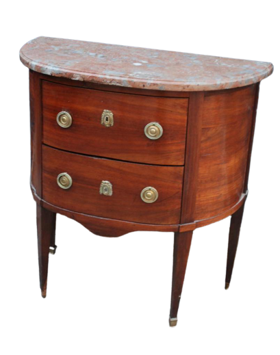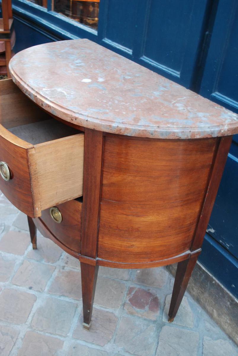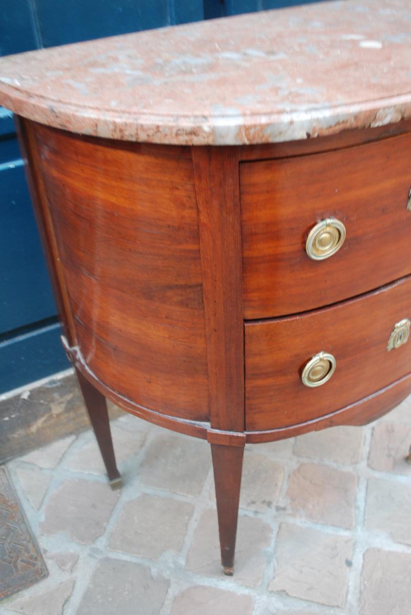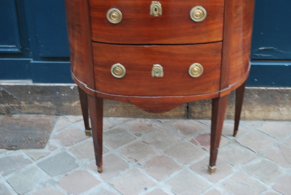 Petite commode de forme demi lune ouvrant en façade par deux tiroirs sans traverse, en acajou et placage d acajou, 4 pieds gaine ,