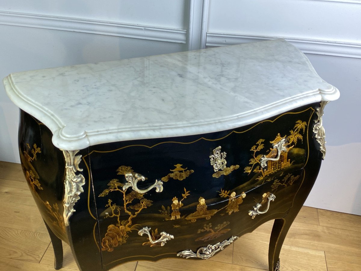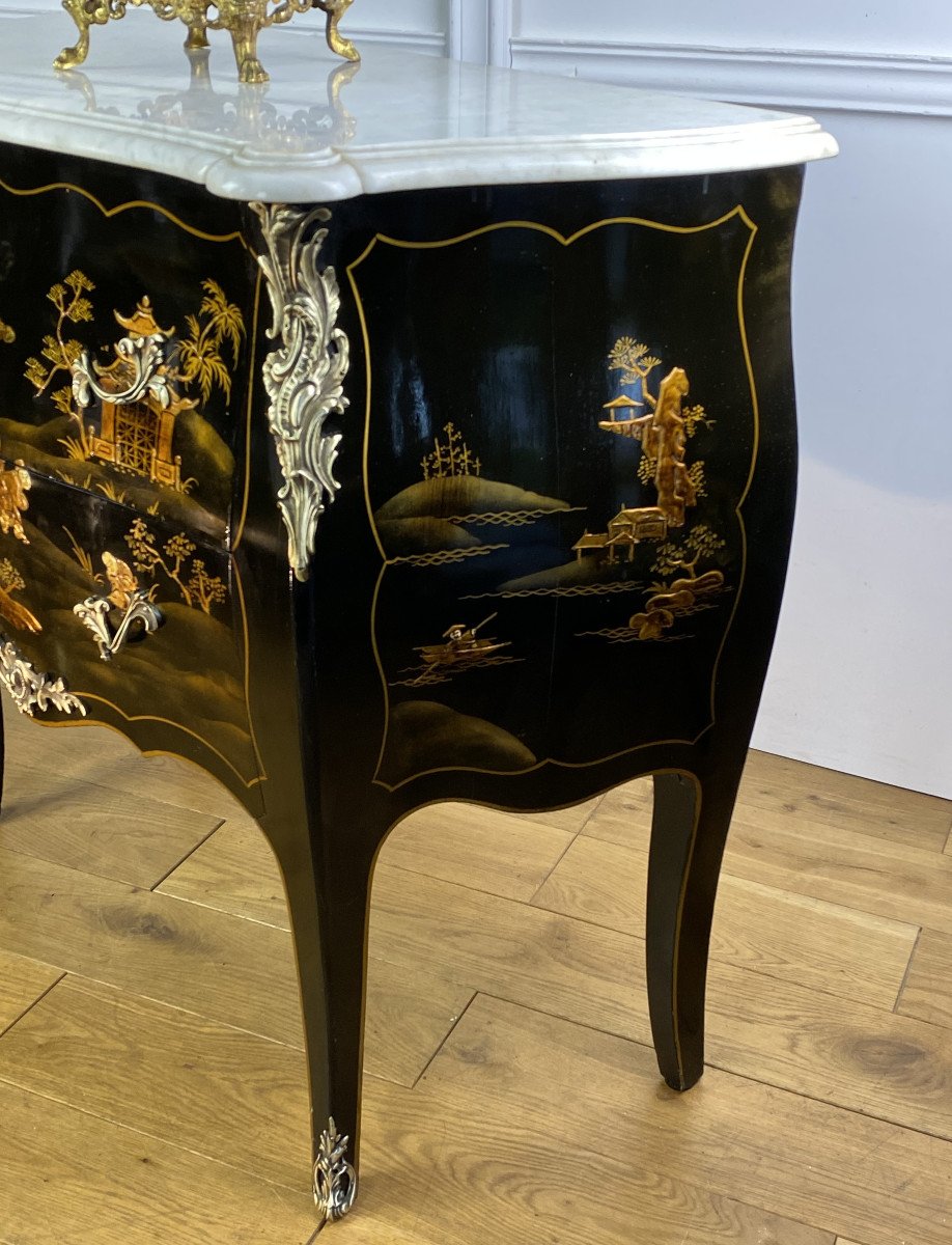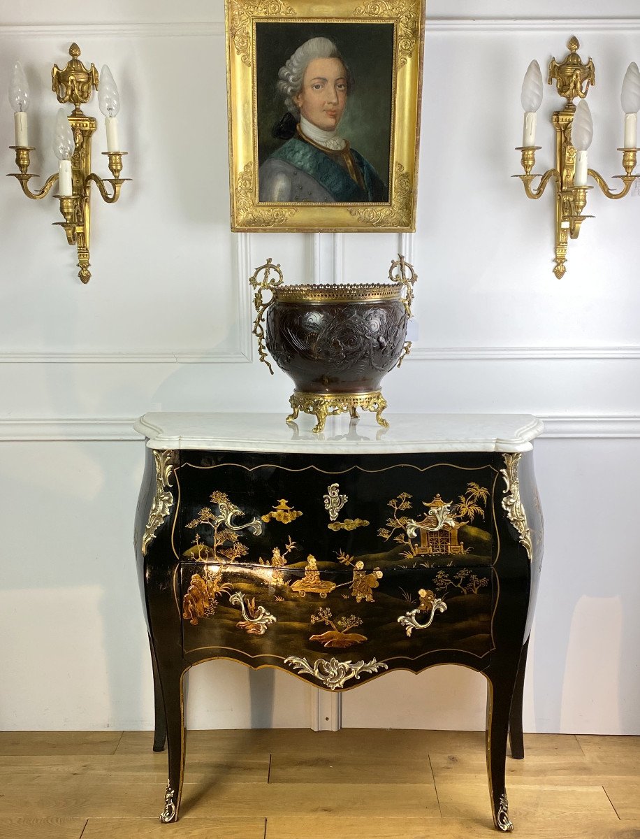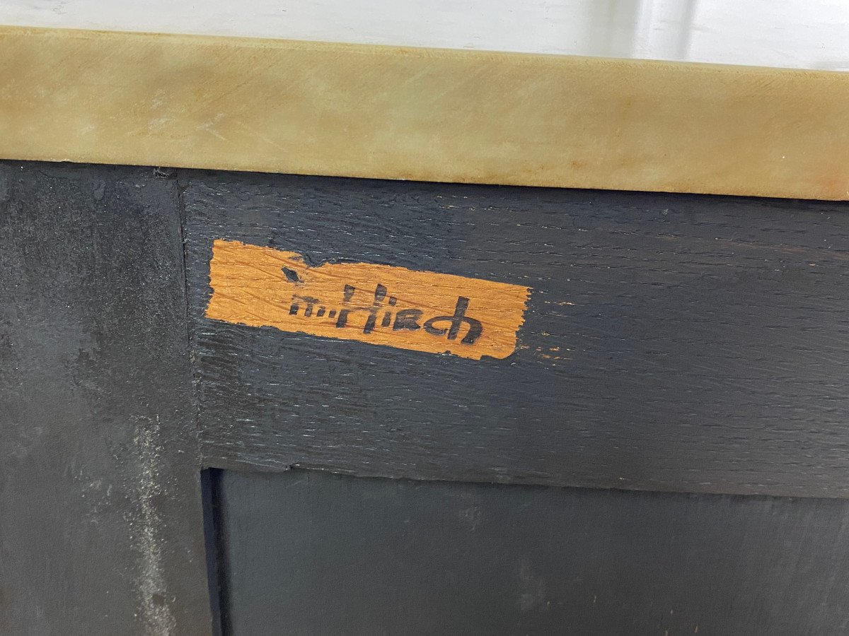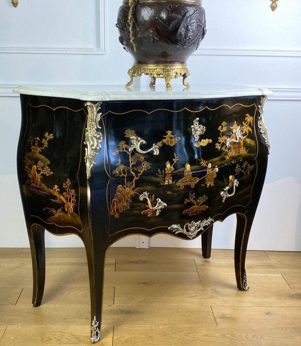 COMMODE GALBÉE ESTAMPILLÉE » M. HIRSCH 1831 / 1896 » EN LAQUE DE CHINE ORNÉE DE BRONZE DORÉ AVEC DESSUS MARBRE BLANC