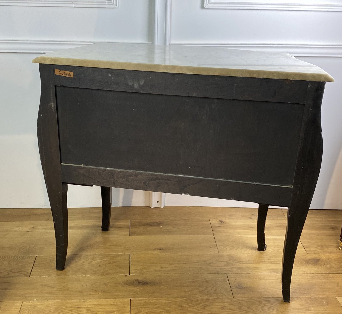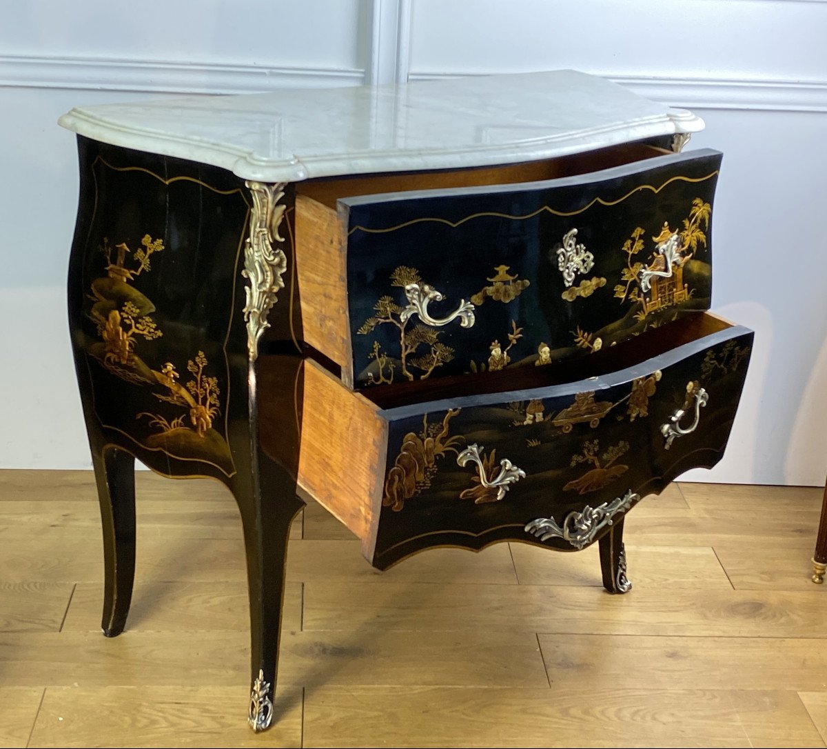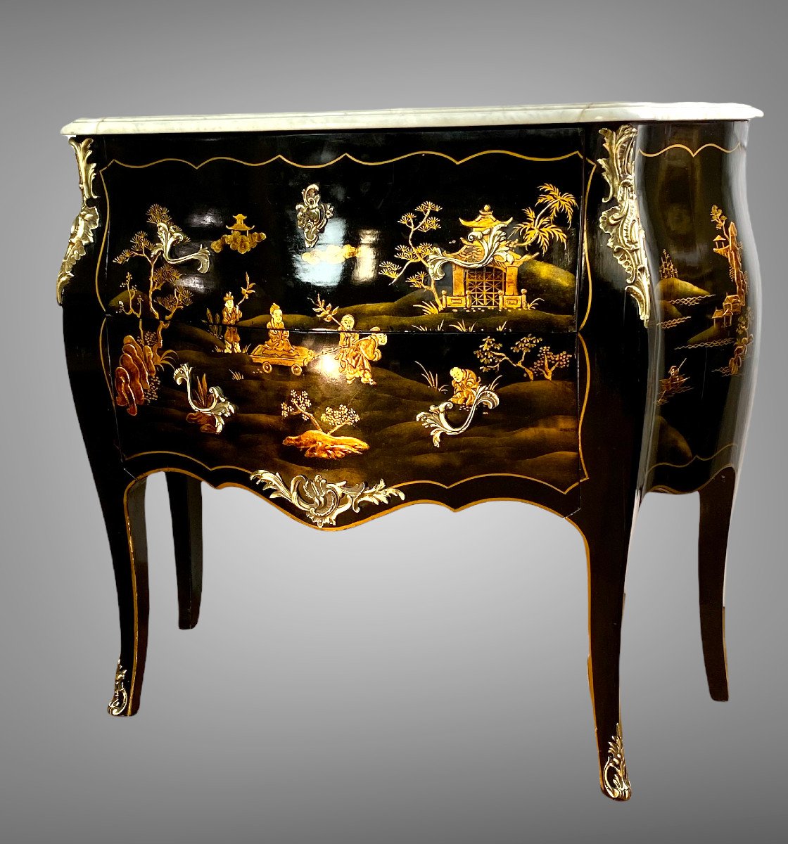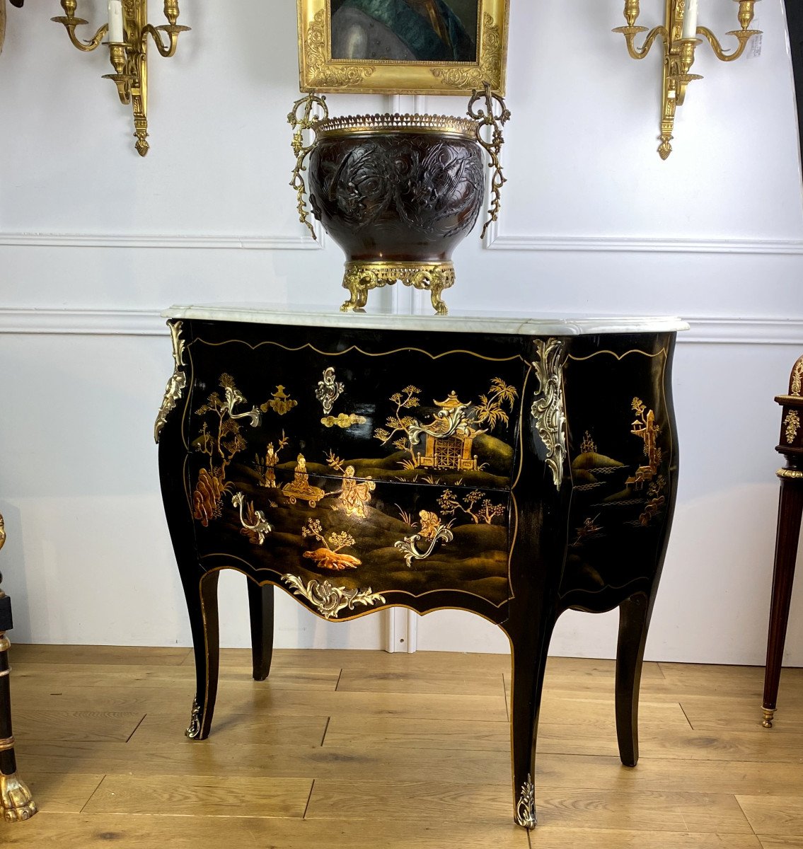 COMMODE GALBÉE ESTAMPILLÉE » M. HIRSCH 1831 / 1896 » EN LAQUE DE CHINE ORNÉE DE BRONZE DORÉ AVEC DESSUS MARBRE BLANC