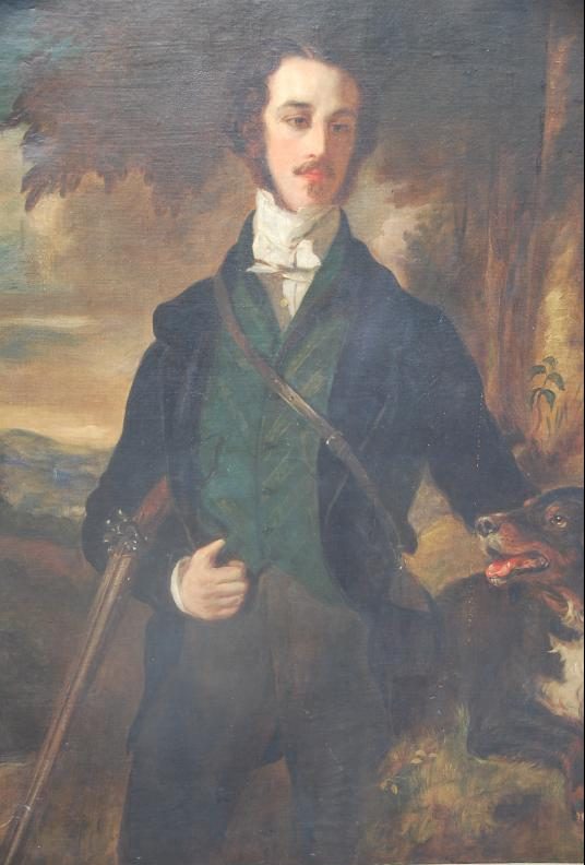 Beau et grand portrait représentant un chasseur et son chien dans un paysage anglais