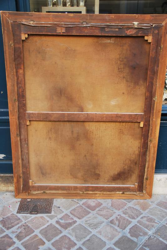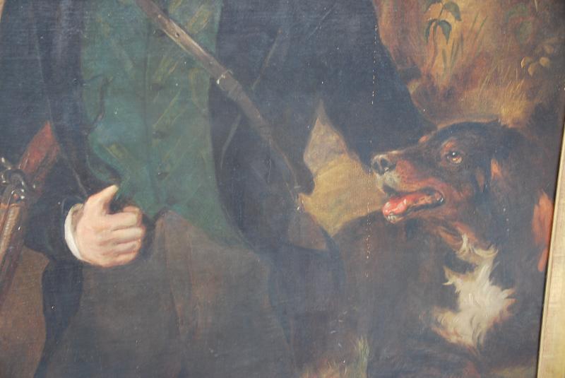 Beau et grand portrait représentant un chasseur et son chien dans un paysage anglais , beau rendu ,joli camaieu de couleurs, le personnage représenté a « fière » allure !! on peut attribuer cet élégant portrait à THOMAS LAWRENCE ou à ses suiveurs, la toile est présentée dans vieux vernis jauni , petit accident en haut , le tableau sera vendu restauré et « décrassé »….