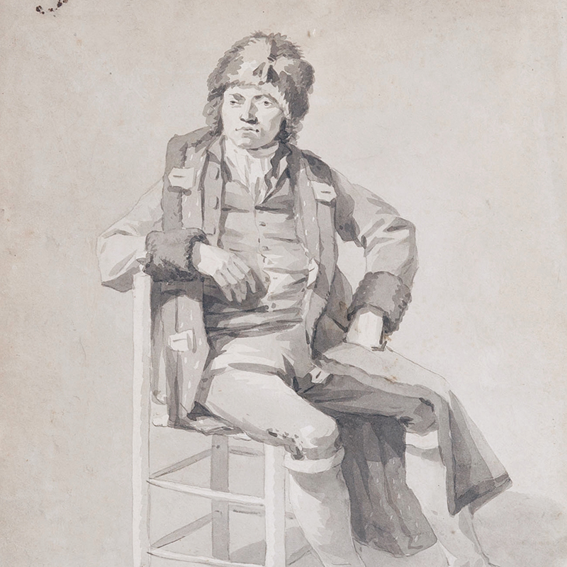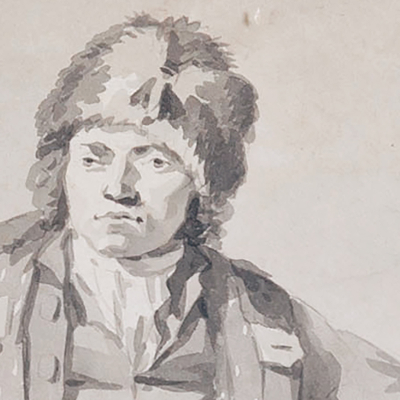 La proximité physiognomonique avec l’iconographie bien établie de Tadeusz Kościuszko est particulièrement frappante. Après sa libération en 1796 et son départ ultérieur pour l’Europe occidentale, plusieurs effigies importantes furent réalisées, parmi lesquelles le célèbre portrait peint par Benjamin West en 1797. Le présent dessin s’inscrit dans cette tradition visuelle par ses traits caractéristiques, son bonnet de fourrure et son regard intense et résolu. Bien que l’identification ne puisse être formellement confirmée, cette œuvre constitue un exemple rare et convaincant du portrait français postrévolutionnaire, alliant résonance historique et force expressive inhabituelle. Des œuvres de cette qualité et de ce caractère apparaissent rarement sur le marché.