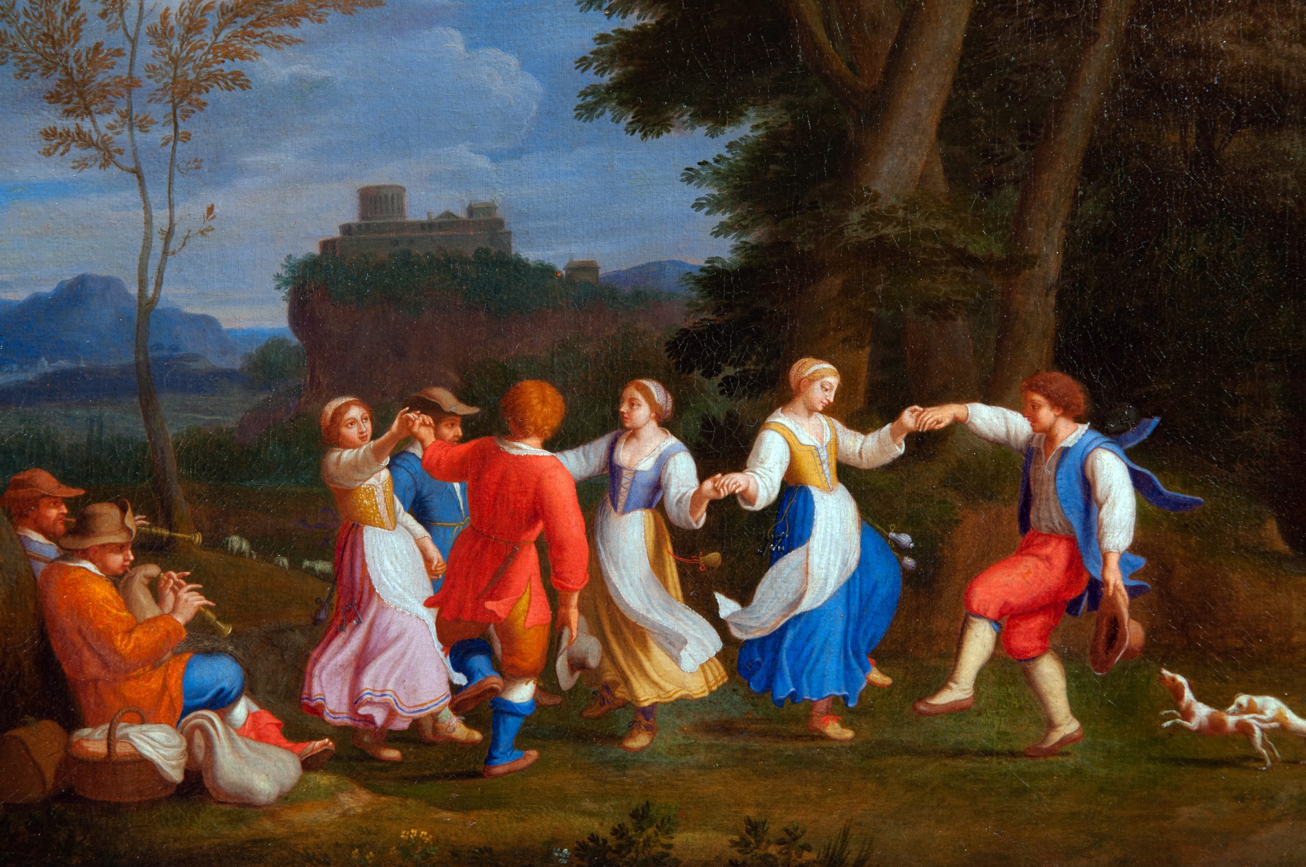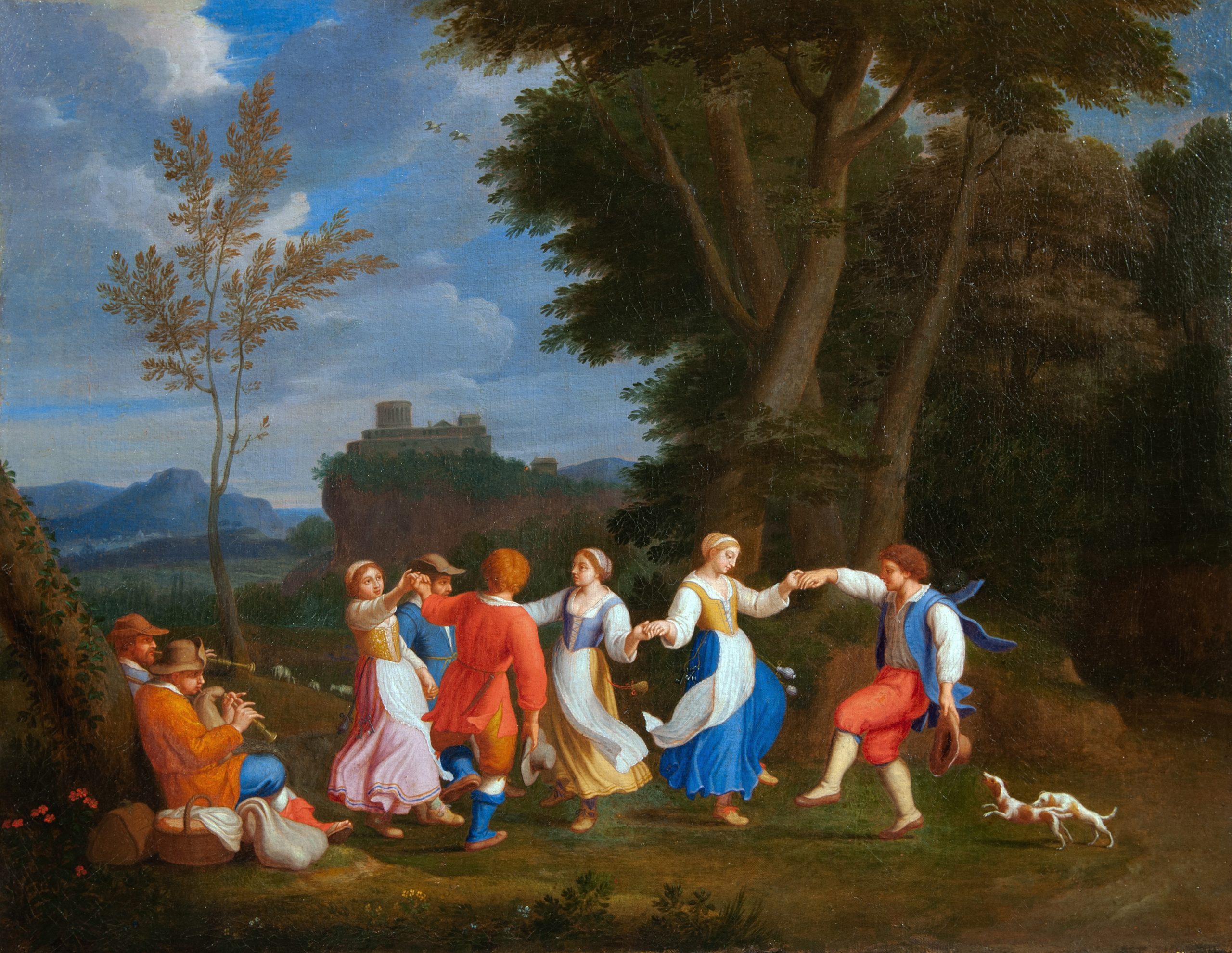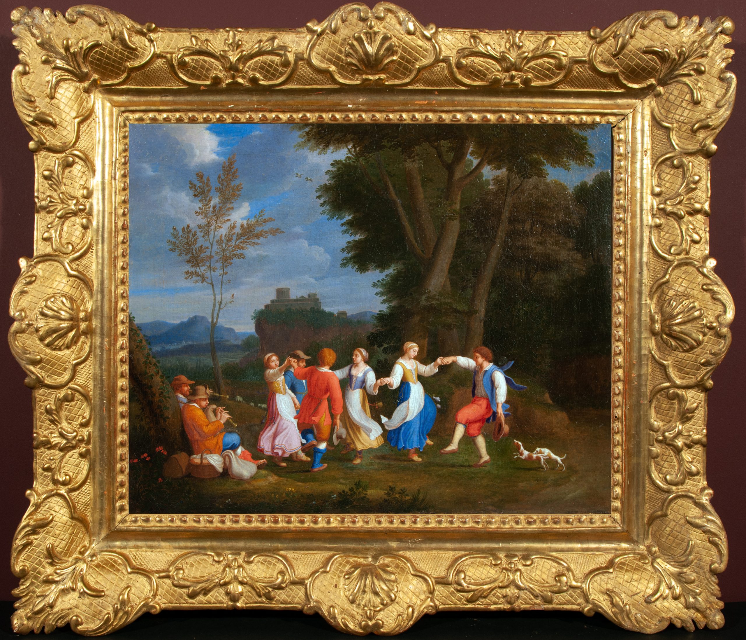 Ce très charmant tableau exécuté vers 1650, représente des couples de villageois dansant au son de la cornemuse dans un paysage vallonné et verdoyant.
