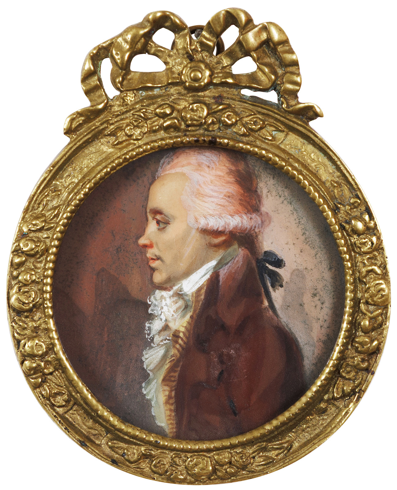 Cette miniature finement exécutée représente un jeune gentilhomme de profil, traité avec l’élégance et la précision caractéristiques du portrait français de la fin du XVIIIᵉ siècle. Sa chevelure poudrée, nouée à la nuque par un ruban noir, et son habit raffiné — avec une haute cravate et une veste aux tons profonds — reflètent les modes aristocratiques de l’époque. La composition est enrichie par le modelé délicat des traits du visage et la douceur des tonalités de fond.