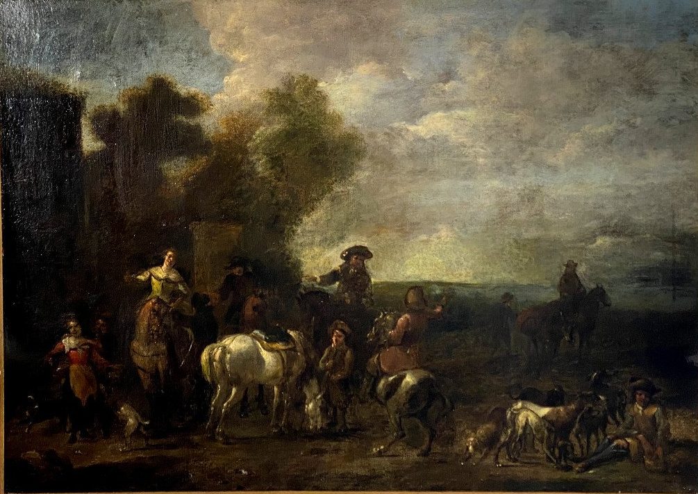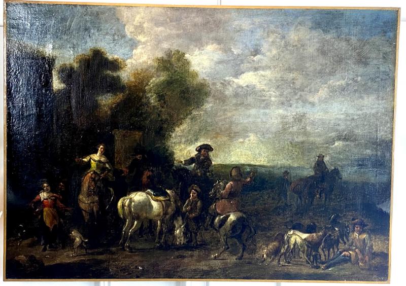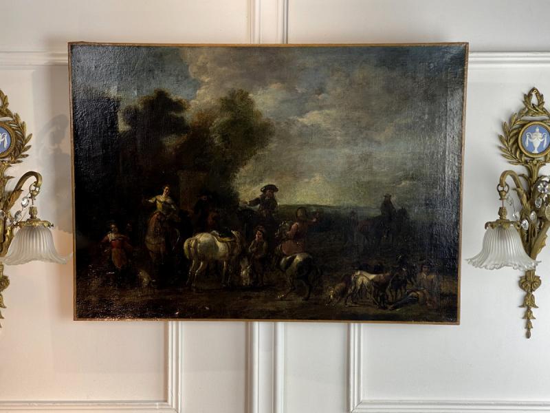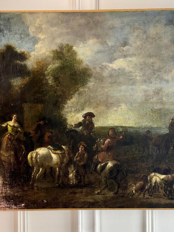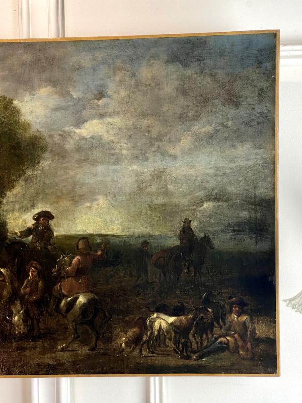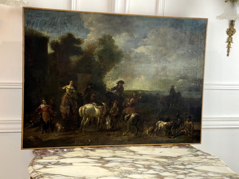 ÉCOLE HOLLANDAISE DU 17eme / PEINTURE / HUILE SUR TOILE RENTOILÉ » HALTE , JOUR DE CHASSE »