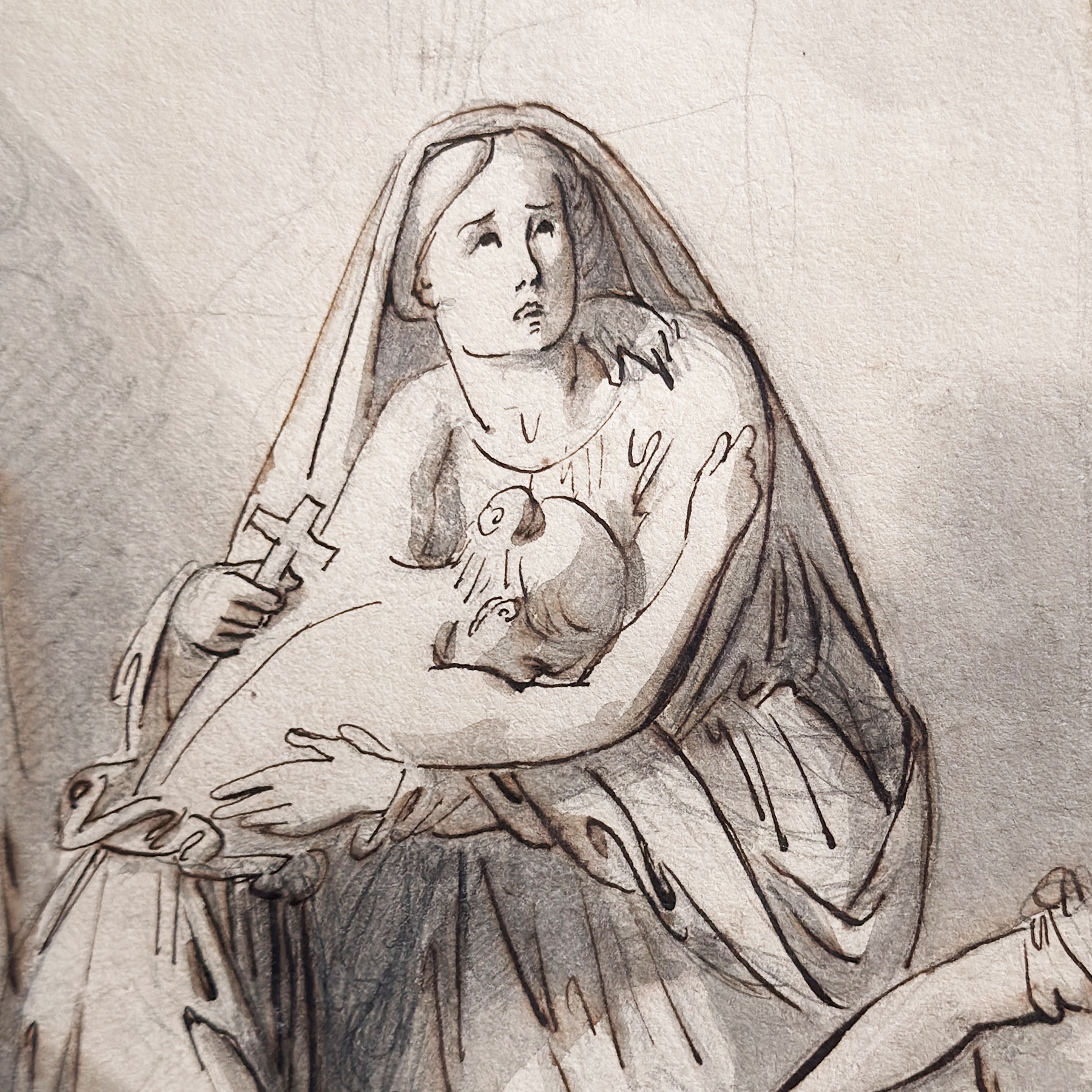 Il est particulièrement significatif qu’un second dessin, très proche et de la même main, soit connu, identique dans sa composition mais différent par un détail décisif : dans cette autre version, la mère ne tient pas de croix. Ce changement transforme profondément le sens de la scène. En supprimant le symbole religieux explicite, l’artiste déplace l’image d’un récit confessionnel vers une méditation universelle sur la souffrance, la perte et la résistance morale — une tragédie qui dépasse tout cadre historique ou religieux précis.