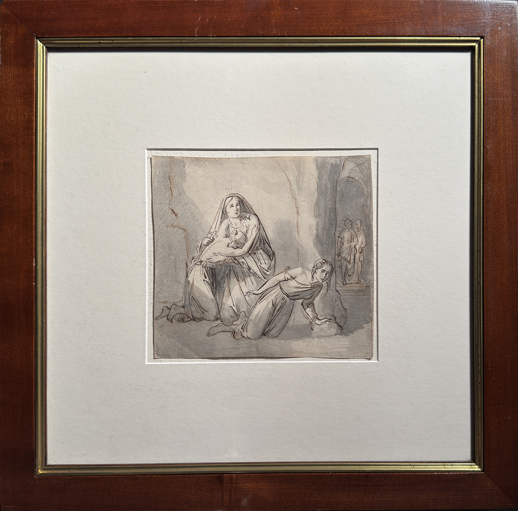 Les recherches récentes permettent d’attribuer avec assurance ce dessin à Giacinto Massola, l’un des peintres italiens les plus intellectuellement raffinés du milieu du XIXᵉ siècle. Formé à l’Accademia Ligustica de Gênes, Massola manifesta un intérêt constant pour les sujets religieux, dantesques et historiques. Sa formation associe rigueur académique et sensibilité croissante aux thèmes romantiques, une synthèse qui caractérisera pleinement son œuvre de maturité.