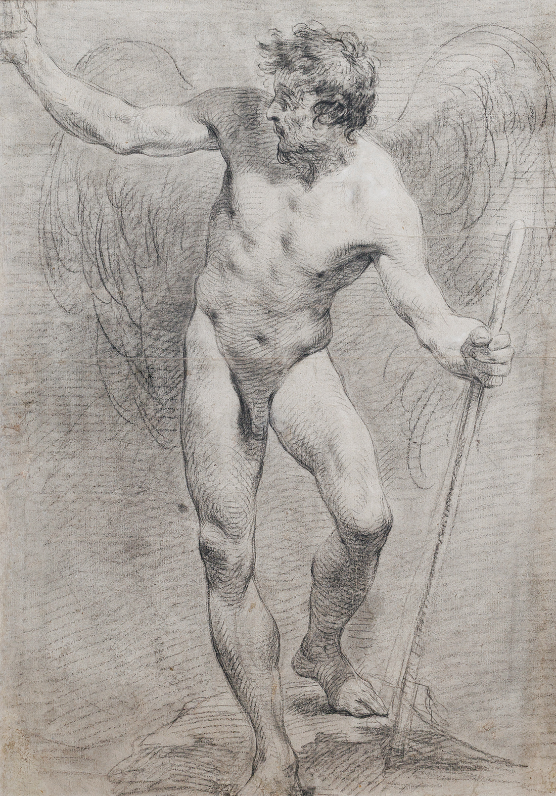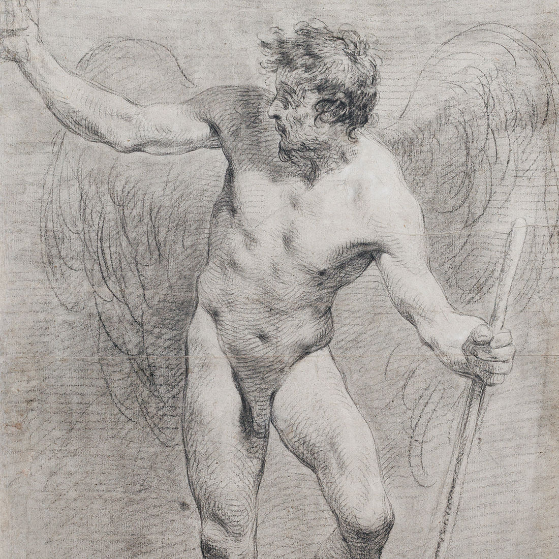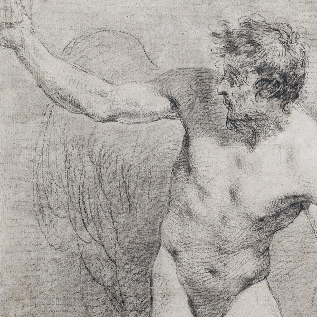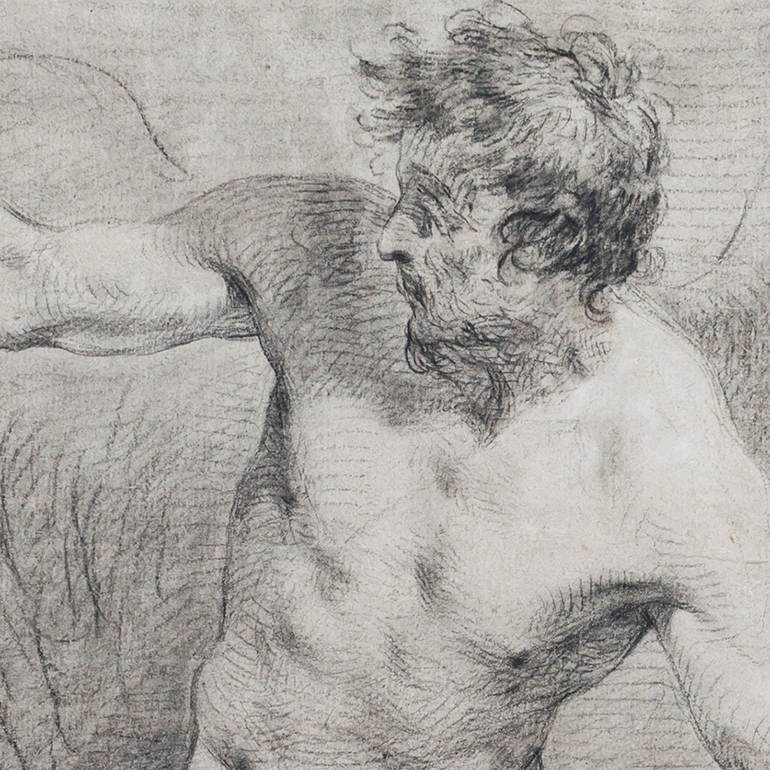 Lorsque j’ai découvert ce dessin lors d’une vente aux enchères, j’ai été immédiatement frappé par la manière dont l’artiste avait rendu le visage et la chevelure de la figure. Ce procédé m’était familier. La tête est vue d’un point de vue légèrement surélevé, ce qui permet à la courbe douce du front de trouver un écho dans la ligne parallèle de l’œil ; la chevelure suit le même rythme, renforçant la composition. Bien sûr, un tel procédé se rencontre chez de nombreux artistes, mais pour moi il était surtout associé à François Lemoyne, le grand peintre français de la première moitié du XVIIIe siècle. Venait conforter cette première impression la conception même de la figure masculine — une Allégorie du Temps ; des compositions similaires apparaissent dans le riche corpus de dessins de Lemoyne conservés au Louvre (voir la base Joconde).