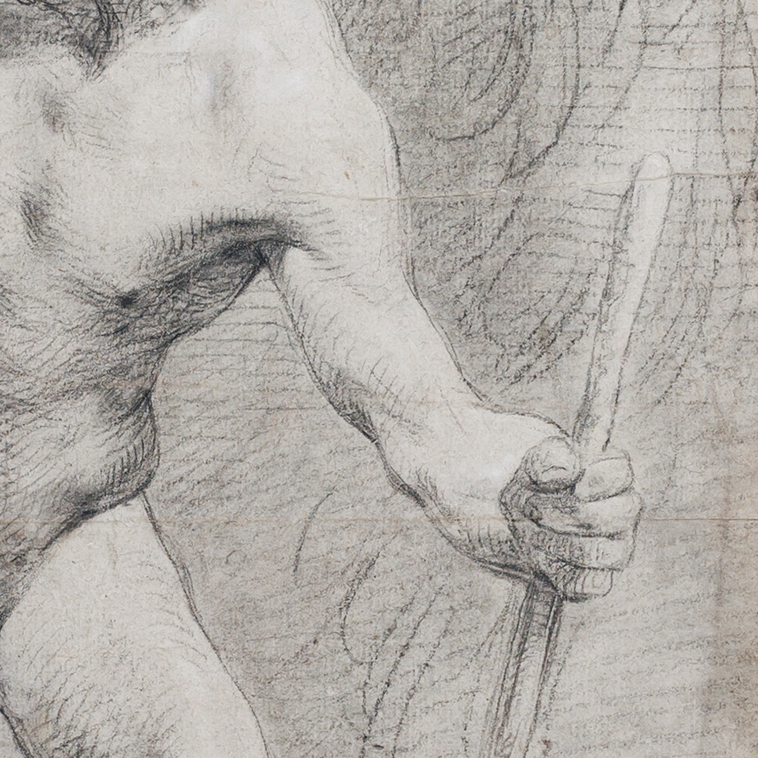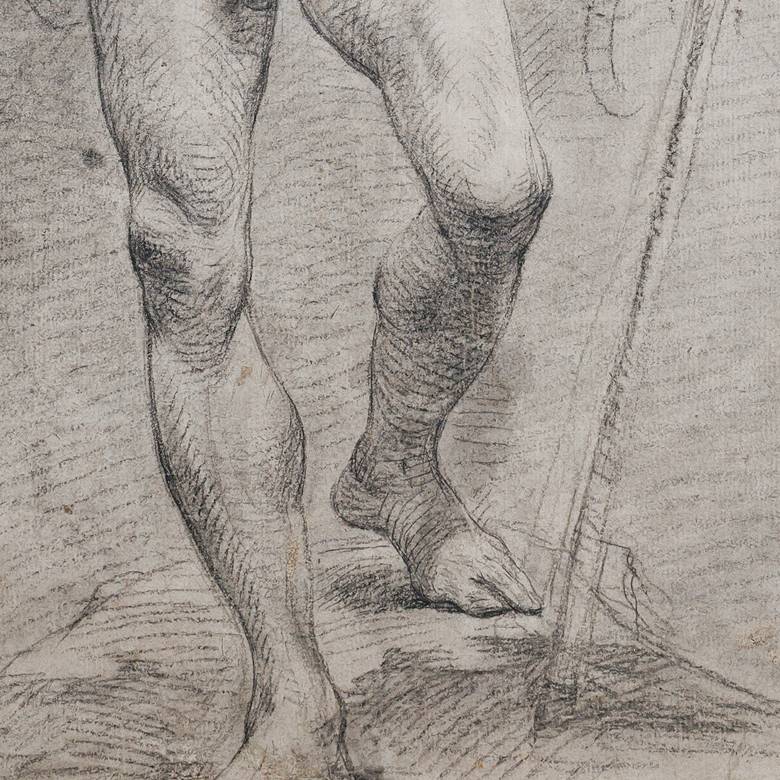 Un autre facteur important orientant vers Lemoyne comme auteur possible de la feuille est l’usage caractéristique des hachures croisées pour rendre le volume. Ce procédé, qui reflète une solide formation académique, n’est pas très courant ; parmi les grands maîtres (et en l’occurrence la haute qualité d’exécution ne fait aucun doute), il est employé de manière constante chez Lemoyne. Pris ensemble, ces éléments justifient une attribution du dessin à François Lemoyne ou à un artiste de son cercle.