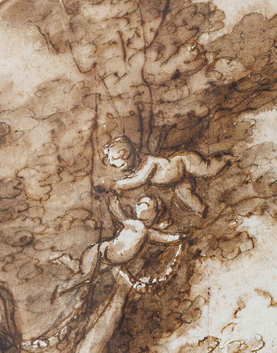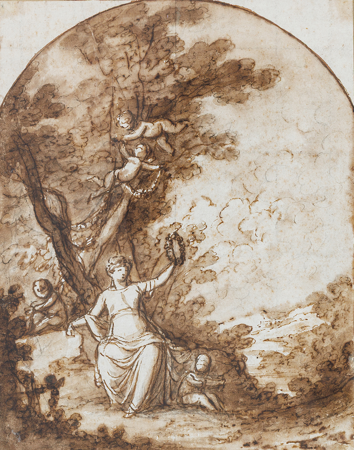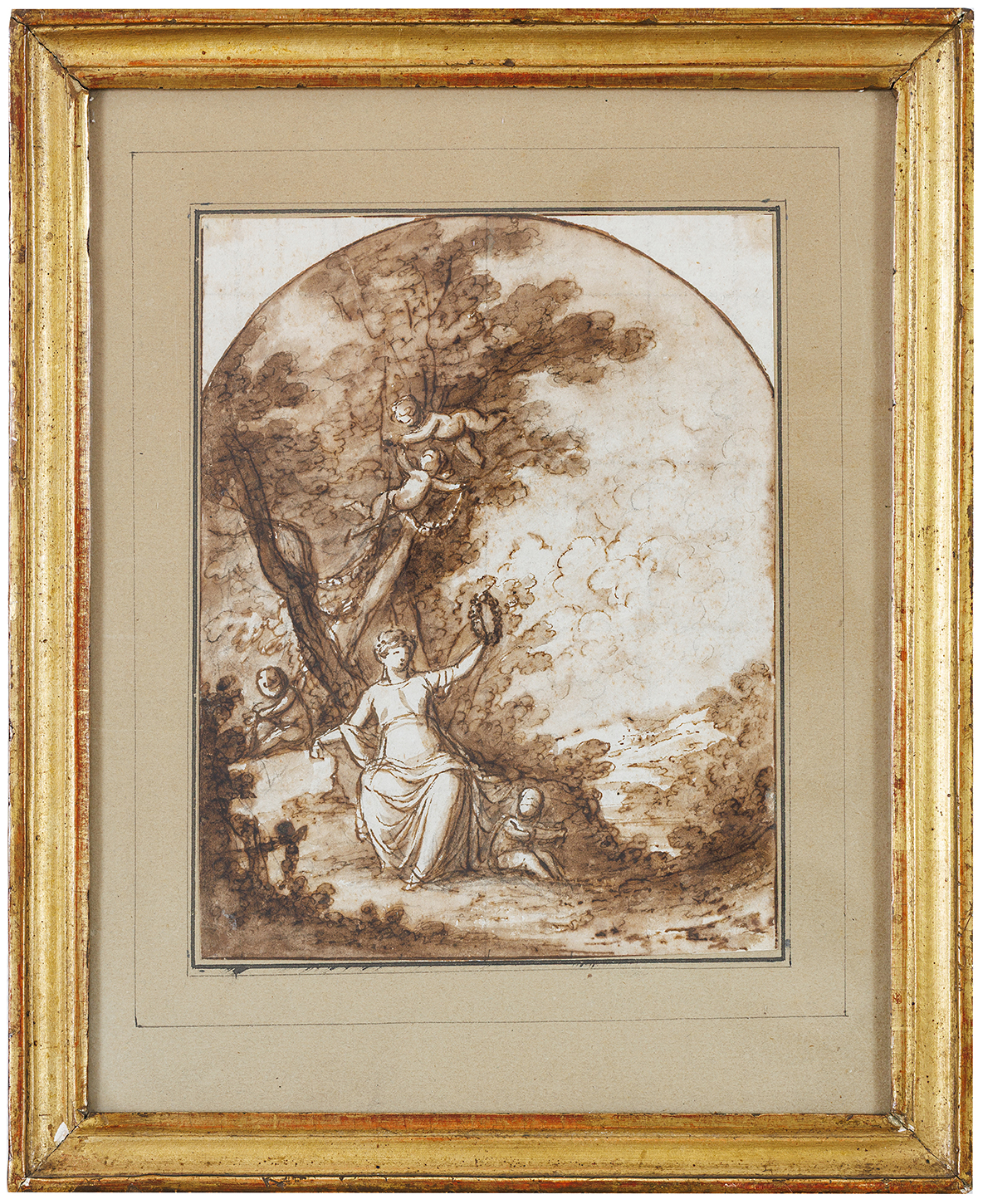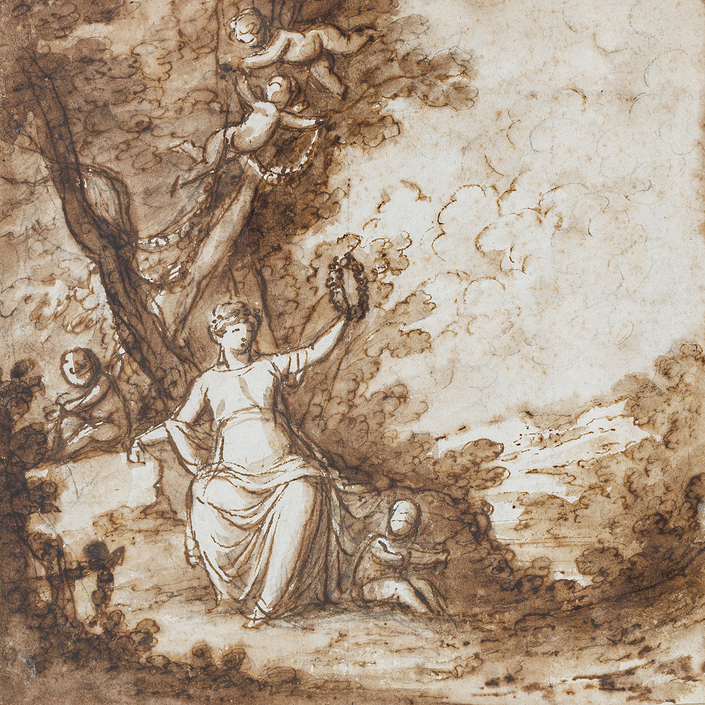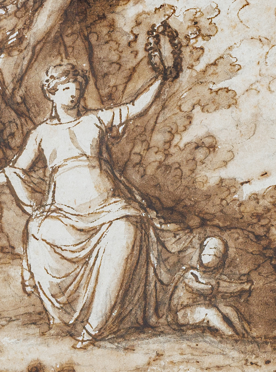Le dessin présenté ici, délicatement exécuté à l’encre brune et au lavis sépia, montre une figure féminine assise, levant une couronne de laurier – symbole traditionnel de la Gloire. Autour d’elle, des putti espiègles peuplent un paysage idyllique, dont l’un, perché sur un arbre, lui tend une seconde couronne. La composition équilibrée et la touche fluide en font une œuvre emblématique du langage néoclassique lombard.