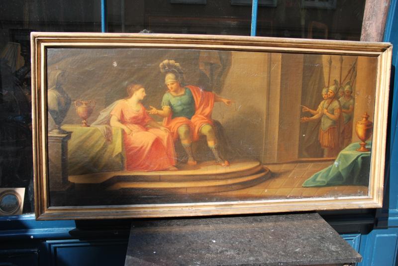 Grande huile sur toile de forme rectangulaire représentant les Adieux d Hector et d’Andromaque, la toile est d’origine, dans son ancien vernis avec quelques petits accidents et manques, néanmoins grand sujet très décoratif, travail de la fin du XVIII.