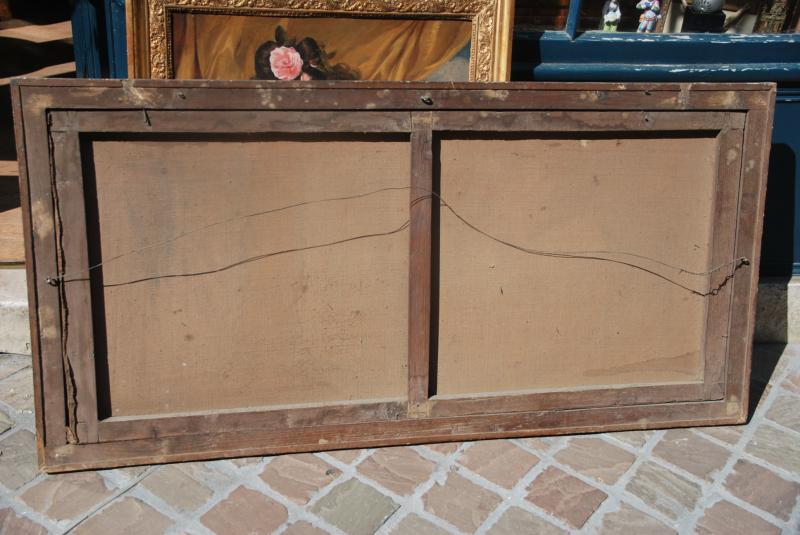 D’après la célèbre scène de la guerre de Troie , la toile est présentée dans une large baguette en bois et stuc doré.