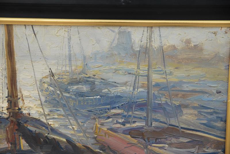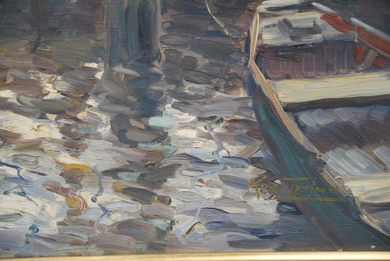 Huile sur toile représentant barques et bateaux à rames , l’oeuvre bien composée avec des couleurs »chaudes » est signée Kees Terlouw 1890 1948 est un artiste actif en France et au Pays Bas , il est souvent admiré pour sa palette et une interprétation impressionniste de la lumière , les ombres et les reflets , le tableaux présenté , ici , en est un bon exemple , il est surtout connu pour ses scènes de port et les paysages urbains , il peint souvent des canaux qui passent dans les petites villes ,