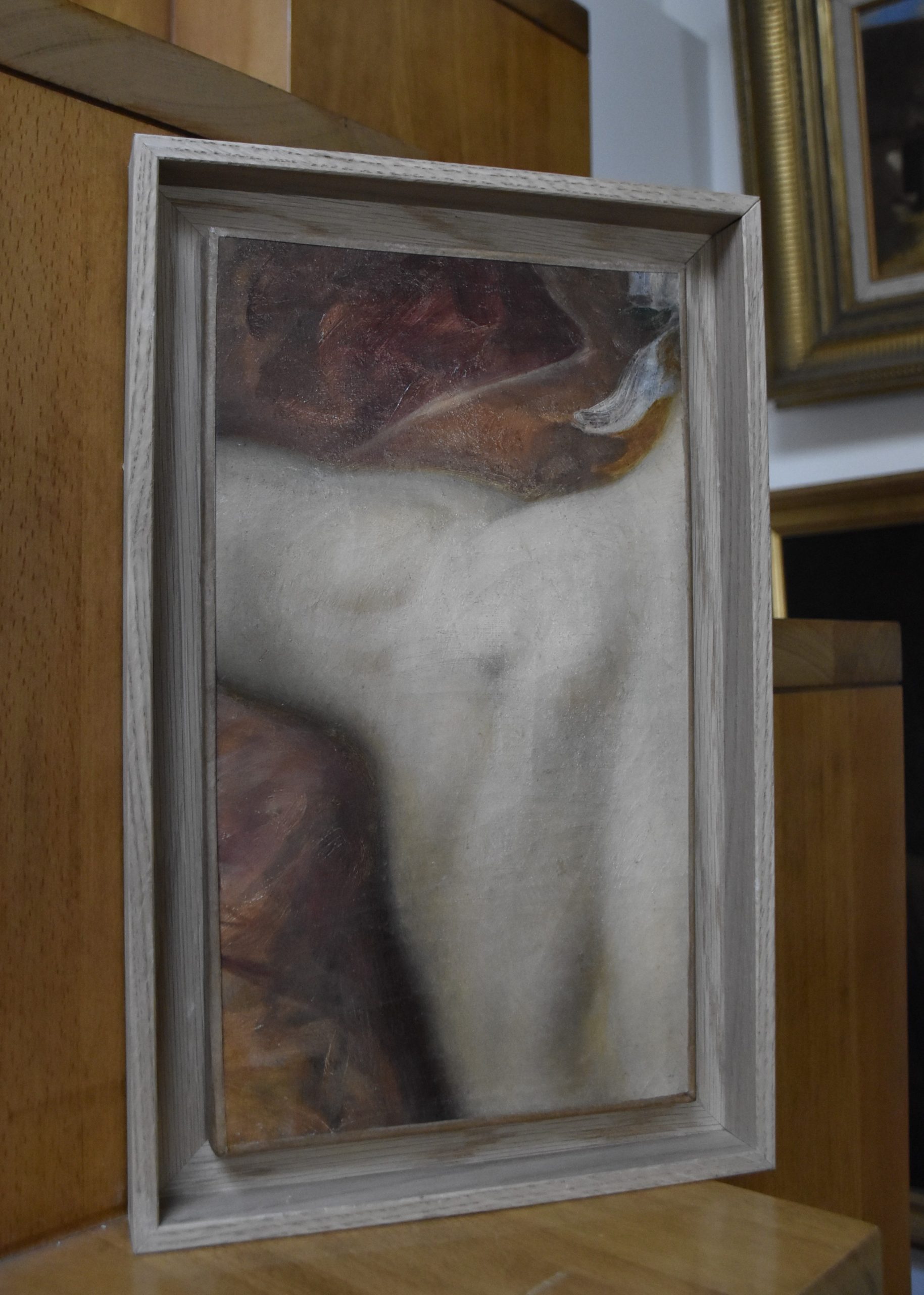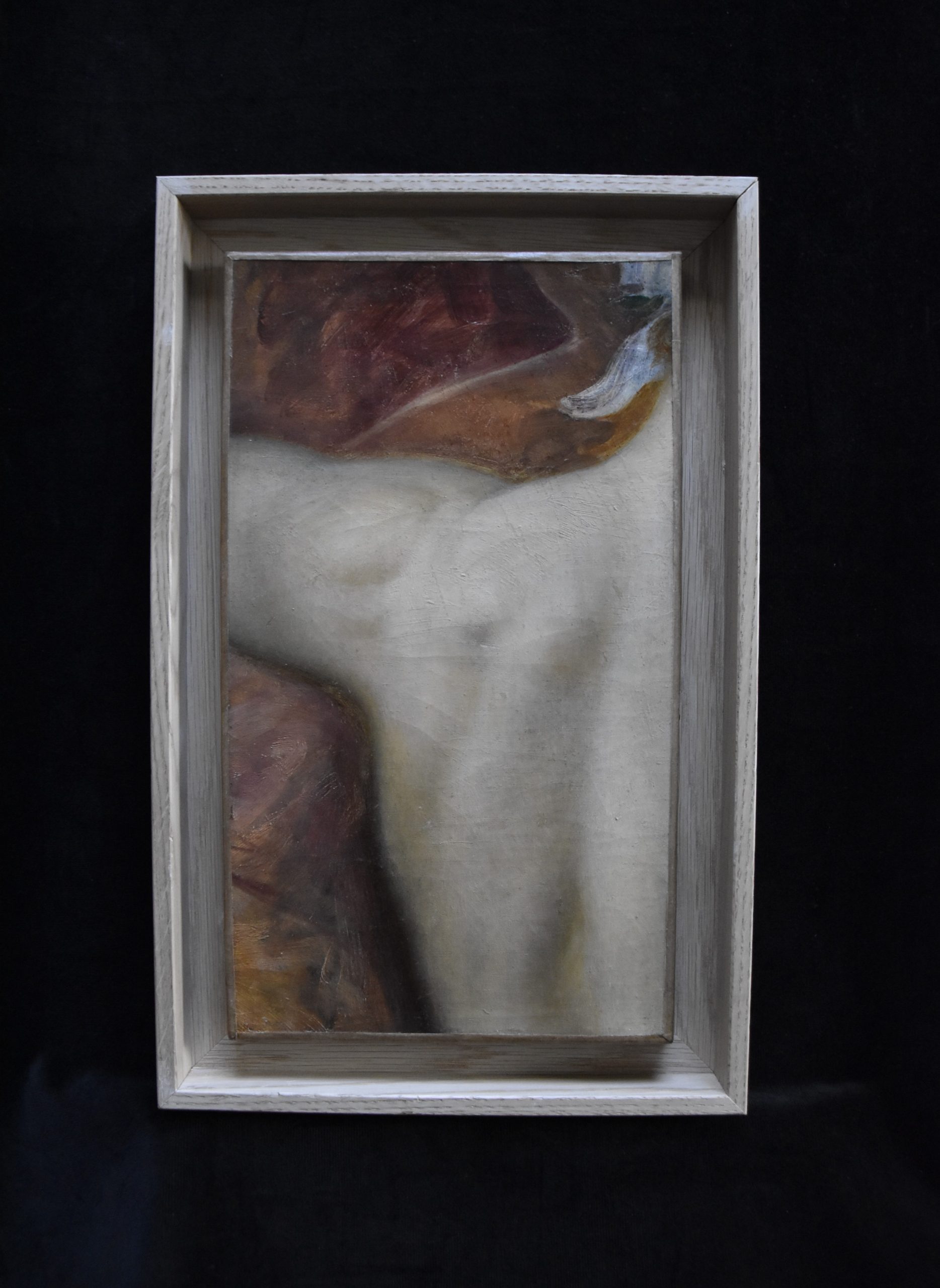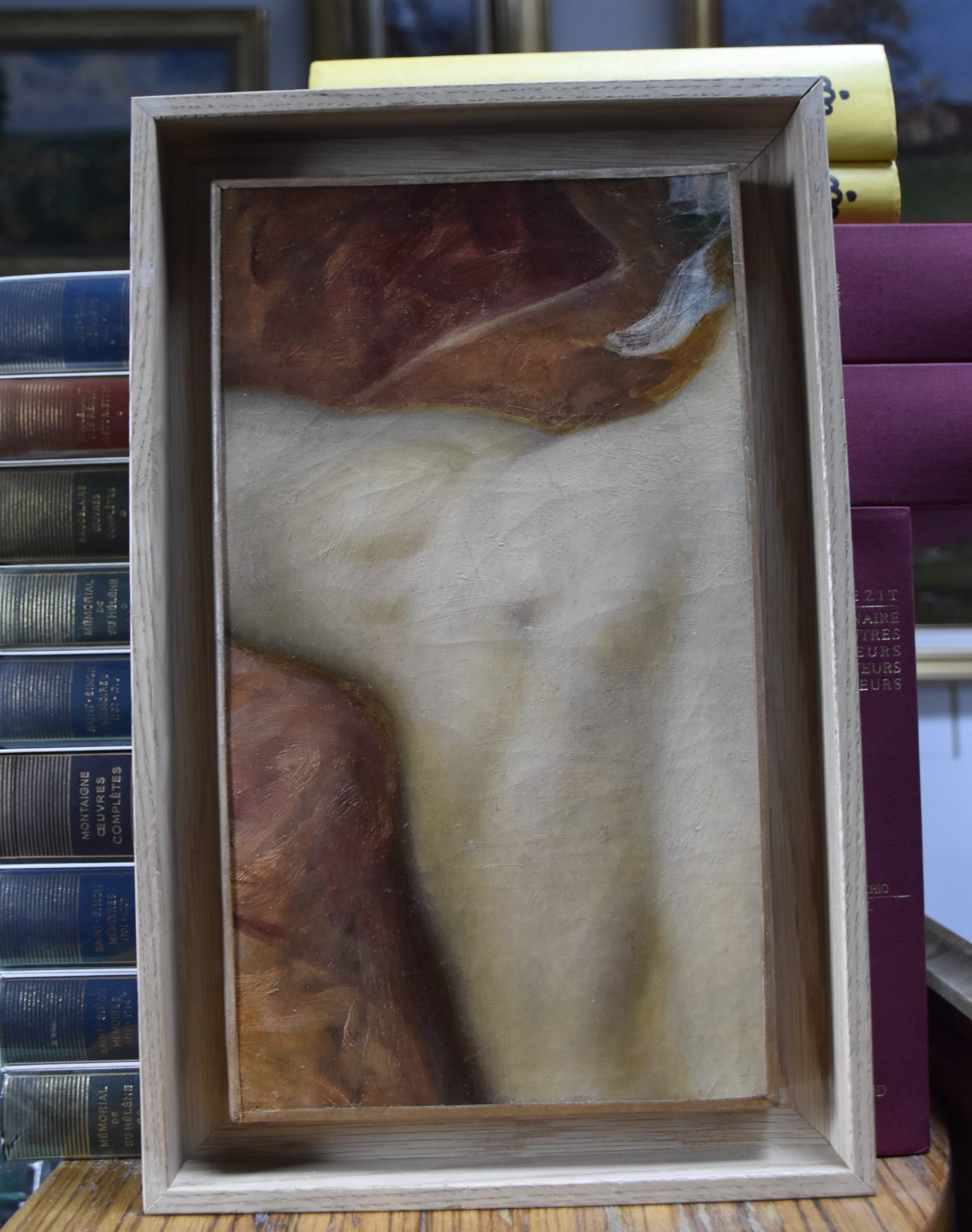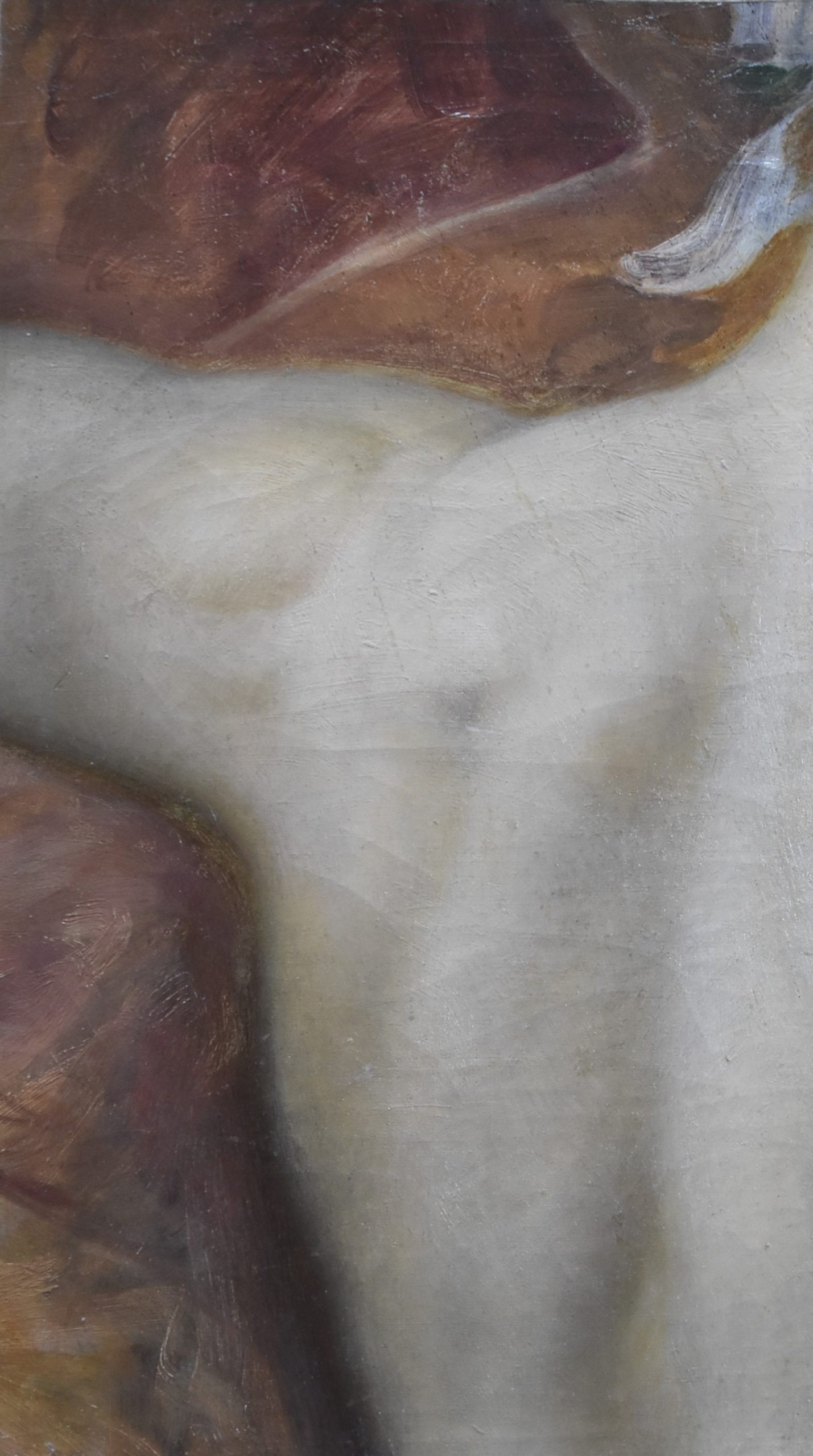 Cette très intéressante étude à l’huile faisait partie d’un ensemble conservé par l’artiste. Il avait étudié des fragments d’anatomie à la fois pour les utiliser comme modèles dans de grandes compositions mais probablement aussi parce qu’il représentait autant de fragments. Il est clair que ce fragment d’anatomie a un pouvoir de suggestion et sert de relais à l’imaginaire du spectateur, qui est amené à imaginer le reste du corps pris comme modèle.