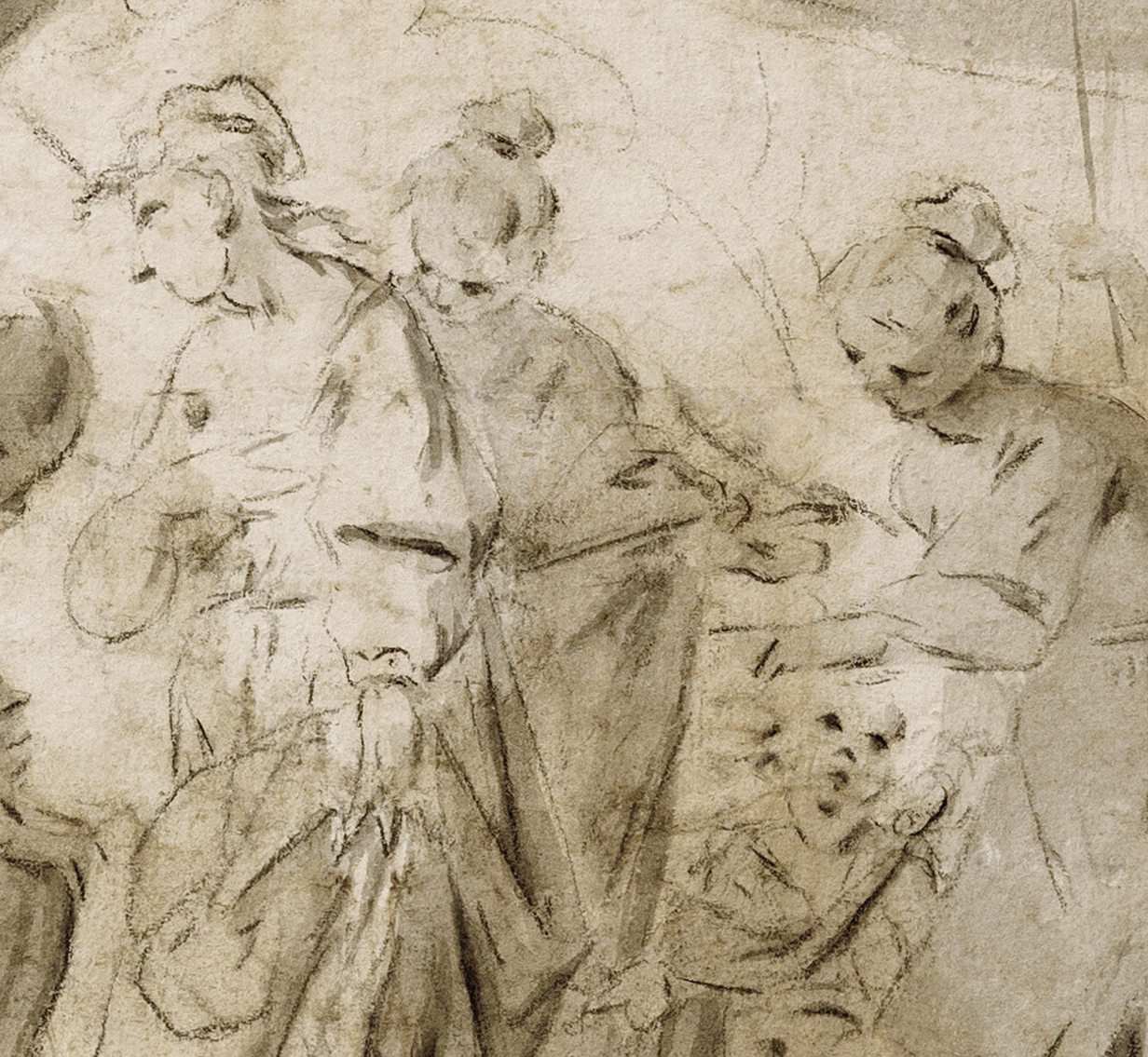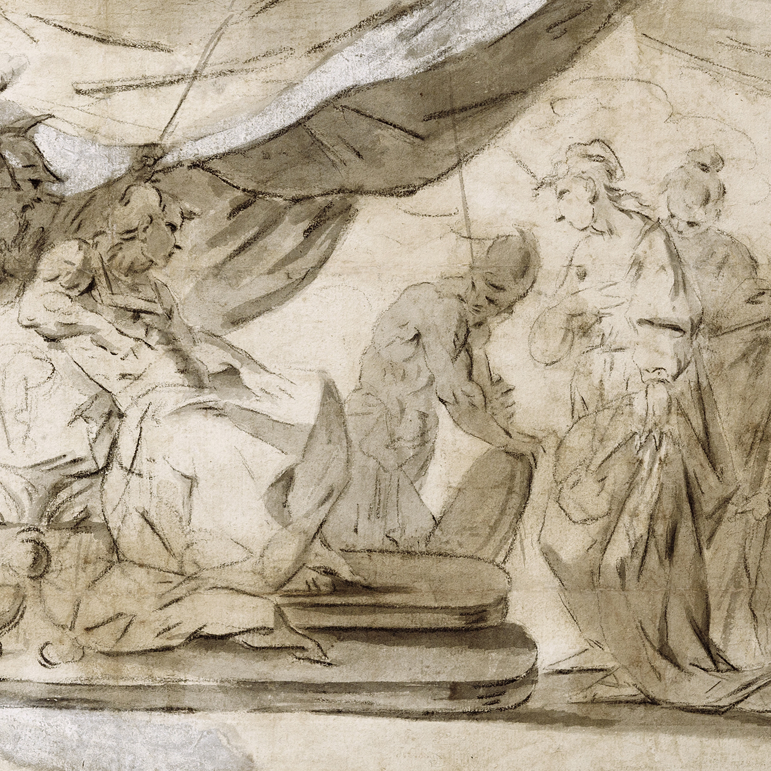 Cette approche se retrouve pleinement dans le dessin illustrant la rencontre d’Alexandre le Grand et Roxane. Issu de la collection de Johan Conrad Spengler (1767–1839), directeur du Musée et de la Galerie des Tableaux de Copenhague et grand collectionneur de l’art graphique français du XVIIIe siècle, le dessin quitta le Danemark au début du XXe siècle et se retrouva ensuite dans des collections françaises et belges.