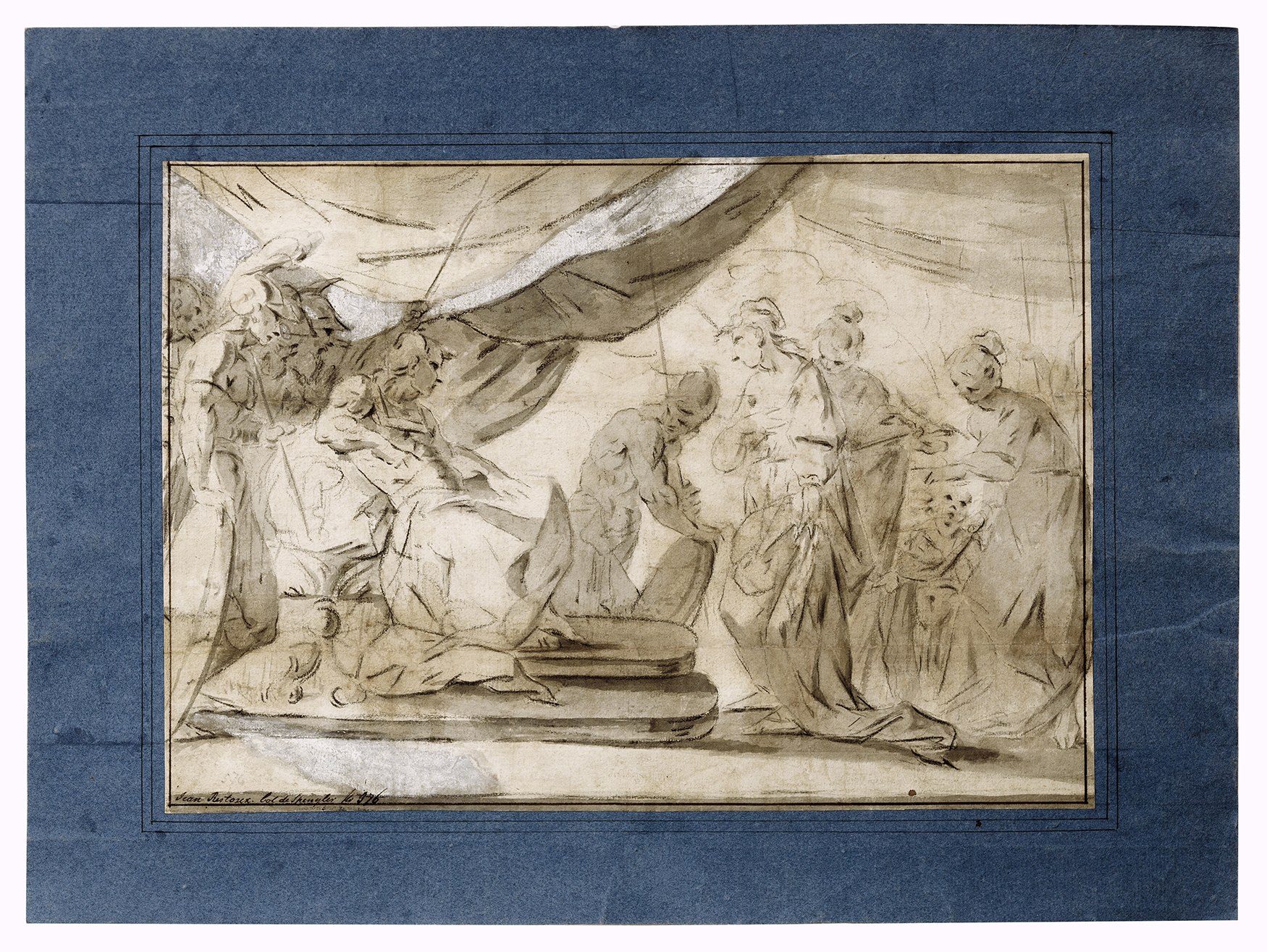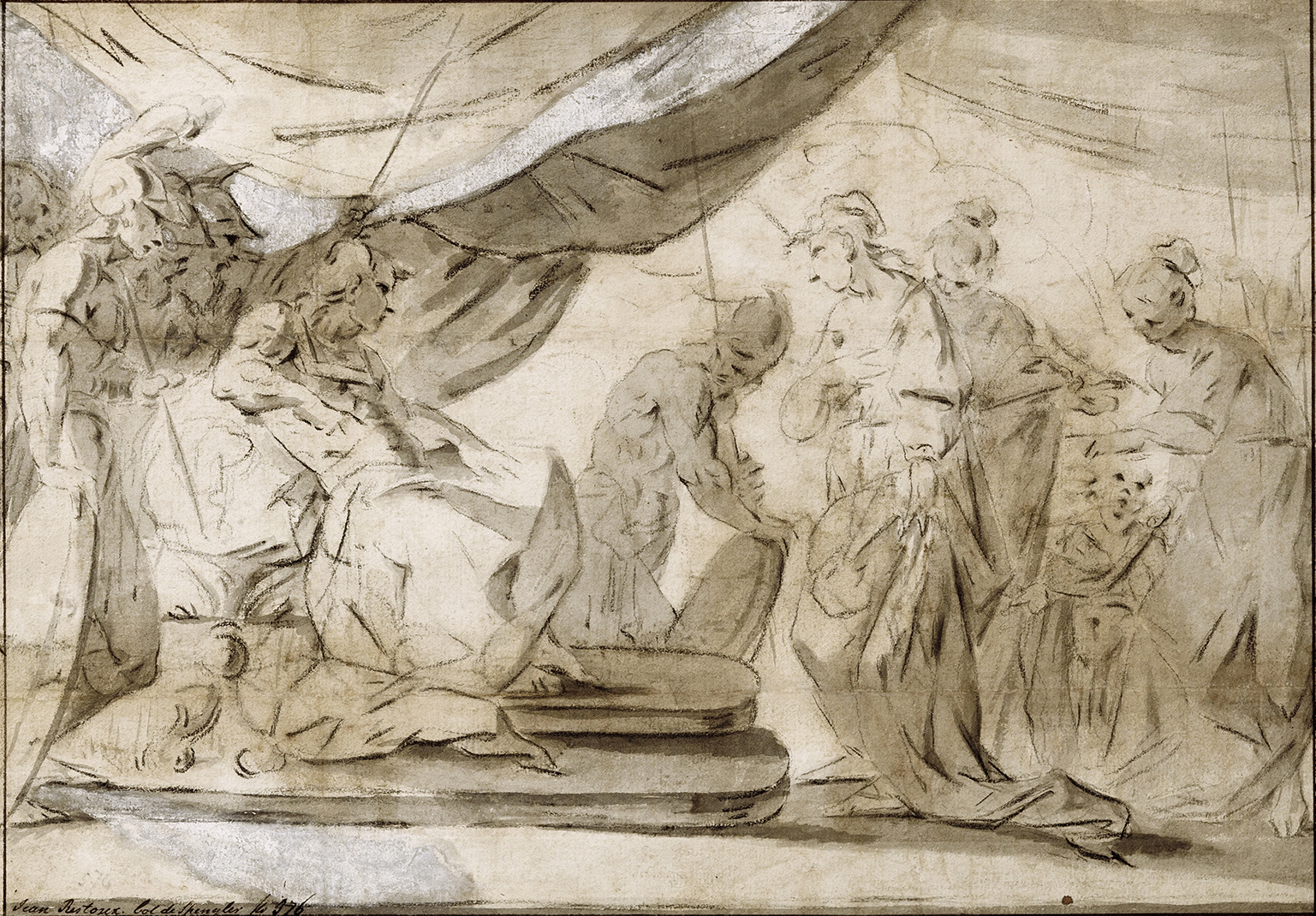 Le dessin de Restout peut être daté des années 1730–1740, période durant laquelle il réalisa une paire de dessus-de-porte illustrant la vie d’Abdalonymos, commandée par le duc de Chevreuse (aujourd’hui conservée au Musée des Beaux-Arts d’Orléans). Ces œuvres se caractérisent par un point de vue frontal, légèrement abaissé — un procédé que l’on retrouve également dans ce dessin. De plus, l’un de ses tableaux, en particulier Abdolonyme paraissant devant Alexandre en costume royal, présente une ressemblance compositionnelle significative avec ce dessin.
