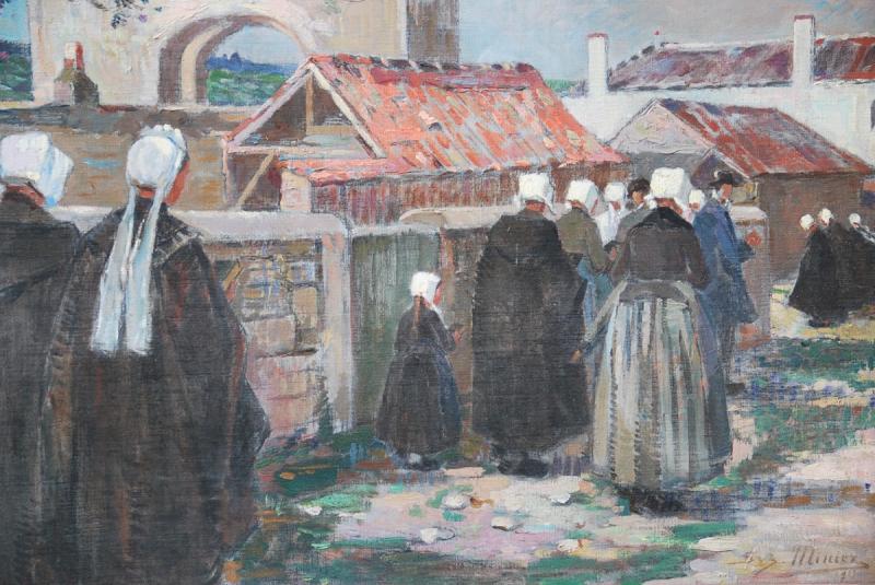 Les visites au bagne, la toile est datée 1923 signée : MINIEZ SUZ. pour Suzanne Miniez, une étiquette au dos salon des femmes peintres , le titre au crayon au dos sur le châssis,