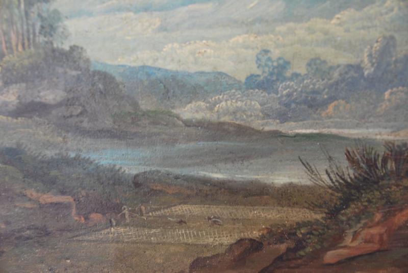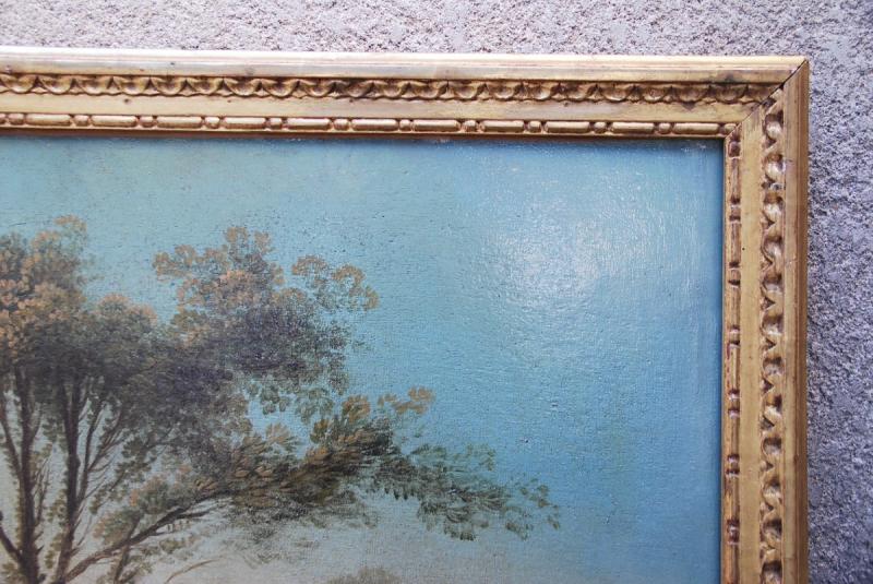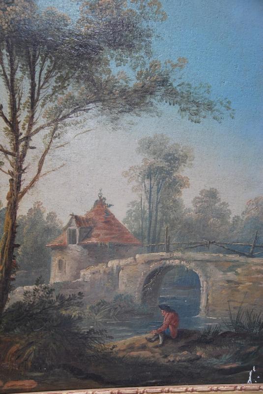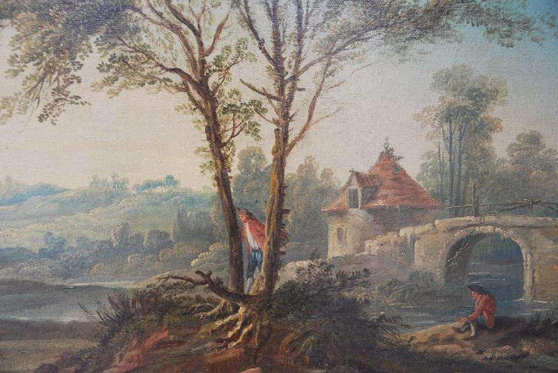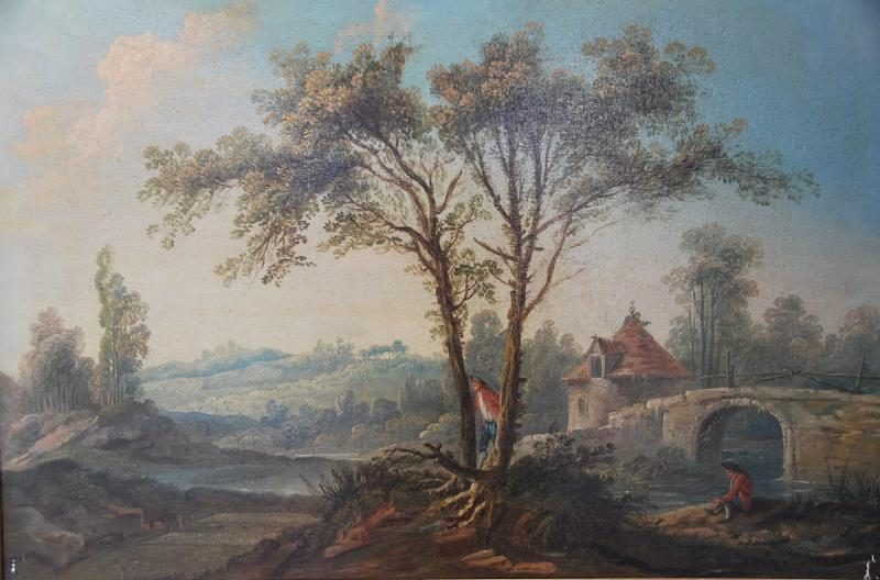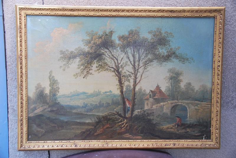 Jolie composition représentant un pigonnier près d’un pont avec un personnage assis près de la rivière , l’autre caché entre deux arbres surveillant son filet pour y attraper les palombes, cette représentation de la chasse est assez rare ….camaieu de couleurs douces . Oeuvre présentée avec son vieux vernis et sa baguette en bois doré. de style Louis XVI. Possibilité de le faire restaurer/nettoyer dans notre atelier. Cotes avec la baguette 104X73 cm