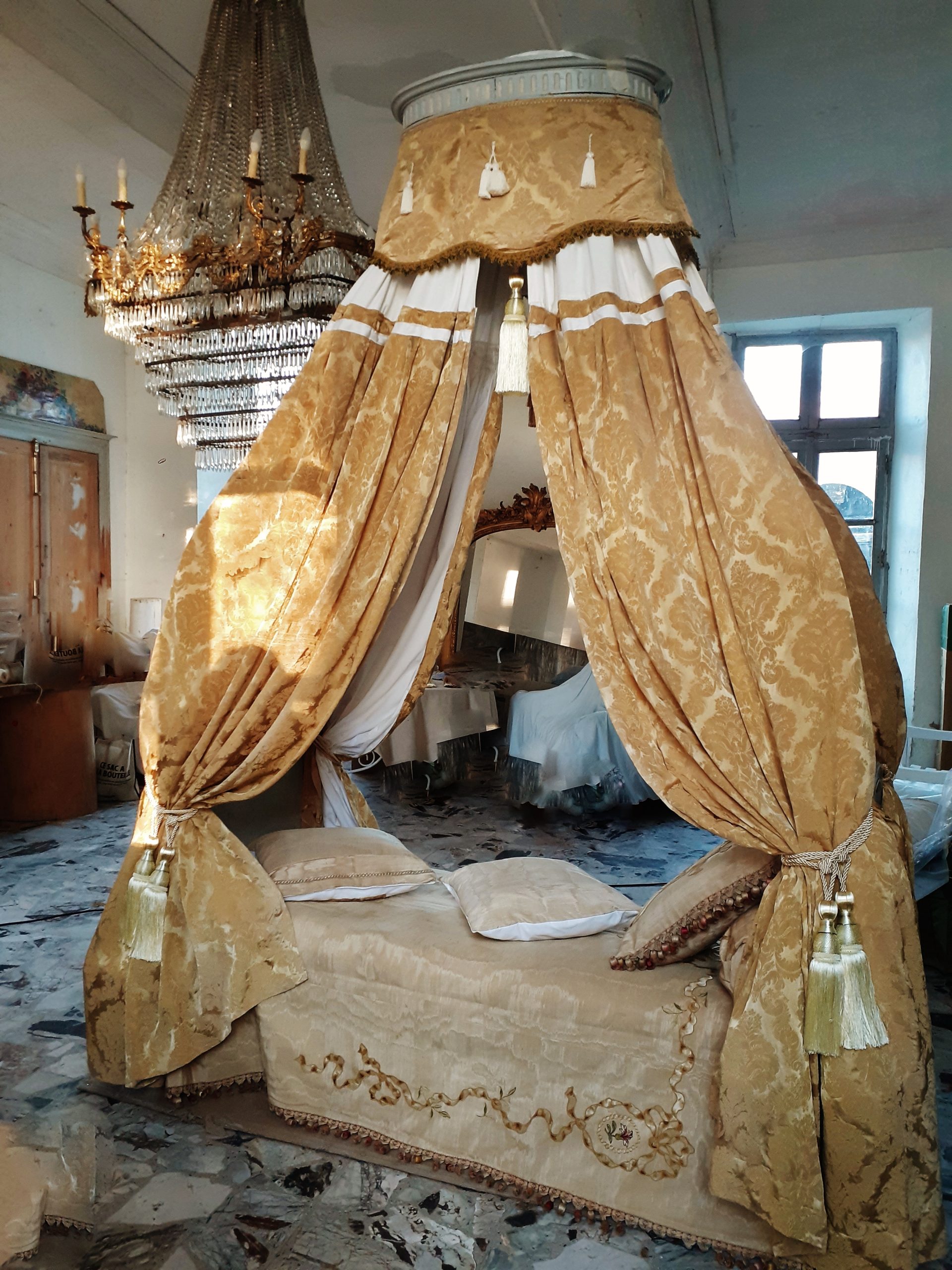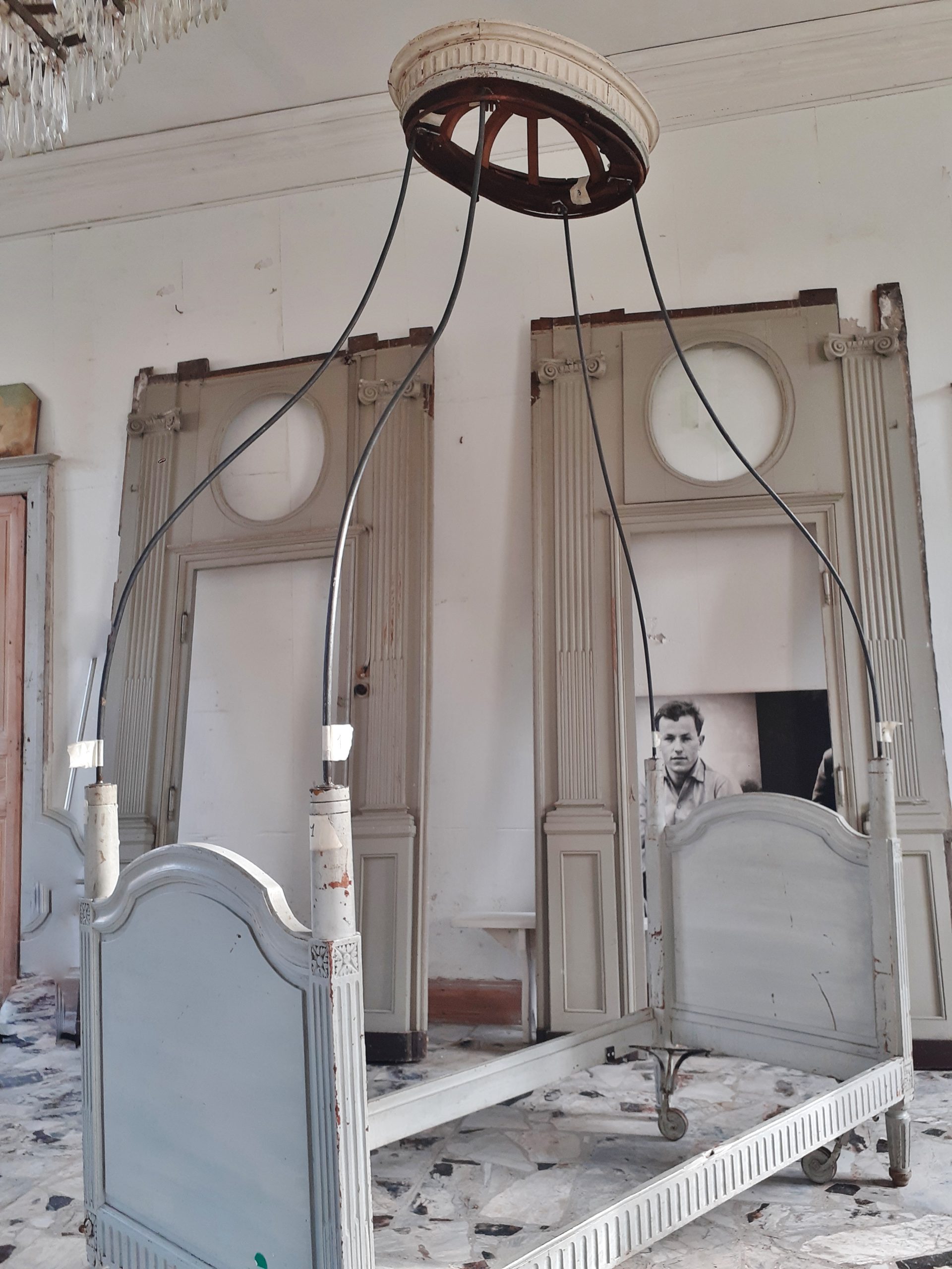 - Le dais de lit ovale présente un audacieux systéme à deux bras en fer forgé circulaires permettant de régler la hauteur –
