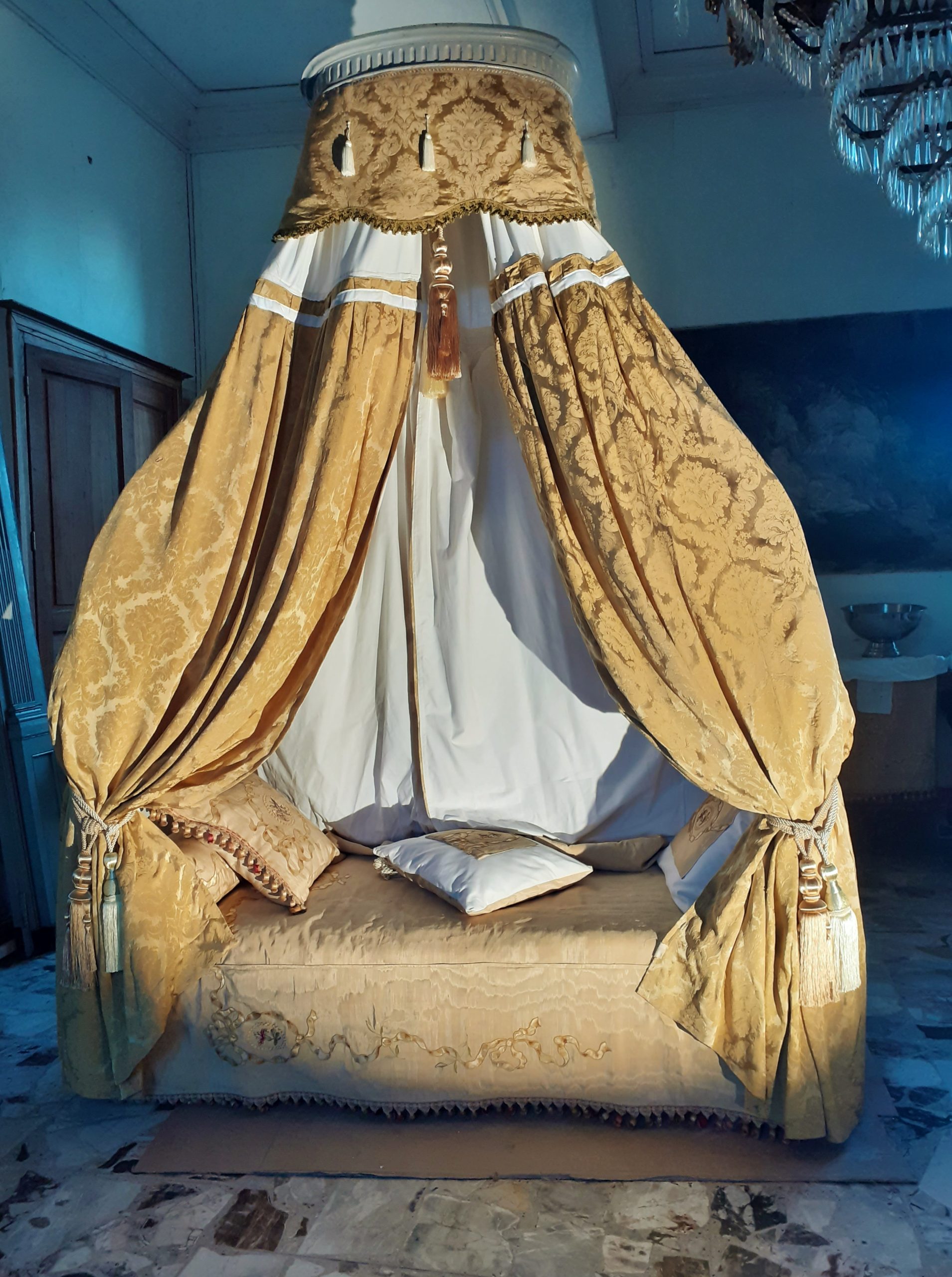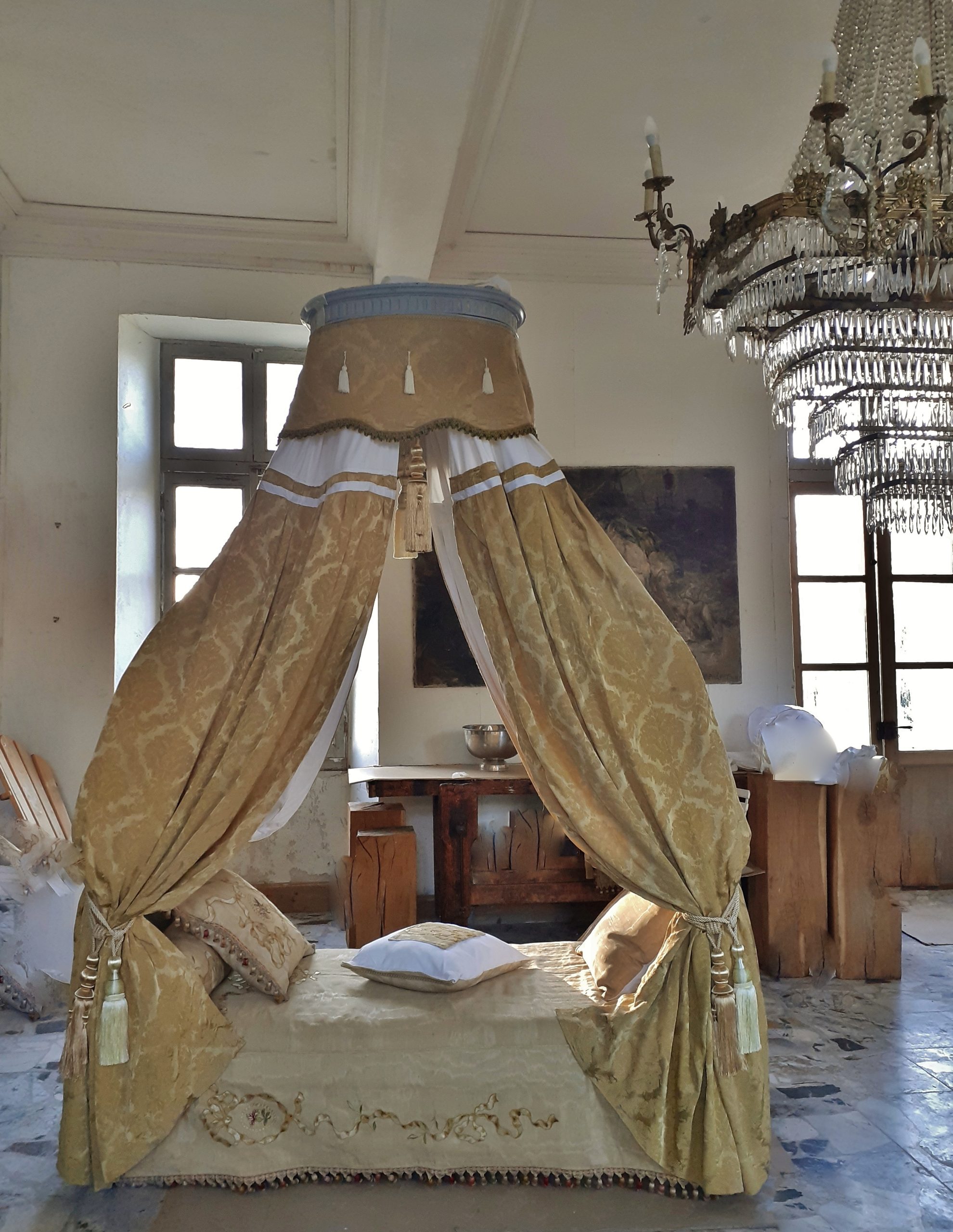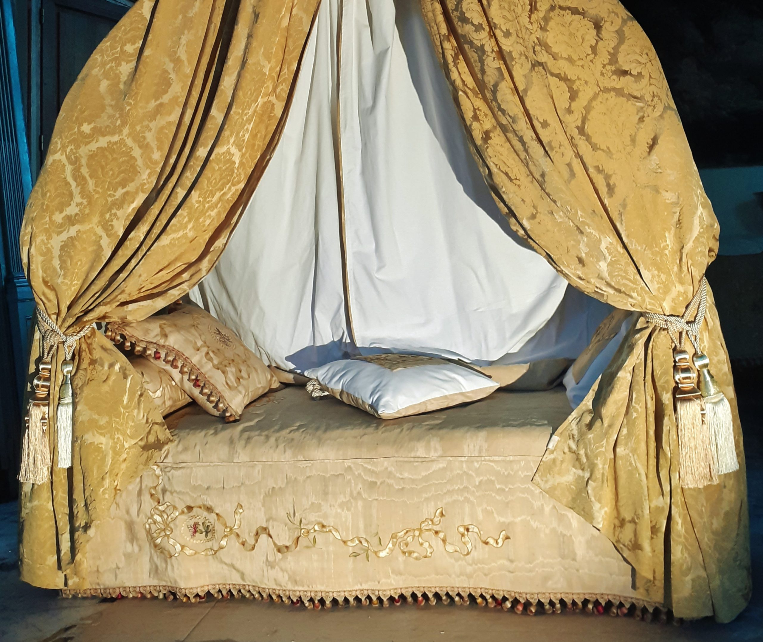 Ciel de lit avec âme en bois cannelée et garniture de coton gansé – Double embrasse à chaque montant – Trois coussins avec incrustation de damas moiré, idem pour l’ édredon –