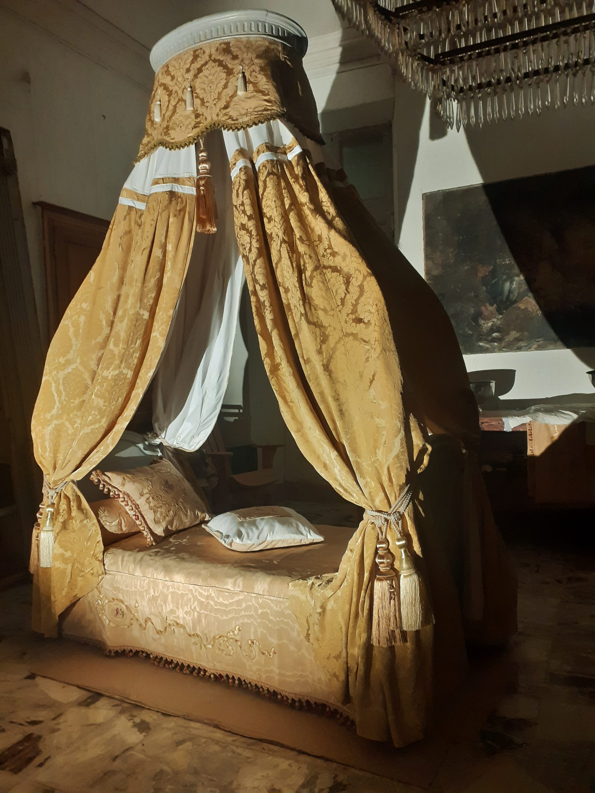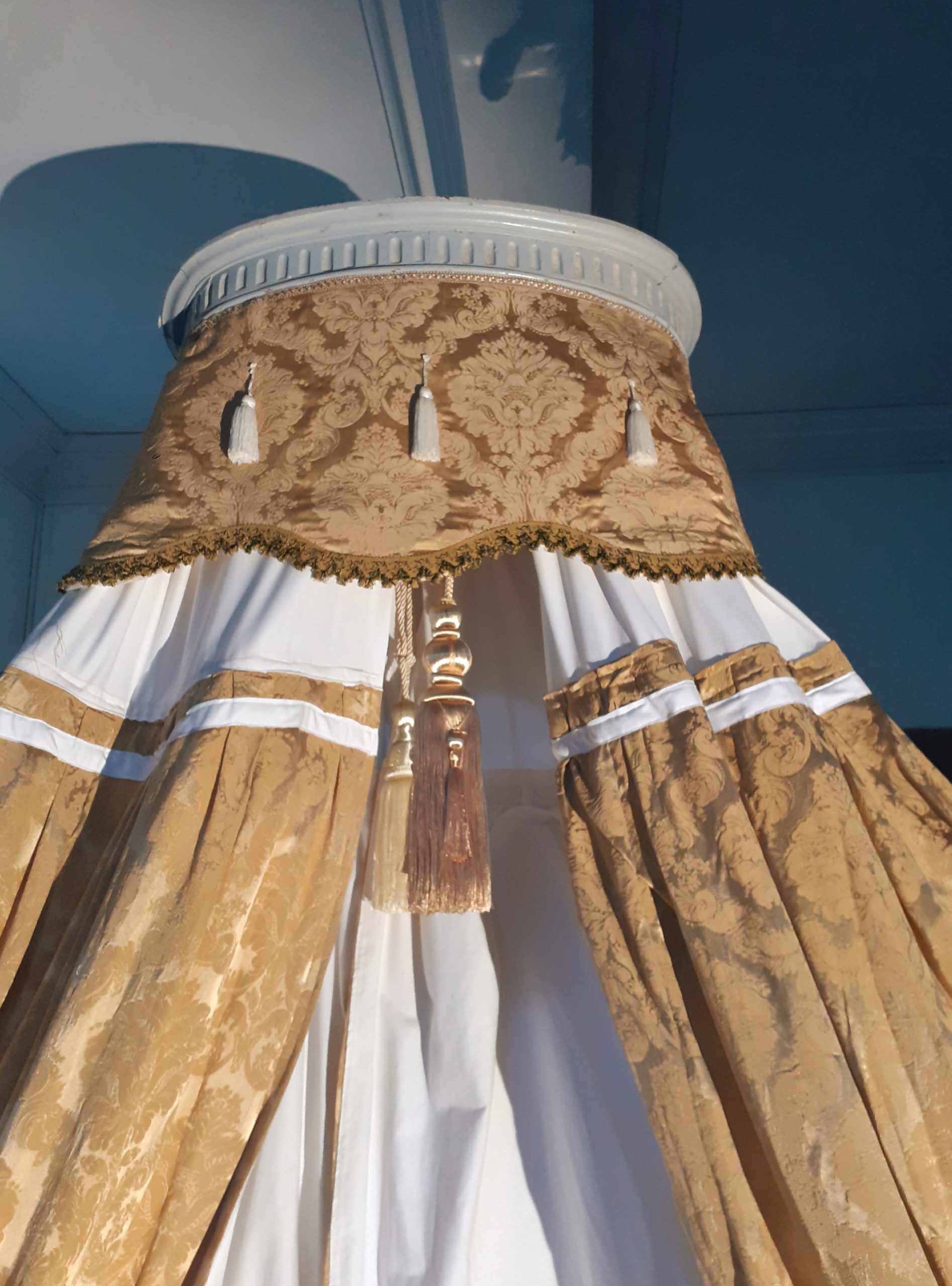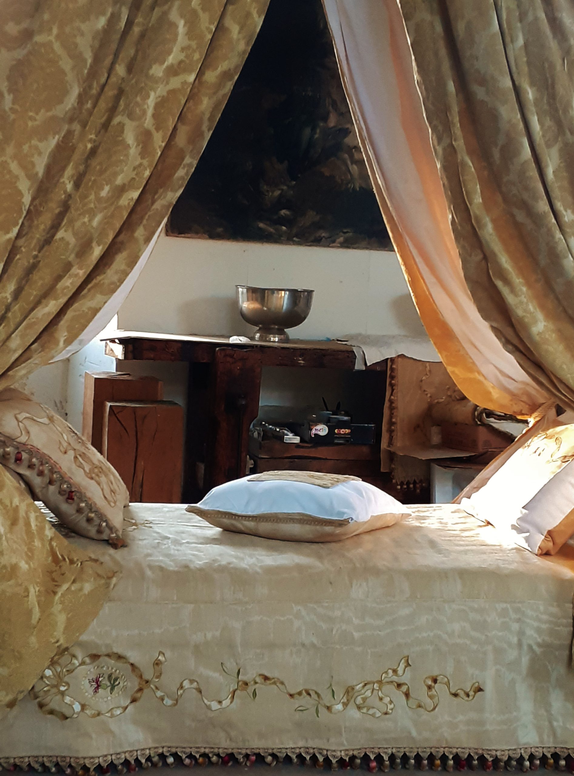 Ciel de lit avec âme en bois cannelée et garniture de coton gansé – Double embrasse à chaque montant – Trois coussins avec incrustation de damas moiré, idem pour l’ édredon –