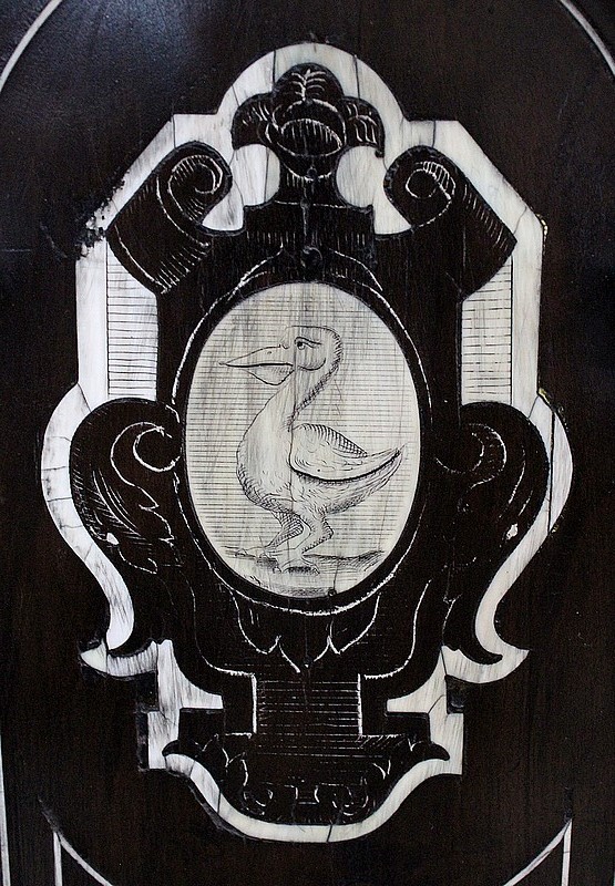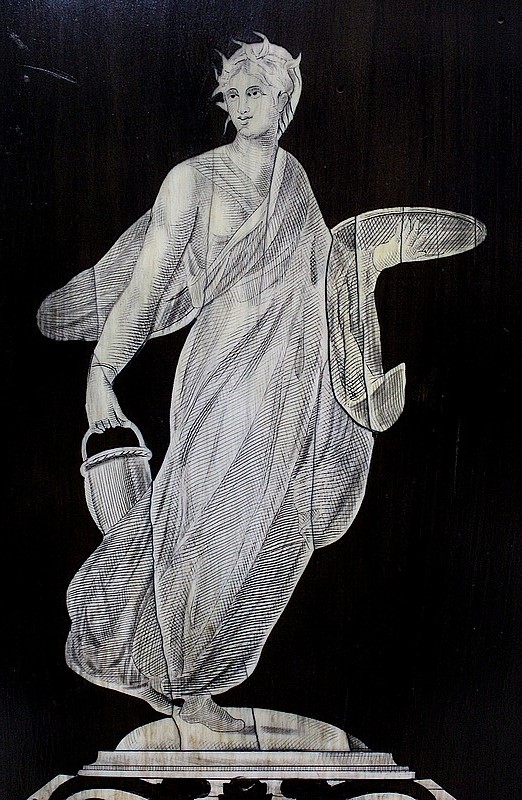 On retrouve, en plus grand nombre, des Décors similaires et autres Arabesques sur le Dosseret aux contours découpés de ce meuble. Cet élément supérieur est pourvu de petites Corniches ornementales, et de deux tablettes posées sur consoles pleines. On retiendra surtout la finesse des personnages ainsi que du Pélican présents sur ce Dosseret. Ces Marqueteries, qui semblent inspirées de l’Art Italien des années 1850, sont le résultat d’un travail minutieux et de Qualité.