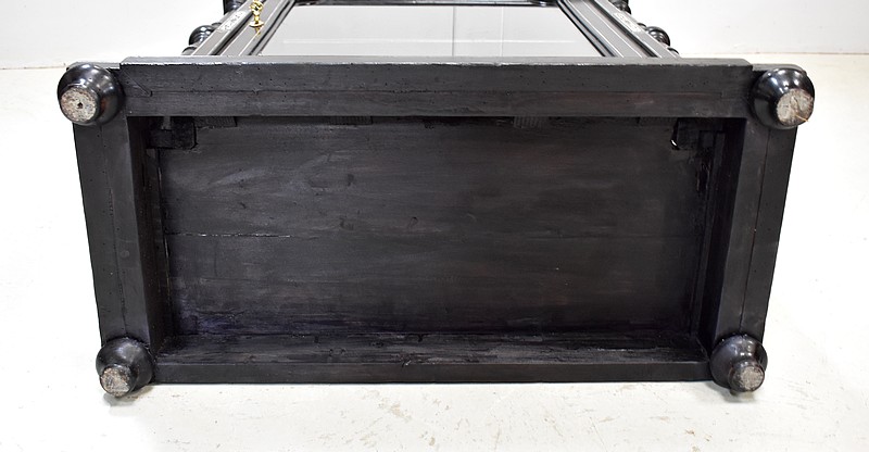 Sa partie basse ouvre par une porte vitrée, avec encadrement mouluré et angles arrondis. Elle révèle un espace d’exposition garni d’une étagère de 34.5 cm, posée sur tasseaux fixes. Ce vantail est doté d’un verrou en état de fonctionnement et de sa clé. Les côtés de cet élément inférieur sont également vitrés, et ils présentent les mêmes entourages que ceux décrits précédemment. Les angles avants de ce meuble sont en retrait, laissant place à deux colonnes tournées, enjolivées de Bagues en Ivoire hautes et basses. Outre leur aspect esthétique, ces montants servent également de supports à la ceinture de cette Vitrine, et à son plateau aux bords saillants. Cette partie basse est agrémentée d’incrustations d’Ivoire, disposées en filets et Rinceaux.