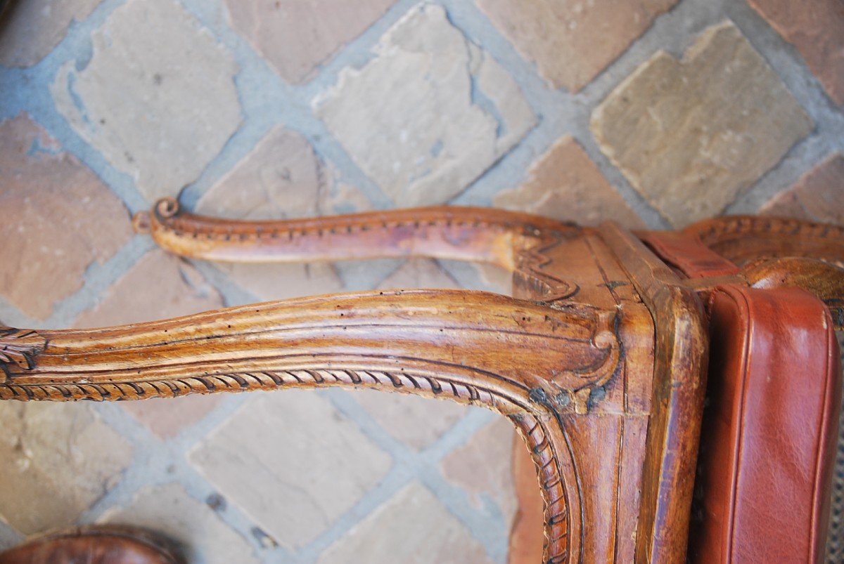 Paire d élégants fauteuils à dossier plat en bois naturel de noyer mouluré et sculpté à motifs de fleurs et d une grenade éclatée sur la traverse basse , les pieds cambrés , joli travail de denticule sur le pourtour du dossier et des bras des sièges