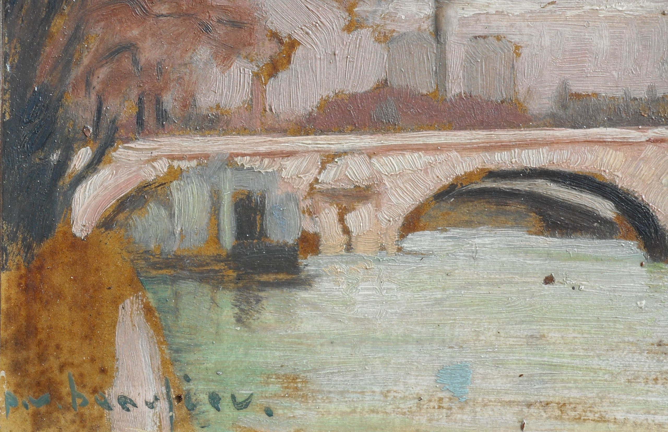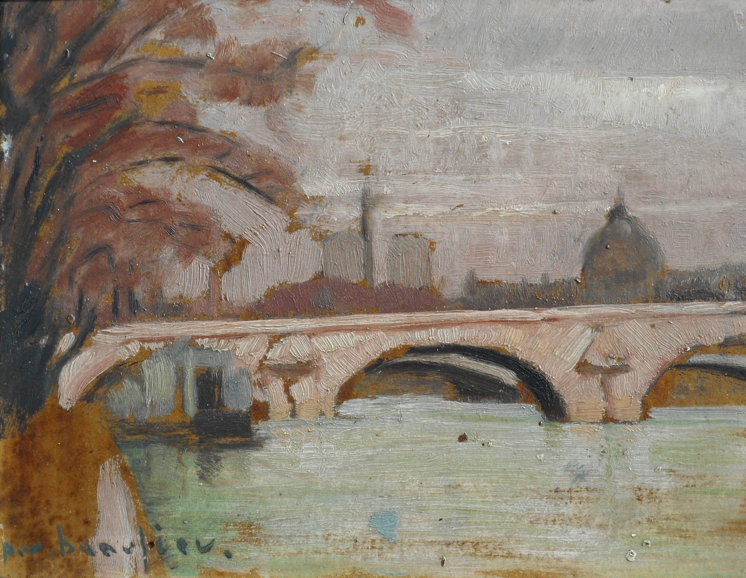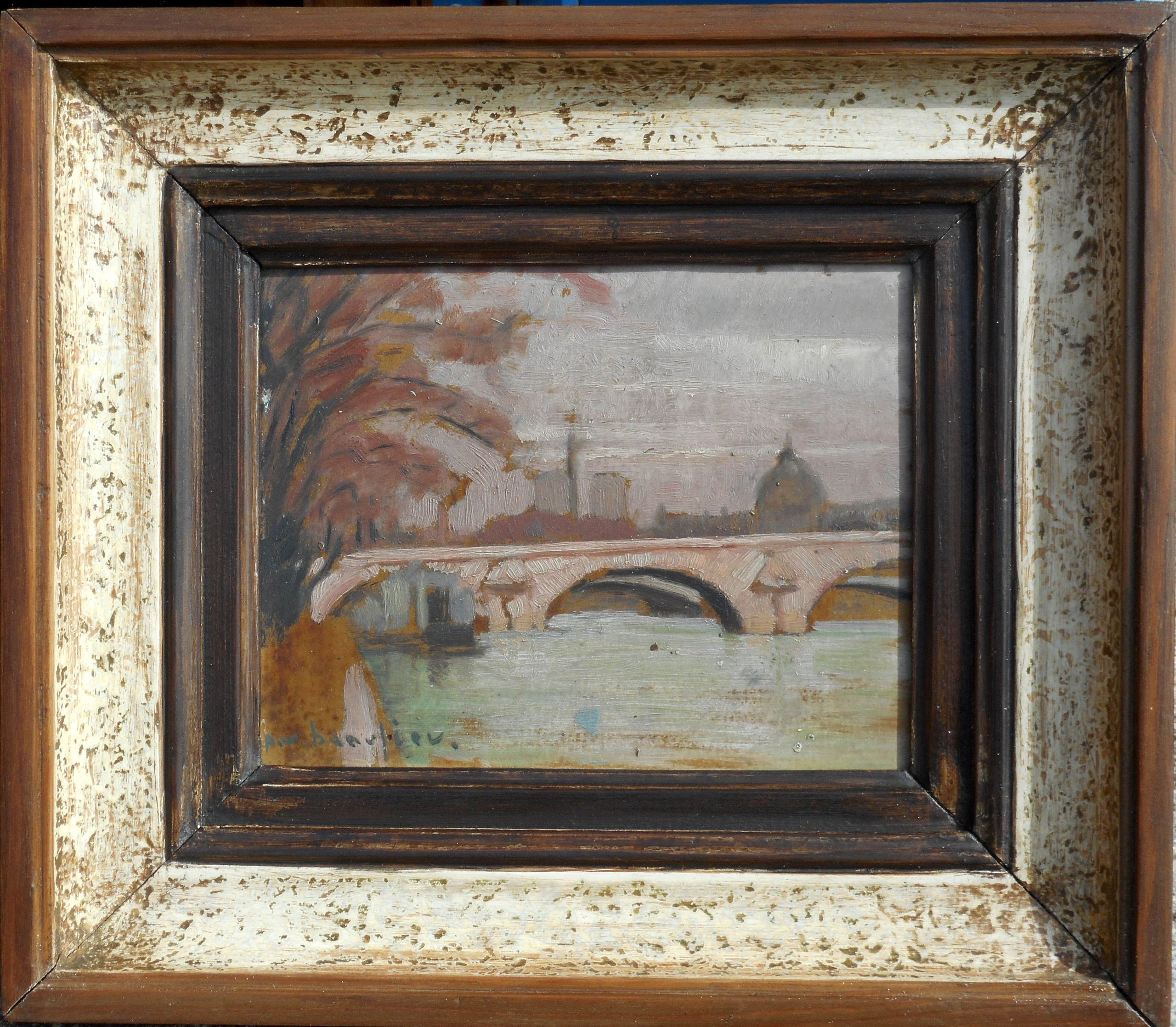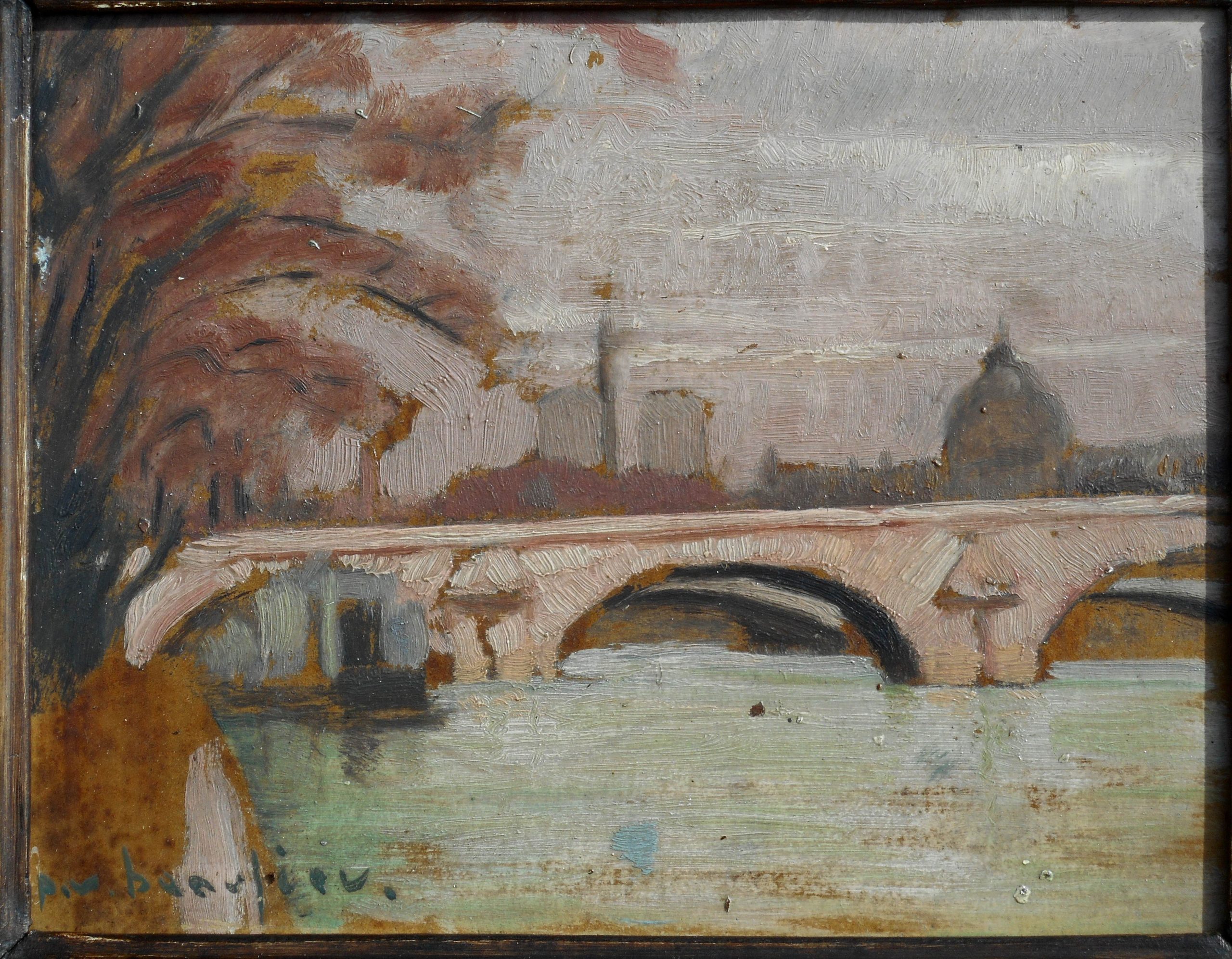 Superbe et rare huile sur panneau bois 14 x 18 cm ( 26 x 36 cm encadrée) signée Paul-Vanier BEAULIEU (1910- 1996) , contresignée au dos et située PARIS – le pont royal – mars 1940)