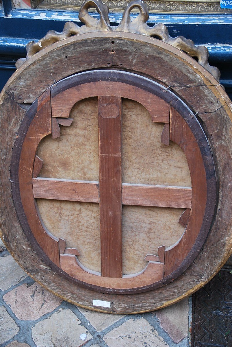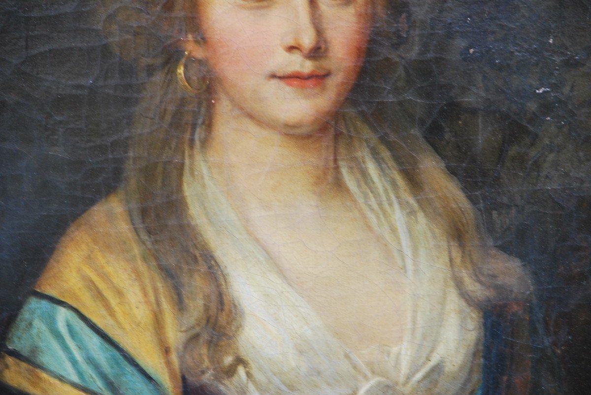 Elégant portrait de jeune femme sur sa toile de forme ovale , elle est représentée à la mode de la fin du XVIII , les cheveux retenus par un rubans rouge , portant des créoles en or , une étole de couleur sur les épaules , la tolie est présentée dans son vernis ancien jauni , dans un « beau' » cadre de style Louis XVI à perles et ruban , ‘accident au ruban , (^possibilité de le restaurer en notre atelier )