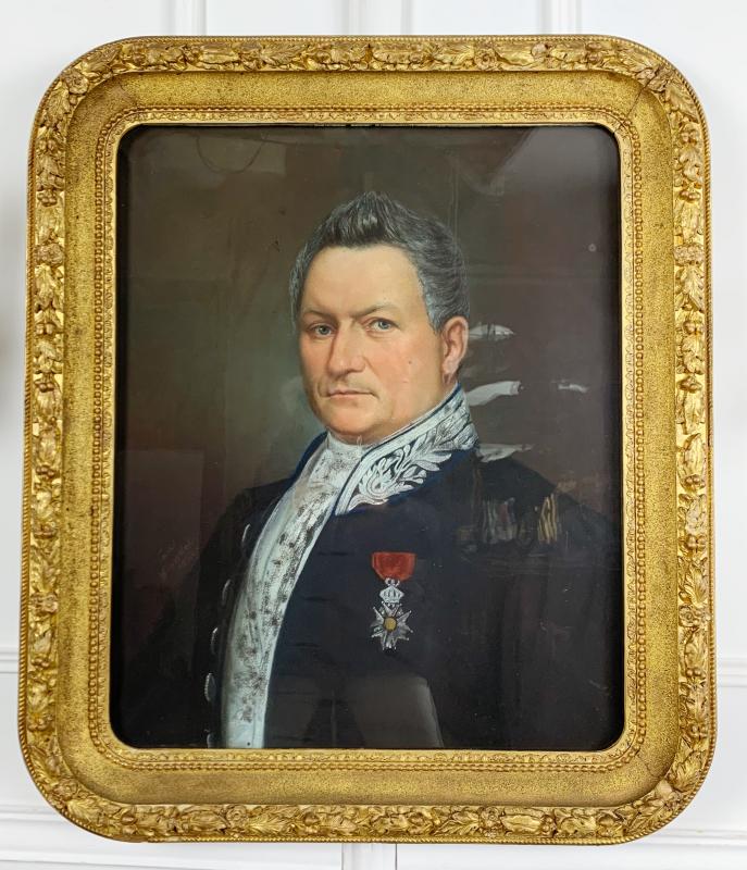 École française du XIXe – Pastel. Portrait d’homme à la légion d’honneur dans un cadre en bois doré à angles arrondis.