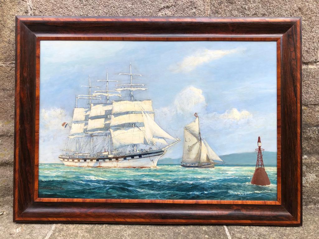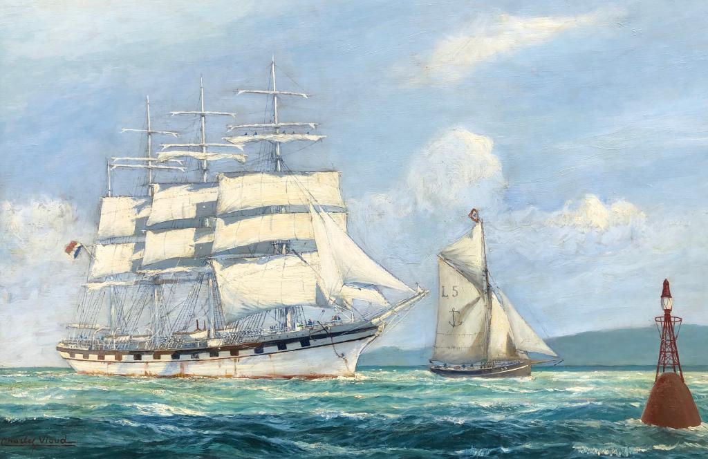 Quatre mâts barque et son bateau pilote à la balise par Charles Viaud