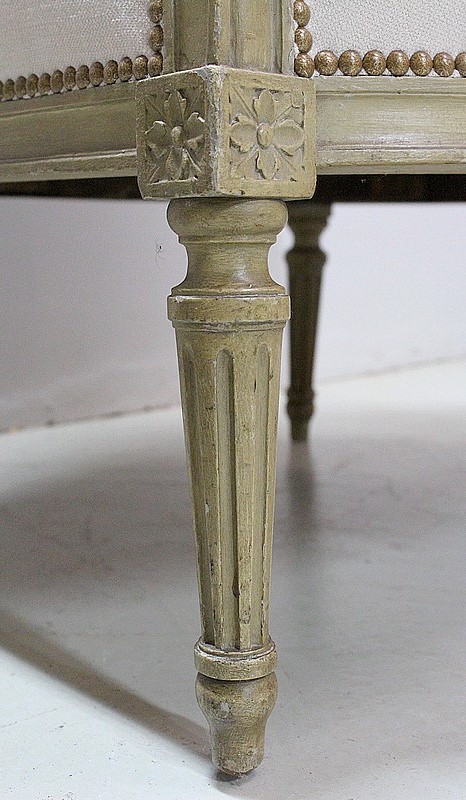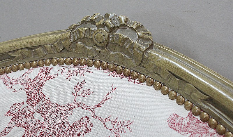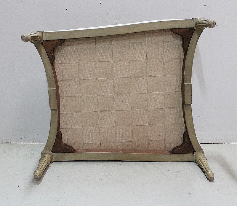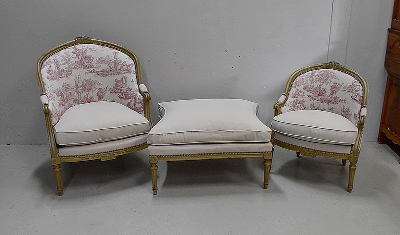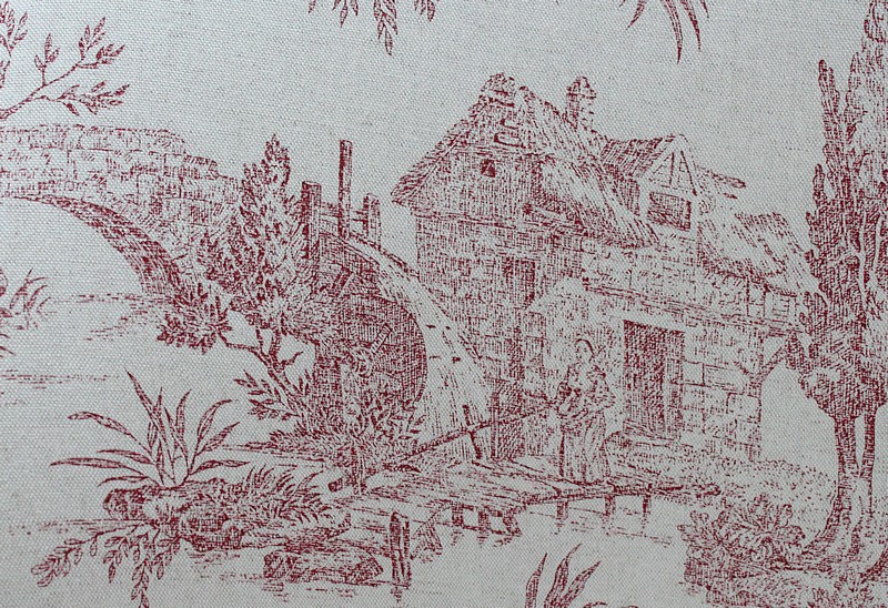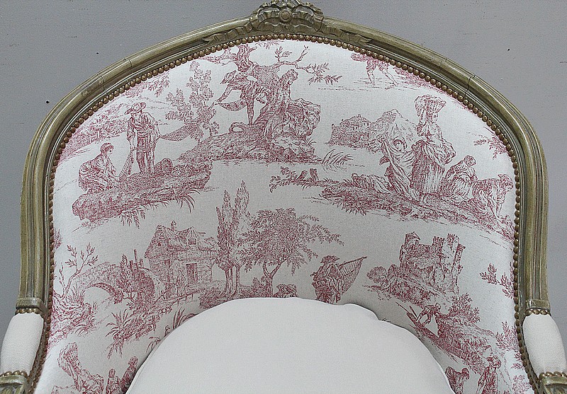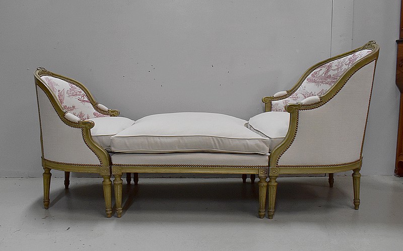 Cette cousine du Canapé a vu ses Tapisseries entièrement refaites, avec soin et à l’ancienne, avec finitions à Clous Vieillis, dans les règles de l’Art Décoratif de son époque. Ainsi l’intérieur des dossiers est recouvert d’une très jolie Toile de Jouy. Elle est imprimée de Scènes de Vie courantes pour ce siècle, autour de l’eau, telles que des tableaux d’Hommes à la Pêche ou de Femmes à la lessive … Un tissu uni « Paris-Texas Casamance » a été utilisé pour la réfection des extérieurs de cette Duchesse Brisée et pour la confection de ses trois épais coussins amovibles généreusement garnis de Plumes. A Finitions Double Passepoil pour souligner leur structure, on notera qu’ils sont déhoussables, à l’exception de celui du Centre. Les tissus utilisés sont constitués de Lin et majoritairement de Coton.