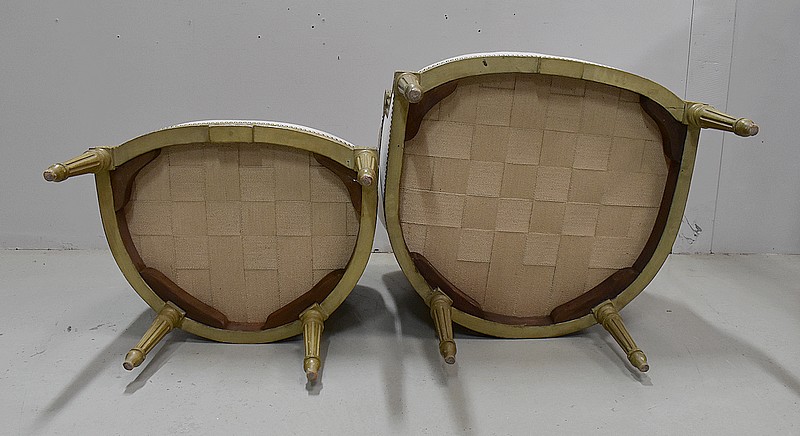 Duchesse Brisée de style Louis XVI, à ossature en Bois laqué et réchampi d’une peinture couleur Crème d’origine.
