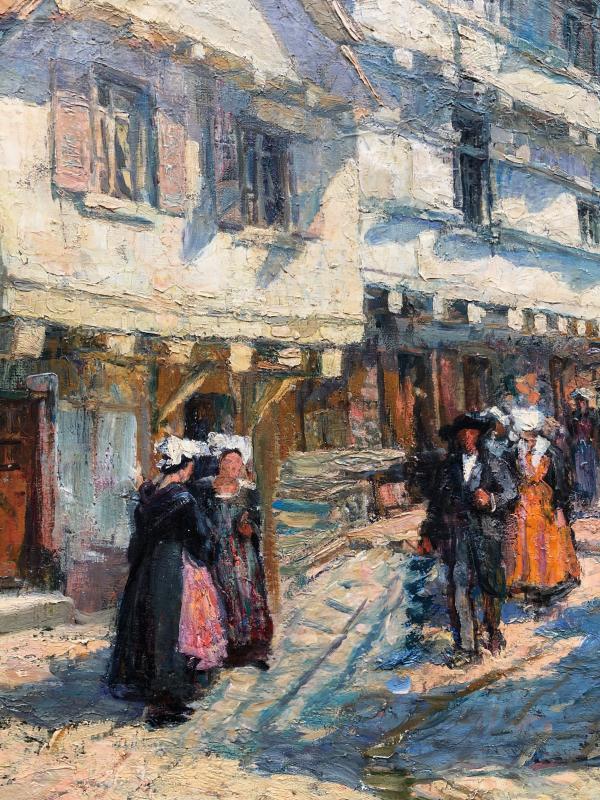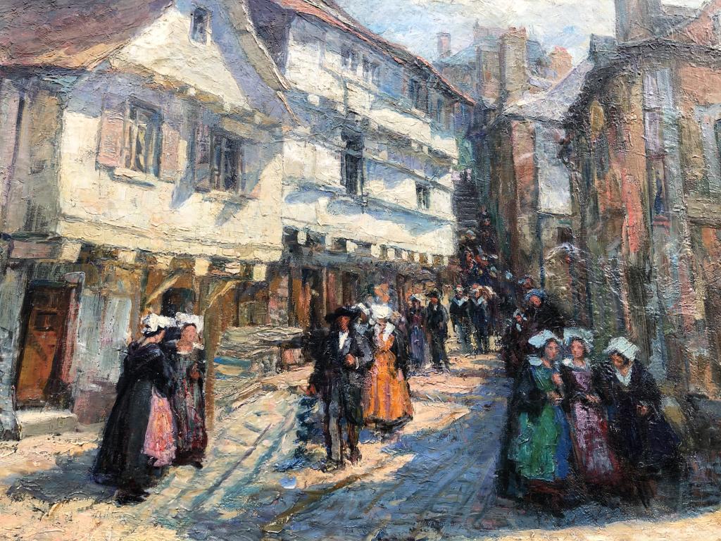 On appréciera la lumière qui éclaire les façades et le sens des couleurs de cet artiste qui a peint également des scènes à Douarnenez. Ici nous sommes sûrement un dimanche matin après la messe, ce qui nous montre toute la ferveur religieuse des bretons de cette époque.