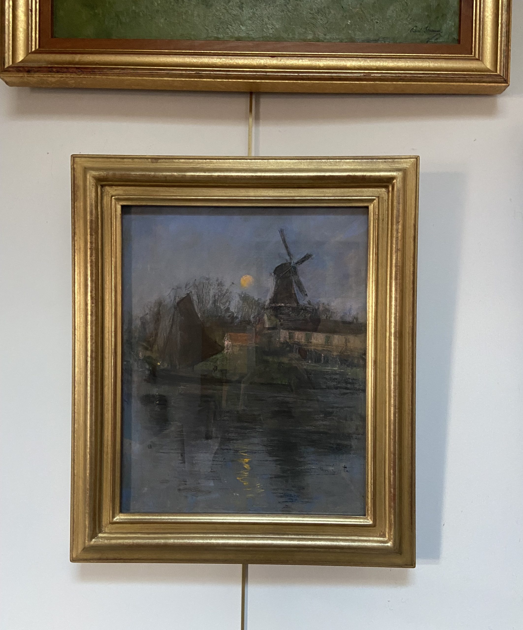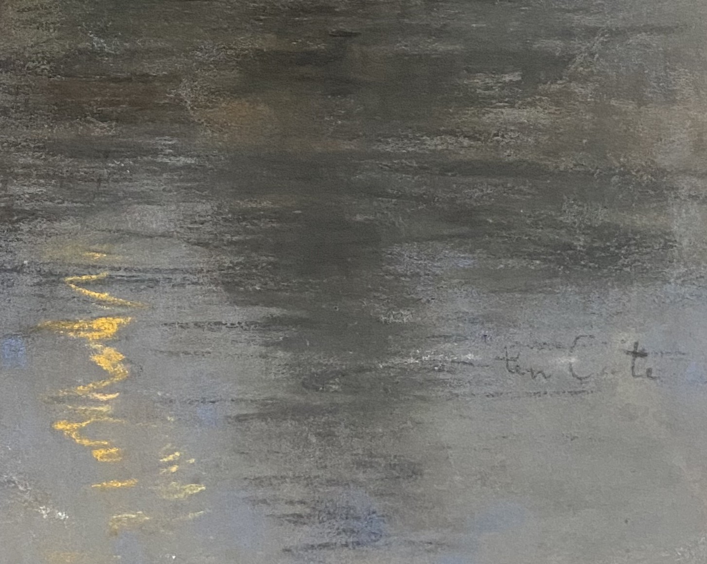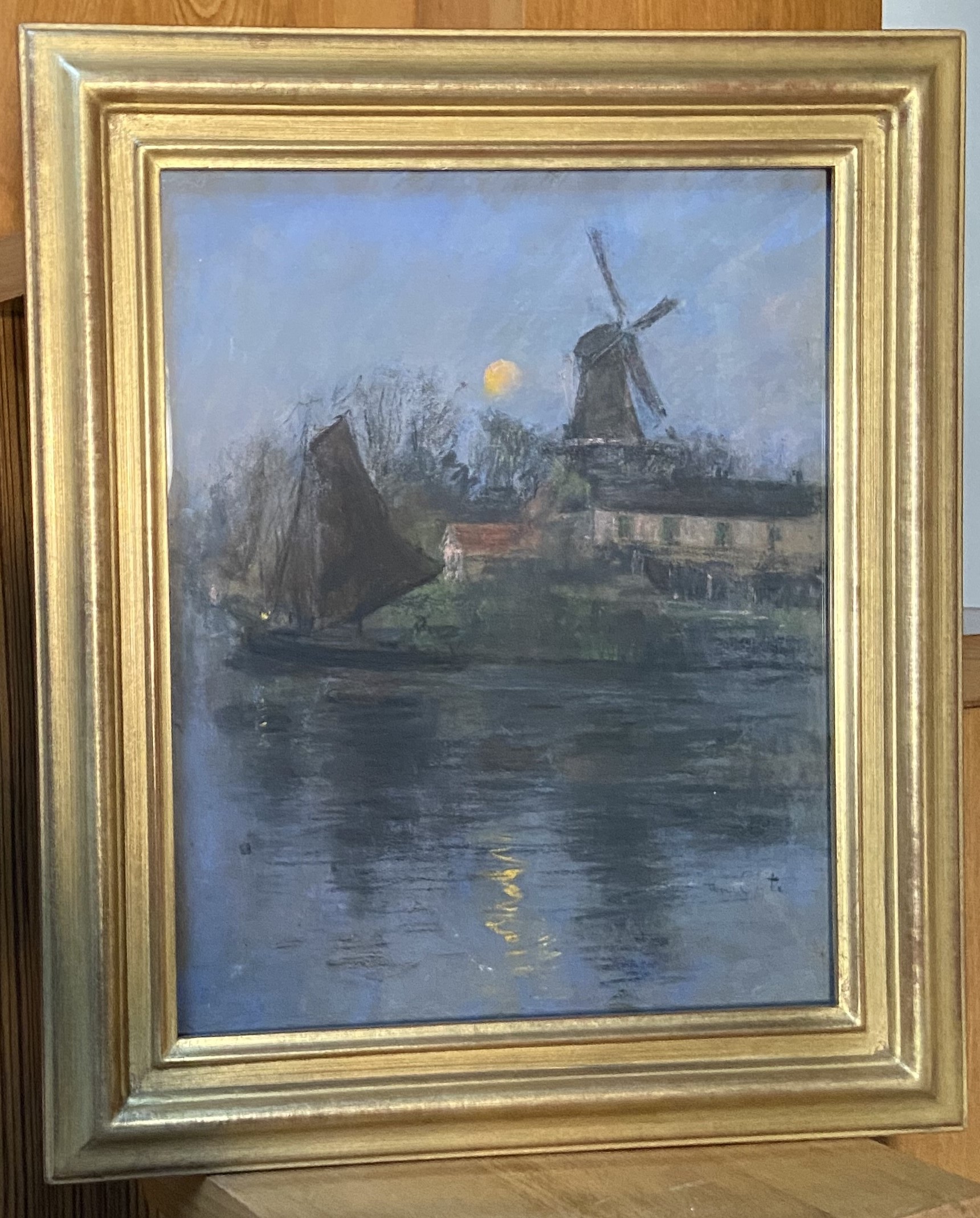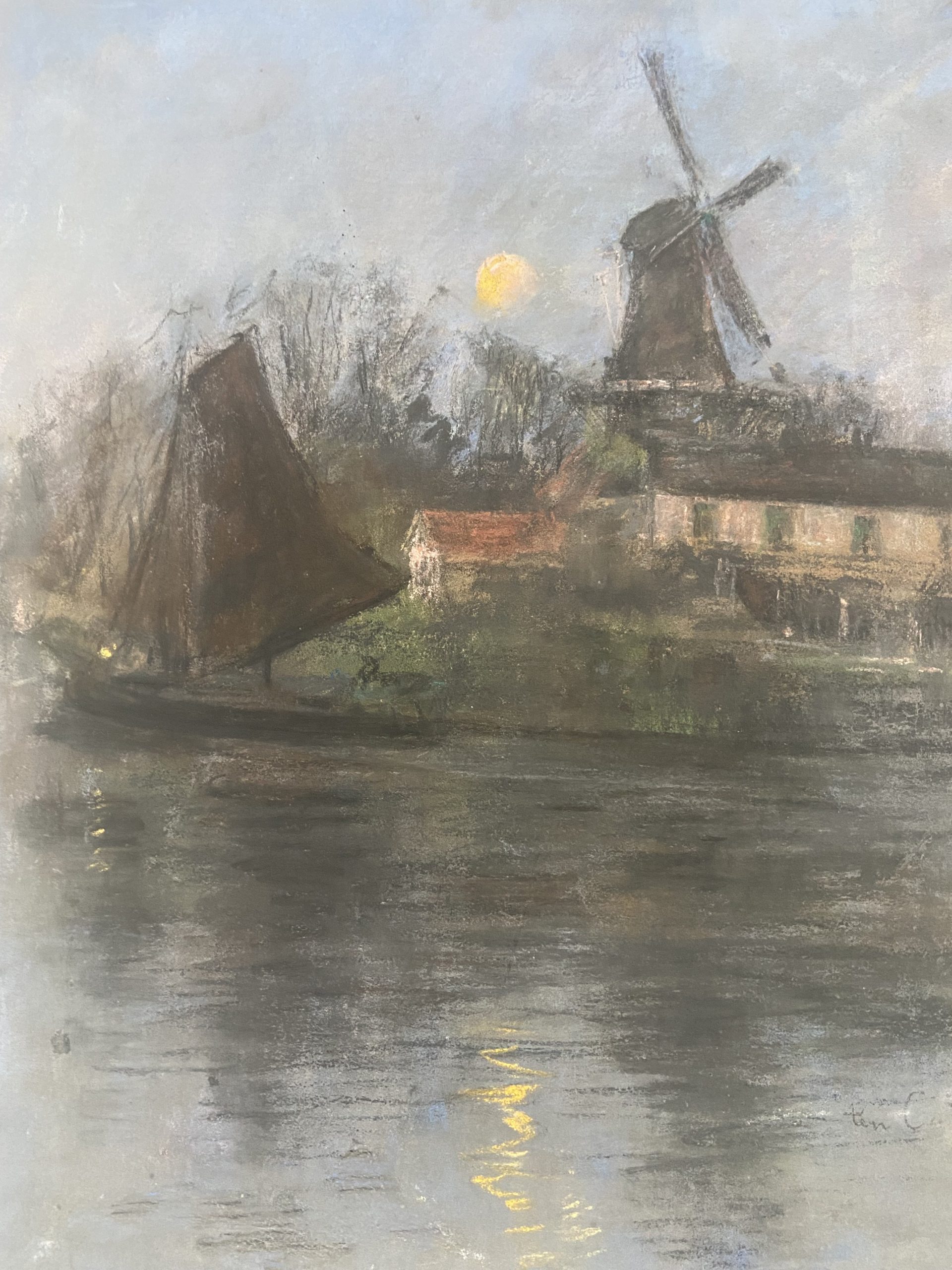 Ce paysage représente les environs de la ville de Dordrecht, célèbre pour ses moulins à vent. Bien que Ten Cate ait vécu à Paris pendant sa vie d’artiste et y ait fait carrière, il est évident qu’il est resté attaché à son pays natal. Tout au long de sa carrière, il a particulièrement aimé représenter les rivières et les cours d’eau ainsi que les jeux de reflets qu’ils offrent ; le reflet de la lune dans l’eau du canal est un très bel exemple de son travail au pastel, typiquement impressionniste.