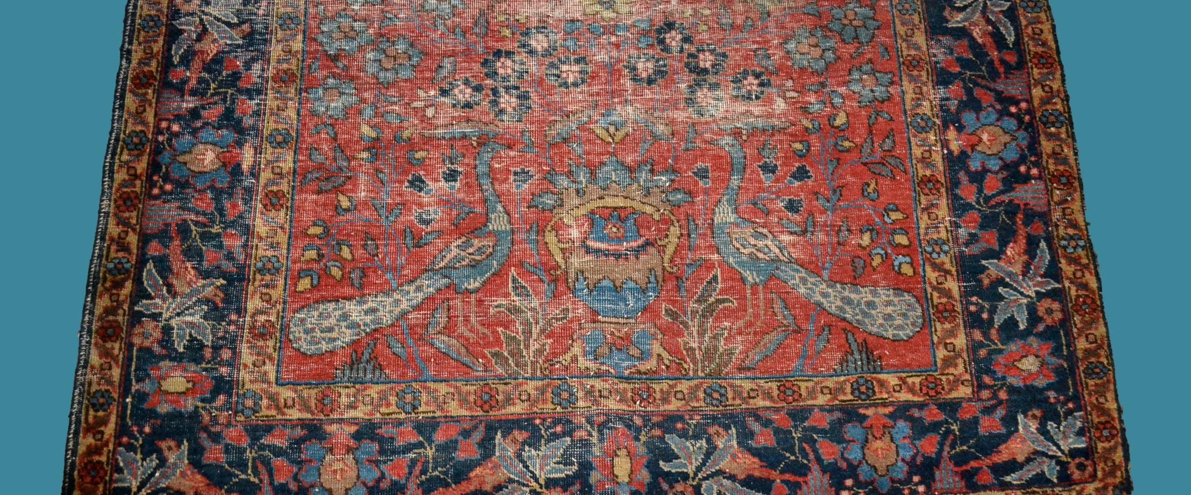Deux larges paons bleu que l’on retrouve souvent dans la culture Perse sont posés à la base du tapis de chaque côté du vase.